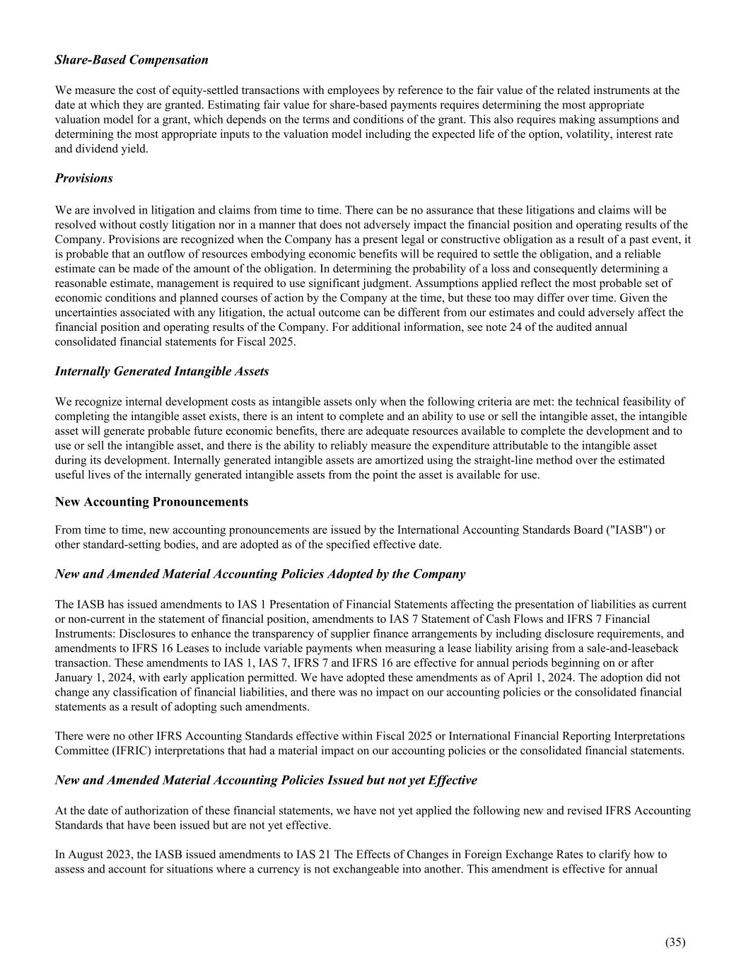 Share-Based Compensation We measure the cost of equity-settled transactions with employees by reference to the fair value of the related instruments at the date at which they are granted. Estimating fair value for share-based payments requires determining the most appropriate valuation model for a grant, which depends on the terms and conditions of the grant. This also requires making assumptions and determining the most appropriate inputs to the valuation model including the expected life of the option, volatility, interest rate and dividend yield. Provisions We are involved in litigation and claims from time to time. There can be no assurance that these litigations and claims will be resolved without costly litigation nor in a manner that does not adversely impact the financial position and operating results of the Company. Provisions are recognized when the Company has a present legal or constructive obligation as a result of a past event, it is probable that an outflow of resources embodying economic benefits will be required to settle the obligation, and a reliable estimate can be made of the amount of the obligation. In determining the probability of a loss and consequently determining a reasonable estimate, management is required to use significant judgment. Assumptions applied reflect the most probable set of economic conditions and planned courses of action by the Company at the time, but these too may differ over time. Given the uncertainties associated with any litigation, the actual outcome can be different from our estimates and could adversely affect the financial position and operating results of the Company. For additional information, see note 24 of the audited annual consolidated financial statements for Fiscal 2025. Internally Generated Intangible Assets We recognize internal development costs as intangible assets only when the following criteria are met: the technical feasibility of completing the intangible asset exists, there is an intent to complete and an ability to use or sell the intangible asset, the intangible asset will generate probable future economic benefits, there are adequate resources available to complete the development and to use or sell the intangible asset, and there is the ability to reliably measure the expenditure attributable to the intangible asset during its development. Internally generated intangible assets are amortized using the straight-line method over the estimated useful lives of the internally generated intangible assets from the point the asset is available for use. New Accounting Pronouncements From time to time, new accounting pronouncements are issued by the International Accounting Standards Board ("IASB") or other standard-setting bodies, and are adopted as of the specified effective date. New and Amended Material Accounting Policies Adopted by the Company The IASB has issued amendments to IAS 1 Presentation of Financial Statements affecting the presentation of liabilities as current or non-current in the statement of financial position, amendments to IAS 7 Statement of Cash Flows and IFRS 7 Financial Instruments: Disclosures to enhance the transparency of supplier finance arrangements by including disclosure requirements, and amendments to IFRS 16 Leases to include variable payments when measuring a lease liability arising from a sale-and-leaseback transaction. These amendments to IAS 1, IAS 7, IFRS 7 and IFRS 16 are effective for annual periods beginning on or after January 1, 2024, with early application permitted. We have adopted these amendments as of April 1, 2024. The adoption did not change any classification of financial liabilities, and there was no impact on our accounting policies or the consolidated financial statements as a result of adopting such amendments. There were no other IFRS Accounting Standards effective within Fiscal 2025 or International Financial Reporting Interpretations Committee (IFRIC) interpretations that had a material impact on our accounting policies or the consolidated financial statements. New and Amended Material Accounting Policies Issued but not yet Effective At the date of authorization of these financial statements, we have not yet applied the following new and revised IFRS Accounting Standards that have been issued but are not yet effective. In August 2023, the IASB issued amendments to IAS 21 The Effects of Changes in Foreign Exchange Rates to clarify how to assess and account for situations where a currency is not exchangeable into another. This amendment is effective for annual (35)