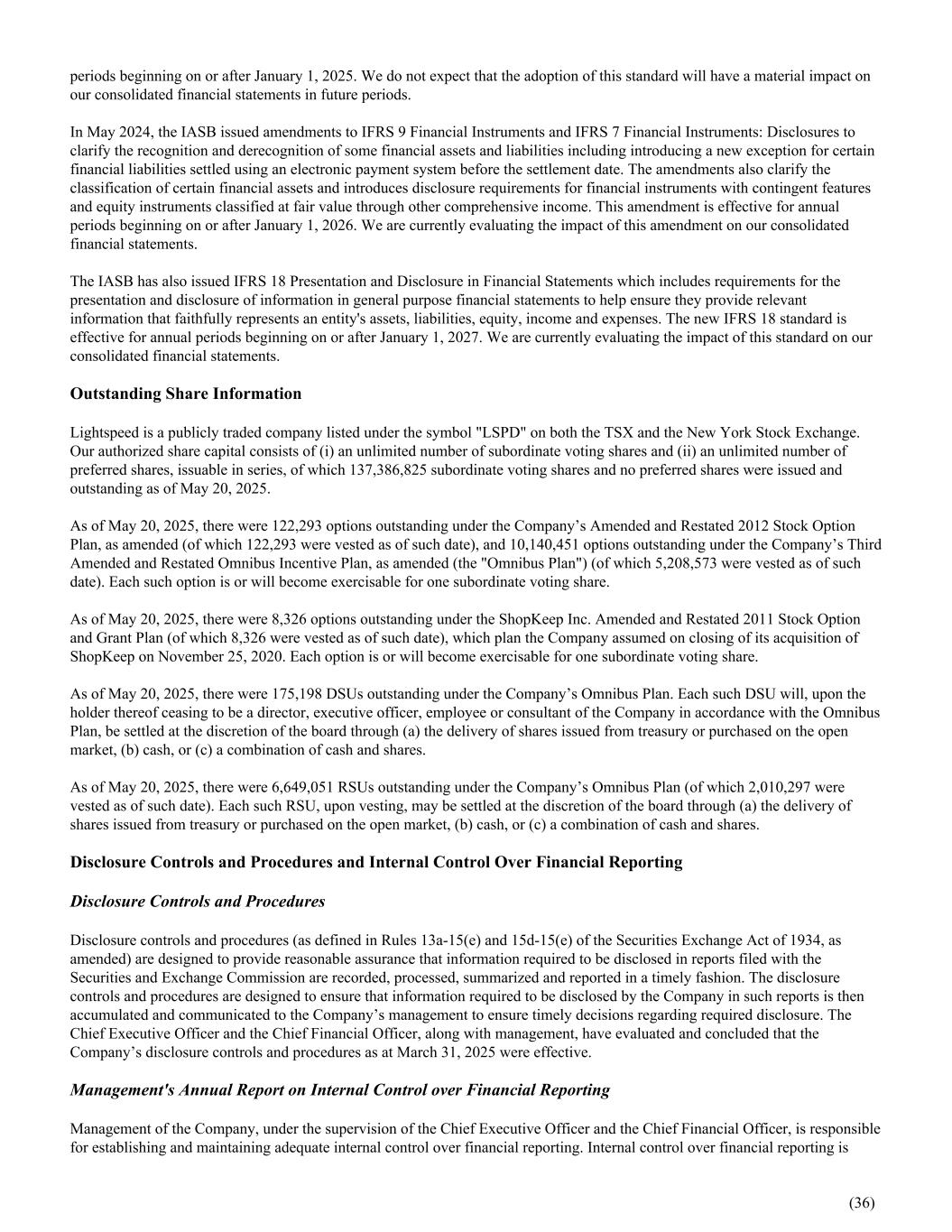 periods beginning on or after January 1, 2025. We do not expect that the adoption of this standard will have a material impact on our consolidated financial statements in future periods. In May 2024, the IASB issued amendments to IFRS 9 Financial Instruments and IFRS 7 Financial Instruments: Disclosures to clarify the recognition and derecognition of some financial assets and liabilities including introducing a new exception for certain financial liabilities settled using an electronic payment system before the settlement date. The amendments also clarify the classification of certain financial assets and introduces disclosure requirements for financial instruments with contingent features and equity instruments classified at fair value through other comprehensive income. This amendment is effective for annual periods beginning on or after January 1, 2026. We are currently evaluating the impact of this amendment on our consolidated financial statements. The IASB has also issued IFRS 18 Presentation and Disclosure in Financial Statements which includes requirements for the presentation and disclosure of information in general purpose financial statements to help ensure they provide relevant information that faithfully represents an entity's assets, liabilities, equity, income and expenses. The new IFRS 18 standard is effective for annual periods beginning on or after January 1, 2027. We are currently evaluating the impact of this standard on our consolidated financial statements. Outstanding Share Information Lightspeed is a publicly traded company listed under the symbol "LSPD" on both the TSX and the New York Stock Exchange. Our authorized share capital consists of (i) an unlimited number of subordinate voting shares and (ii) an unlimited number of preferred shares, issuable in series, of which 137,386,825 subordinate voting shares and no preferred shares were issued and outstanding as of May 20, 2025. As of May 20, 2025, there were 122,293 options outstanding under the Company’s Amended and Restated 2012 Stock Option Plan, as amended (of which 122,293 were vested as of such date), and 10,140,451 options outstanding under the Company’s Third Amended and Restated Omnibus Incentive Plan, as amended (the "Omnibus Plan") (of which 5,208,573 were vested as of such date). Each such option is or will become exercisable for one subordinate voting share. As of May 20, 2025, there were 8,326 options outstanding under the ShopKeep Inc. Amended and Restated 2011 Stock Option and Grant Plan (of which 8,326 were vested as of such date), which plan the Company assumed on closing of its acquisition of ShopKeep on November 25, 2020. Each option is or will become exercisable for one subordinate voting share. As of May 20, 2025, there were 175,198 DSUs outstanding under the Company’s Omnibus Plan. Each such DSU will, upon the holder thereof ceasing to be a director, executive officer, employee or consultant of the Company in accordance with the Omnibus Plan, be settled at the discretion of the board through (a) the delivery of shares issued from treasury or purchased on the open market, (b) cash, or (c) a combination of cash and shares. As of May 20, 2025, there were 6,649,051 RSUs outstanding under the Company’s Omnibus Plan (of which 2,010,297 were vested as of such date). Each such RSU, upon vesting, may be settled at the discretion of the board through (a) the delivery of shares issued from treasury or purchased on the open market, (b) cash, or (c) a combination of cash and shares. Disclosure Controls and Procedures and Internal Control Over Financial Reporting Disclosure Controls and Procedures Disclosure controls and procedures (as defined in Rules 13a-15(e) and 15d-15(e) of the Securities Exchange Act of 1934, as amended) are designed to provide reasonable assurance that information required to be disclosed in reports filed with the Securities and Exchange Commission are recorded, processed, summarized and reported in a timely fashion. The disclosure controls and procedures are designed to ensure that information required to be disclosed by the Company in such reports is then accumulated and communicated to the Company’s management to ensure timely decisions regarding required disclosure. The Chief Executive Officer and the Chief Financial Officer, along with management, have evaluated and concluded that the Company’s disclosure controls and procedures as at March 31, 2025 were effective. Management's Annual Report on Internal Control over Financial Reporting Management of the Company, under the supervision of the Chief Executive Officer and the Chief Financial Officer, is responsible for establishing and maintaining adequate internal control over financial reporting. Internal control over financial reporting is (36)
