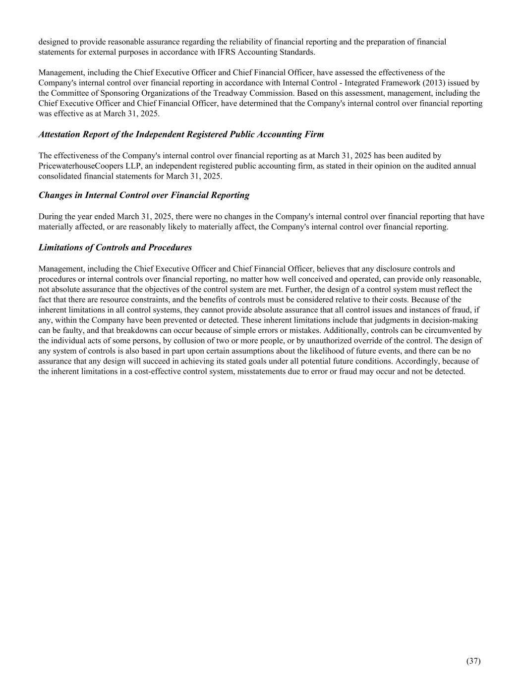designed to provide reasonable assurance regarding the reliability of financial reporting and the preparation of financial statements for external purposes in accordance with IFRS Accounting Standards. Management, including the Chief Executive Officer and Chief Financial Officer, have assessed the effectiveness of the Company's internal control over financial reporting in accordance with Internal Control - Integrated Framework (2013) issued by the Committee of Sponsoring Organizations of the Treadway Commission. Based on this assessment, management, including the Chief Executive Officer and Chief Financial Officer, have determined that the Company's internal control over financial reporting was effective as at March 31, 2025. Attestation Report of the Independent Registered Public Accounting Firm The effectiveness of the Company's internal control over financial reporting as at March 31, 2025 has been audited by PricewaterhouseCoopers LLP, an independent registered public accounting firm, as stated in their opinion on the audited annual consolidated financial statements for March 31, 2025. Changes in Internal Control over Financial Reporting During the year ended March 31, 2025, there were no changes in the Company's internal control over financial reporting that have materially affected, or are reasonably likely to materially affect, the Company's internal control over financial reporting. Limitations of Controls and Procedures Management, including the Chief Executive Officer and Chief Financial Officer, believes that any disclosure controls and procedures or internal controls over financial reporting, no matter how well conceived and operated, can provide only reasonable, not absolute assurance that the objectives of the control system are met. Further, the design of a control system must reflect the fact that there are resource constraints, and the benefits of controls must be considered relative to their costs. Because of the inherent limitations in all control systems, they cannot provide absolute assurance that all control issues and instances of fraud, if any, within the Company have been prevented or detected. These inherent limitations include that judgments in decision-making can be faulty, and that breakdowns can occur because of simple errors or mistakes. Additionally, controls can be circumvented by the individual acts of some persons, by collusion of two or more people, or by unauthorized override of the control. The design of any system of controls is also based in part upon certain assumptions about the likelihood of future events, and there can be no assurance that any design will succeed in achieving its stated goals under all potential future conditions. Accordingly, because of the inherent limitations in a cost-effective control system, misstatements due to error or fraud may occur and not be detected. (37)