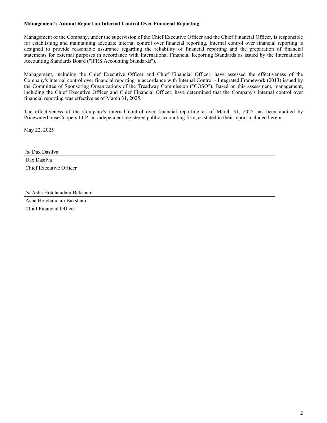 Management's Annual Report on Internal Control Over Financial Reporting Management of the Company, under the supervision of the Chief Executive Officer and the Chief Financial Officer, is responsible for establishing and maintaining adequate internal control over financial reporting. Internal control over financial reporting is designed to provide reasonable assurance regarding the reliability of financial reporting and the preparation of financial statements for external purposes in accordance with International Financial Reporting Standards as issued by the International Accounting Standards Board ("IFRS Accounting Standards"). Management, including the Chief Executive Officer and Chief Financial Officer, have assessed the effectiveness of the Company's internal control over financial reporting in accordance with Internal Control - Integrated Framework (2013) issued by the Committee of Sponsoring Organizations of the Treadway Commission ("COSO"). Based on this assessment, management, including the Chief Executive Officer and Chief Financial Officer, have determined that the Company's internal control over financial reporting was effective as of March 31, 2025. The effectiveness of the Company's internal control over financial reporting as of March 31, 2025 has been audited by PricewaterhouseCoopers LLP, an independent registered public accounting firm, as stated in their report included herein. May 22, 2025 /s/ Dax Dasilva Dax Dasilva Chief Executive Officer /s/ Asha Hotchandani Bakshani Asha Hotchandani Bakshani Chief Financial Officer 2