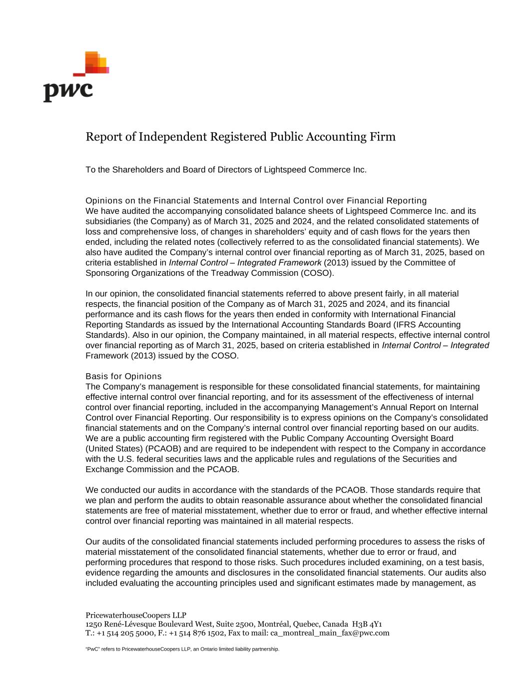 PricewaterhouseCoopers LLP 1250 René-Lévesque Boulevard West, Suite 2500, Montréal, Quebec, Canada H3B 4Y1 T.: +1 514 205 5000, F.: +1 514 876 1502, Fax to mail: ca_montreal_main_fax@pwc.com “PwC” refers to PricewaterhouseCoopers LLP, an Ontario limited liability partnership. Report of Independent Registered Public Accounting Firm To the Shareholders and Board of Directors of Lightspeed Commerce Inc. Opinions on the Financial Statements and Internal Control over Financial Reporting We have audited the accompanying consolidated balance sheets of Lightspeed Commerce Inc. and its subsidiaries (the Company) as of March 31, 2025 and 2024, and the related consolidated statements of loss and comprehensive loss, of changes in shareholders’ equity and of cash flows for the years then ended, including the related notes (collectively referred to as the consolidated financial statements). We also have audited the Company’s internal control over financial reporting as of March 31, 2025, based on criteria established in Internal Control ‒ Integrated Framework (2013) issued by the Committee of Sponsoring Organizations of the Treadway Commission (COSO). In our opinion, the consolidated financial statements referred to above present fairly, in all material respects, the financial position of the Company as of March 31, 2025 and 2024, and its financial performance and its cash flows for the years then ended in conformity with International Financial Reporting Standards as issued by the International Accounting Standards Board (IFRS Accounting Standards). Also in our opinion, the Company maintained, in all material respects, effective internal control over financial reporting as of March 31, 2025, based on criteria established in Internal Control ‒ Integrated Framework (2013) issued by the COSO. Basis for Opinions The Company’s management is responsible for these consolidated financial statements, for maintaining effective internal control over financial reporting, and for its assessment of the effectiveness of internal control over financial reporting, included in the accompanying Management’s Annual Report on Internal Control over Financial Reporting. Our responsibility is to express opinions on the Company’s consolidated financial statements and on the Company’s internal control over financial reporting based on our audits. We are a public accounting firm registered with the Public Company Accounting Oversight Board (United States) (PCAOB) and are required to be independent with respect to the Company in accordance with the U.S. federal securities laws and the applicable rules and regulations of the Securities and Exchange Commission and the PCAOB. We conducted our audits in accordance with the standards of the PCAOB. Those standards require that we plan and perform the audits to obtain reasonable assurance about whether the consolidated financial statements are free of material misstatement, whether due to error or fraud, and whether effective internal control over financial reporting was maintained in all material respects. Our audits of the consolidated financial statements included performing procedures to assess the risks of material misstatement of the consolidated financial statements, whether due to error or fraud, and performing procedures that respond to those risks. Such procedures included examining, on a test basis, evidence regarding the amounts and disclosures in the consolidated financial statements. Our audits also included evaluating the accounting principles used and significant estimates made by management, as