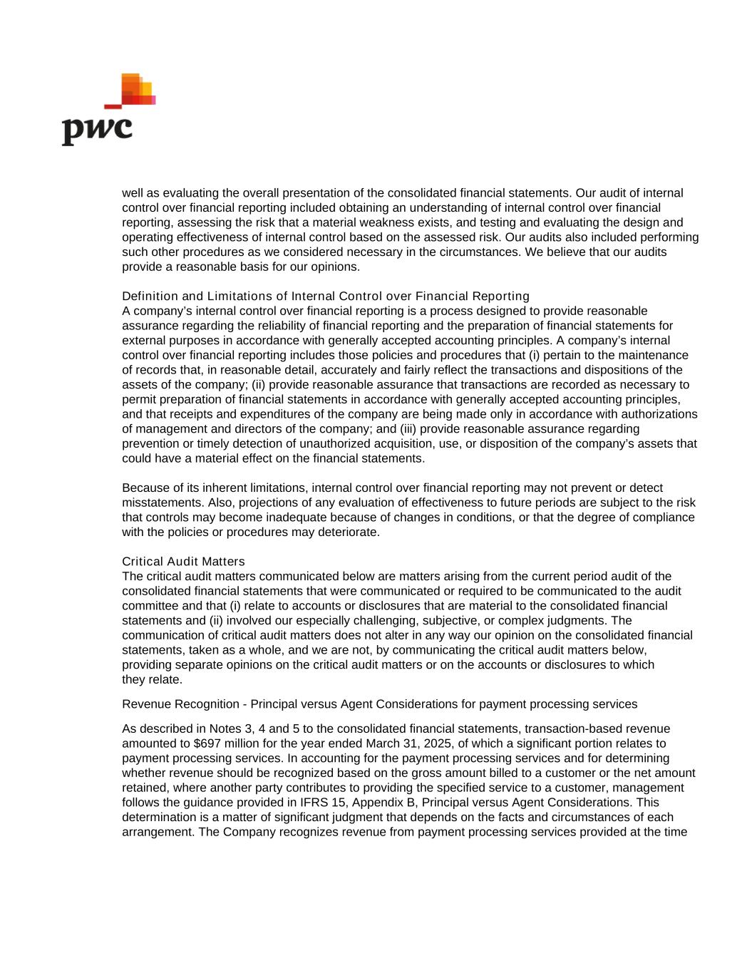well as evaluating the overall presentation of the consolidated financial statements. Our audit of internal control over financial reporting included obtaining an understanding of internal control over financial reporting, assessing the risk that a material weakness exists, and testing and evaluating the design and operating effectiveness of internal control based on the assessed risk. Our audits also included performing such other procedures as we considered necessary in the circumstances. We believe that our audits provide a reasonable basis for our opinions. Definition and Limitations of Internal Control over Financial Reporting A company’s internal control over financial reporting is a process designed to provide reasonable assurance regarding the reliability of financial reporting and the preparation of financial statements for external purposes in accordance with generally accepted accounting principles. A company’s internal control over financial reporting includes those policies and procedures that (i) pertain to the maintenance of records that, in reasonable detail, accurately and fairly reflect the transactions and dispositions of the assets of the company; (ii) provide reasonable assurance that transactions are recorded as necessary to permit preparation of financial statements in accordance with generally accepted accounting principles, and that receipts and expenditures of the company are being made only in accordance with authorizations of management and directors of the company; and (iii) provide reasonable assurance regarding prevention or timely detection of unauthorized acquisition, use, or disposition of the company’s assets that could have a material effect on the financial statements. Because of its inherent limitations, internal control over financial reporting may not prevent or detect misstatements. Also, projections of any evaluation of effectiveness to future periods are subject to the risk that controls may become inadequate because of changes in conditions, or that the degree of compliance with the policies or procedures may deteriorate. Critical Audit Matters The critical audit matters communicated below are matters arising from the current period audit of the consolidated financial statements that were communicated or required to be communicated to the audit committee and that (i) relate to accounts or disclosures that are material to the consolidated financial statements and (ii) involved our especially challenging, subjective, or complex judgments. The communication of critical audit matters does not alter in any way our opinion on the consolidated financial statements, taken as a whole, and we are not, by communicating the critical audit matters below, providing separate opinions on the critical audit matters or on the accounts or disclosures to which they relate. Revenue Recognition - Principal versus Agent Considerations for payment processing services As described in Notes 3, 4 and 5 to the consolidated financial statements, transaction-based revenue amounted to $697 million for the year ended March 31, 2025, of which a significant portion relates to payment processing services. In accounting for the payment processing services and for determining whether revenue should be recognized based on the gross amount billed to a customer or the net amount retained, where another party contributes to providing the specified service to a customer, management follows the guidance provided in IFRS 15, Appendix B, Principal versus Agent Considerations. This determination is a matter of significant judgment that depends on the facts and circumstances of each arrangement. The Company recognizes revenue from payment processing services provided at the time