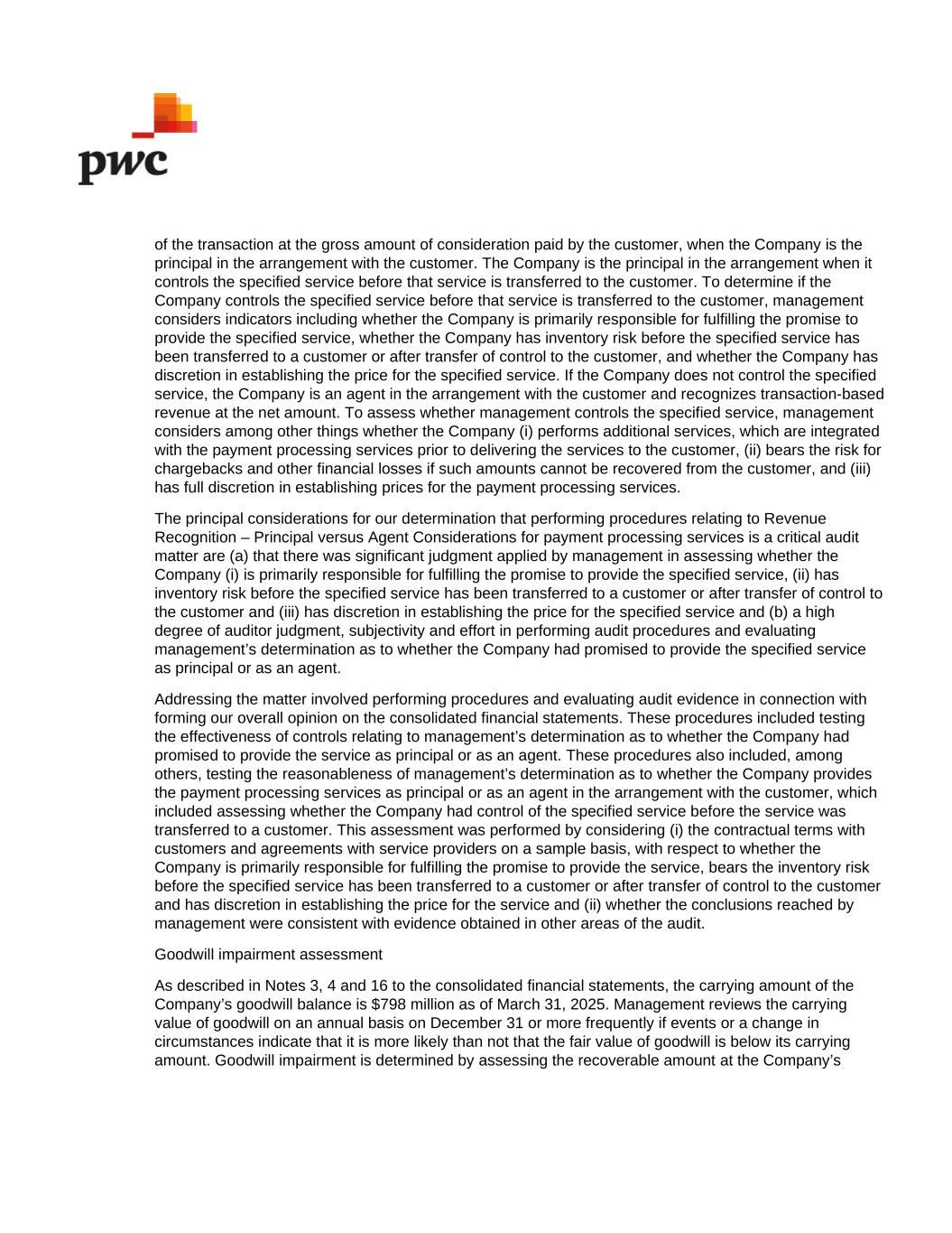of the transaction at the gross amount of consideration paid by the customer, when the Company is the principal in the arrangement with the customer. The Company is the principal in the arrangement when it controls the specified service before that service is transferred to the customer. To determine if the Company controls the specified service before that service is transferred to the customer, management considers indicators including whether the Company is primarily responsible for fulfilling the promise to provide the specified service, whether the Company has inventory risk before the specified service has been transferred to a customer or after transfer of control to the customer, and whether the Company has discretion in establishing the price for the specified service. If the Company does not control the specified service, the Company is an agent in the arrangement with the customer and recognizes transaction-based revenue at the net amount. To assess whether management controls the specified service, management considers among other things whether the Company (i) performs additional services, which are integrated with the payment processing services prior to delivering the services to the customer, (ii) bears the risk for chargebacks and other financial losses if such amounts cannot be recovered from the customer, and (iii) has full discretion in establishing prices for the payment processing services. The principal considerations for our determination that performing procedures relating to Revenue Recognition – Principal versus Agent Considerations for payment processing services is a critical audit matter are (a) that there was significant judgment applied by management in assessing whether the Company (i) is primarily responsible for fulfilling the promise to provide the specified service, (ii) has inventory risk before the specified service has been transferred to a customer or after transfer of control to the customer and (iii) has discretion in establishing the price for the specified service and (b) a high degree of auditor judgment, subjectivity and effort in performing audit procedures and evaluating management’s determination as to whether the Company had promised to provide the specified service as principal or as an agent. Addressing the matter involved performing procedures and evaluating audit evidence in connection with forming our overall opinion on the consolidated financial statements. These procedures included testing the effectiveness of controls relating to management’s determination as to whether the Company had promised to provide the service as principal or as an agent. These procedures also included, among others, testing the reasonableness of management’s determination as to whether the Company provides the payment processing services as principal or as an agent in the arrangement with the customer, which included assessing whether the Company had control of the specified service before the service was transferred to a customer. This assessment was performed by considering (i) the contractual terms with customers and agreements with service providers on a sample basis, with respect to whether the Company is primarily responsible for fulfilling the promise to provide the service, bears the inventory risk before the specified service has been transferred to a customer or after transfer of control to the customer and has discretion in establishing the price for the service and (ii) whether the conclusions reached by management were consistent with evidence obtained in other areas of the audit. Goodwill impairment assessment As described in Notes 3, 4 and 16 to the consolidated financial statements, the carrying amount of the Company’s goodwill balance is $798 million as of March 31, 2025. Management reviews the carrying value of goodwill on an annual basis on December 31 or more frequently if events or a change in circumstances indicate that it is more likely than not that the fair value of goodwill is below its carrying amount. Goodwill impairment is determined by assessing the recoverable amount at the Company’s