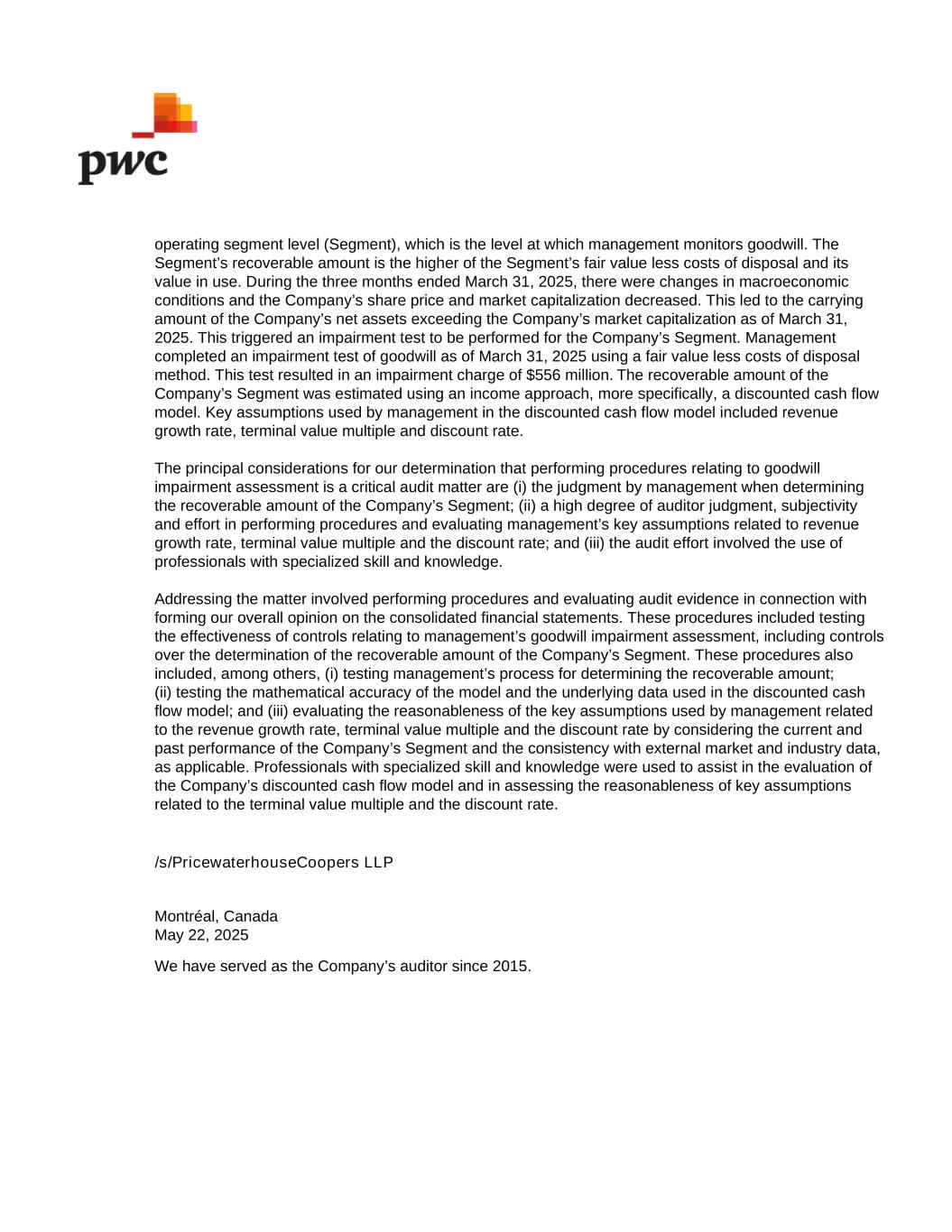 operating segment level (Segment), which is the level at which management monitors goodwill. The Segment’s recoverable amount is the higher of the Segment’s fair value less costs of disposal and its value in use. During the three months ended March 31, 2025, there were changes in macroeconomic conditions and the Company’s share price and market capitalization decreased. This led to the carrying amount of the Company’s net assets exceeding the Company’s market capitalization as of March 31, 2025. This triggered an impairment test to be performed for the Company’s Segment. Management completed an impairment test of goodwill as of March 31, 2025 using a fair value less costs of disposal method. This test resulted in an impairment charge of $556 million. The recoverable amount of the Company’s Segment was estimated using an income approach, more specifically, a discounted cash flow model. Key assumptions used by management in the discounted cash flow model included revenue growth rate, terminal value multiple and discount rate. The principal considerations for our determination that performing procedures relating to goodwill impairment assessment is a critical audit matter are (i) the judgment by management when determining the recoverable amount of the Company’s Segment; (ii) a high degree of auditor judgment, subjectivity and effort in performing procedures and evaluating management’s key assumptions related to revenue growth rate, terminal value multiple and the discount rate; and (iii) the audit effort involved the use of professionals with specialized skill and knowledge. Addressing the matter involved performing procedures and evaluating audit evidence in connection with forming our overall opinion on the consolidated financial statements. These procedures included testing the effectiveness of controls relating to management’s goodwill impairment assessment, including controls over the determination of the recoverable amount of the Company’s Segment. These procedures also included, among others, (i) testing management’s process for determining the recoverable amount; (ii) testing the mathematical accuracy of the model and the underlying data used in the discounted cash flow model; and (iii) evaluating the reasonableness of the key assumptions used by management related to the revenue growth rate, terminal value multiple and the discount rate by considering the current and past performance of the Company’s Segment and the consistency with external market and industry data, as applicable. Professionals with specialized skill and knowledge were used to assist in the evaluation of the Company’s discounted cash flow model and in assessing the reasonableness of key assumptions related to the terminal value multiple and the discount rate. Montréal, Canada May 22, 2025 We have served as the Company’s auditor since 2015. /s/PricewaterhouseCoopers LLP