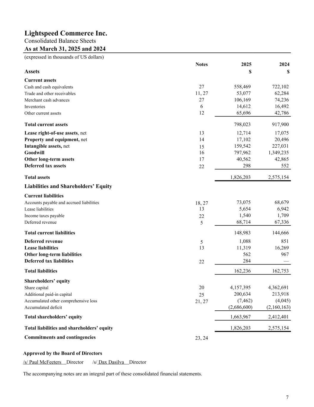 Lightspeed Commerce Inc. Consolidated Balance Sheets As at March 31, 2025 and 2024 (expressed in thousands of US dollars) Notes 2025 2024 Assets $ $ Current assets Cash and cash equivalents 27 558,469 722,102 Trade and other receivables 11, 27 53,077 62,284 Merchant cash advances 27 106,169 74,236 Inventories 6 14,612 16,492 Other current assets 12 65,696 42,786 Total current assets 798,023 917,900 Lease right-of-use assets, net 13 12,714 17,075 Property and equipment, net 14 17,102 20,496 Intangible assets, net 15 159,542 227,031 Goodwill 16 797,962 1,349,235 Other long-term assets 17 40,562 42,865 Deferred tax assets 22 298 552 Total assets 1,826,203 2,575,154 Liabilities and Shareholders’ Equity Current liabilities Accounts payable and accrued liabilities 18, 27 73,075 68,679 Lease liabilities 13 5,654 6,942 Income taxes payable 22 1,540 1,709 Deferred revenue 5 68,714 67,336 Total current liabilities 148,983 144,666 Deferred revenue 5 1,088 851 Lease liabilities 13 11,319 16,269 Other long-term liabilities 562 967 Deferred tax liabilities 22 284 — Total liabilities 162,236 162,753 Shareholders’ equity Share capital 20 4,157,395 4,362,691 Additional paid-in capital 25 200,634 213,918 Accumulated other comprehensive loss 21, 27 (7,462) (4,045) Accumulated deficit (2,686,600) (2,160,163) Total shareholders’ equity 1,663,967 2,412,401 Total liabilities and shareholders’ equity 1,826,203 2,575,154 Commitments and contingencies 23, 24 Approved by the Board of Directors /s/ Paul McFeeters Director /s/ Dax Dasilva Director The accompanying notes are an integral part of these consolidated financial statements. 7
