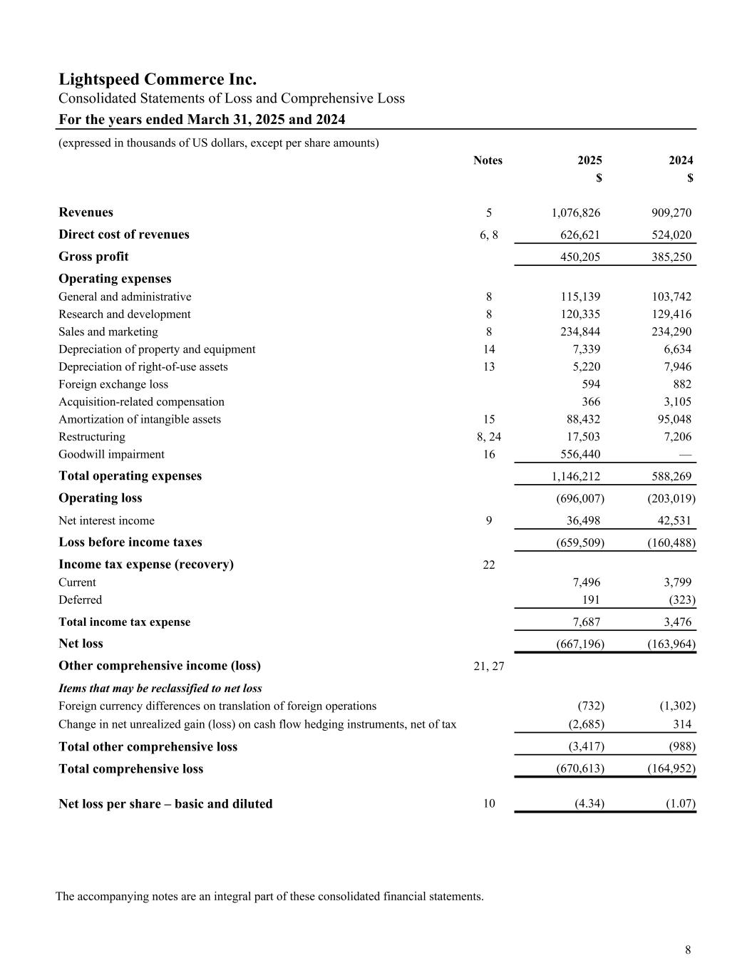 Lightspeed Commerce Inc. Consolidated Statements of Loss and Comprehensive Loss For the years ended March 31, 2025 and 2024 (expressed in thousands of US dollars, except per share amounts) Notes 2025 2024 $ $ Revenues 5 1,076,826 909,270 Direct cost of revenues 6, 8 626,621 524,020 Gross profit 450,205 385,250 Operating expenses General and administrative 8 115,139 103,742 Research and development 8 120,335 129,416 Sales and marketing 8 234,844 234,290 Depreciation of property and equipment 14 7,339 6,634 Depreciation of right-of-use assets 13 5,220 7,946 Foreign exchange loss 594 882 Acquisition-related compensation 366 3,105 Amortization of intangible assets 15 88,432 95,048 Restructuring 8, 24 17,503 7,206 Goodwill impairment 16 556,440 — Total operating expenses 1,146,212 588,269 Operating loss (696,007) (203,019) Net interest income 9 36,498 42,531 Loss before income taxes (659,509) (160,488) Income tax expense (recovery) 22 Current 7,496 3,799 Deferred 191 (323) Total income tax expense 7,687 3,476 Net loss (667,196) (163,964) Other comprehensive income (loss) 21, 27 Items that may be reclassified to net loss Foreign currency differences on translation of foreign operations (732) (1,302) Change in net unrealized gain (loss) on cash flow hedging instruments, net of tax (2,685) 314 Total other comprehensive loss (3,417) (988) Total comprehensive loss (670,613) (164,952) Net loss per share – basic and diluted 10 (4.34) (1.07) The accompanying notes are an integral part of these consolidated financial statements. 8