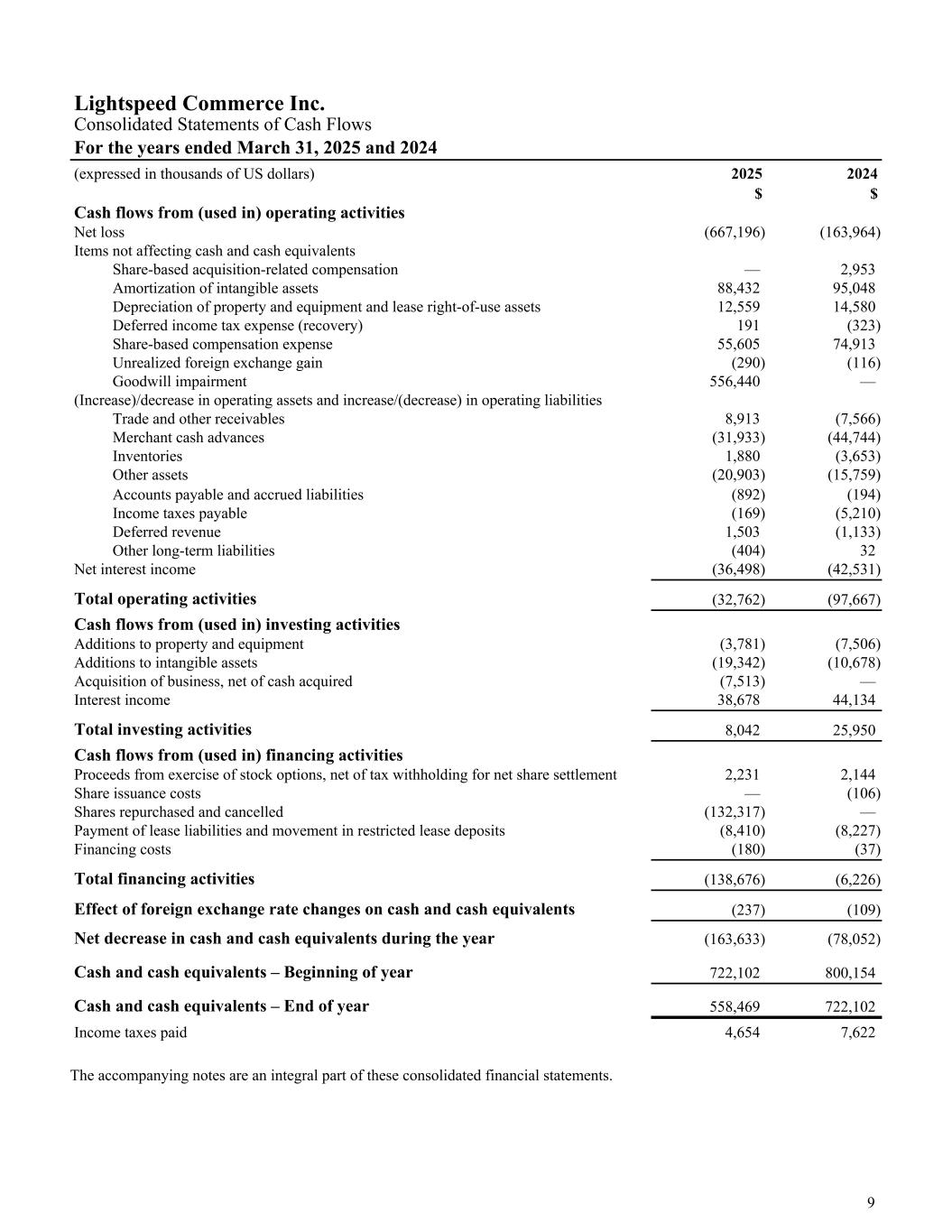 Lightspeed Commerce Inc. Consolidated Statements of Cash Flows For the years ended March 31, 2025 and 2024 (expressed in thousands of US dollars) 2025 2024 $ $ Cash flows from (used in) operating activities Net loss (667,196) (163,964) Items not affecting cash and cash equivalents Share-based acquisition-related compensation — 2,953 Amortization of intangible assets 88,432 95,048 Depreciation of property and equipment and lease right-of-use assets 12,559 14,580 Deferred income tax expense (recovery) 191 (323) Share-based compensation expense 55,605 74,913 Unrealized foreign exchange gain (290) (116) Goodwill impairment 556,440 — (Increase)/decrease in operating assets and increase/(decrease) in operating liabilities Trade and other receivables 8,913 (7,566) Merchant cash advances (31,933) (44,744) Inventories 1,880 (3,653) Other assets (20,903) (15,759) Accounts payable and accrued liabilities (892) (194) Income taxes payable (169) (5,210) Deferred revenue 1,503 (1,133) Other long-term liabilities (404) 32 Net interest income (36,498) (42,531) Total operating activities (32,762) (97,667) Cash flows from (used in) investing activities Additions to property and equipment (3,781) (7,506) Additions to intangible assets (19,342) (10,678) Acquisition of business, net of cash acquired (7,513) — Interest income 38,678 44,134 Total investing activities 8,042 25,950 Cash flows from (used in) financing activities Proceeds from exercise of stock options, net of tax withholding for net share settlement 2,231 2,144 Share issuance costs — (106) Shares repurchased and cancelled (132,317) — Payment of lease liabilities and movement in restricted lease deposits (8,410) (8,227) Financing costs (180) (37) Total financing activities (138,676) (6,226) Effect of foreign exchange rate changes on cash and cash equivalents (237) (109) Net decrease in cash and cash equivalents during the year (163,633) (78,052) Cash and cash equivalents – Beginning of year 722,102 800,154 Cash and cash equivalents – End of year 558,469 722,102 Income taxes paid 4,654 7,622 The accompanying notes are an integral part of these consolidated financial statements. 9