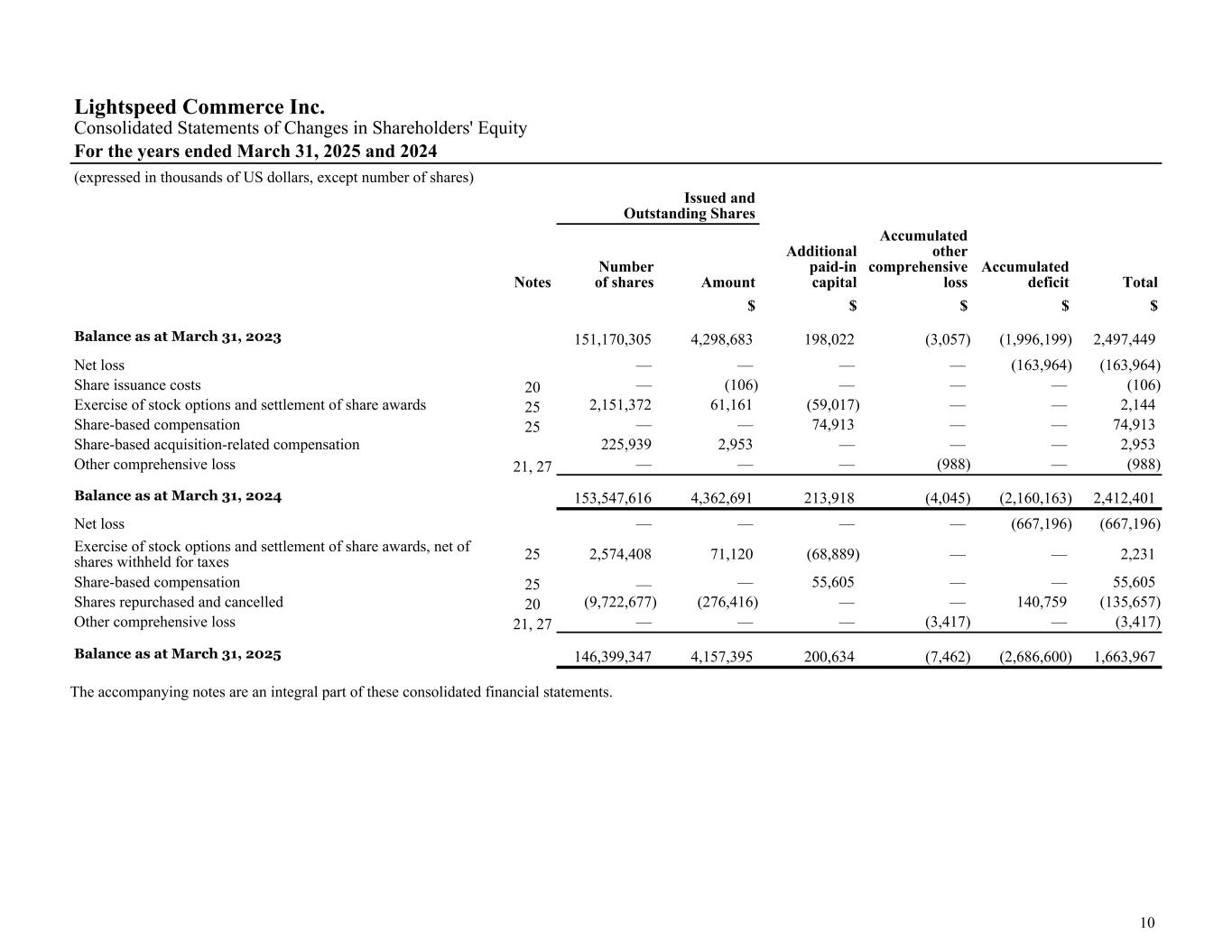Lightspeed Commerce Inc. Consolidated Statements of Changes in Shareholders' Equity For the years ended March 31, 2025 and 2024 (expressed in thousands of US dollars, except number of shares) Issued and Outstanding Shares Notes Number of shares Amount Additional paid-in capital Accumulated other comprehensive loss Accumulated deficit Total $ $ $ $ $ Balance as at March 31, 2023 151,170,305 4,298,683 198,022 (3,057) (1,996,199) 2,497,449 Net loss — — — — (163,964) (163,964) Share issuance costs 20 — (106) — — — (106) Exercise of stock options and settlement of share awards 25 2,151,372 61,161 (59,017) — — 2,144 Share-based compensation 25 — — 74,913 — — 74,913 Share-based acquisition-related compensation 225,939 2,953 — — — 2,953 Other comprehensive loss 21, 27 — — — (988) — (988) Balance as at March 31, 2024 153,547,616 4,362,691 213,918 (4,045) (2,160,163) 2,412,401 Net loss — — — — (667,196) (667,196) Exercise of stock options and settlement of share awards, net of shares withheld for taxes 25 2,574,408 71,120 (68,889) — — 2,231 Share-based compensation 25 — — 55,605 — — 55,605 Shares repurchased and cancelled 20 (9,722,677) (276,416) — — 140,759 (135,657) Other comprehensive loss 21, 27 — — — (3,417) — (3,417) Balance as at March 31, 2025 146,399,347 4,157,395 200,634 (7,462) (2,686,600) 1,663,967 The accompanying notes are an integral part of these consolidated financial statements. 10