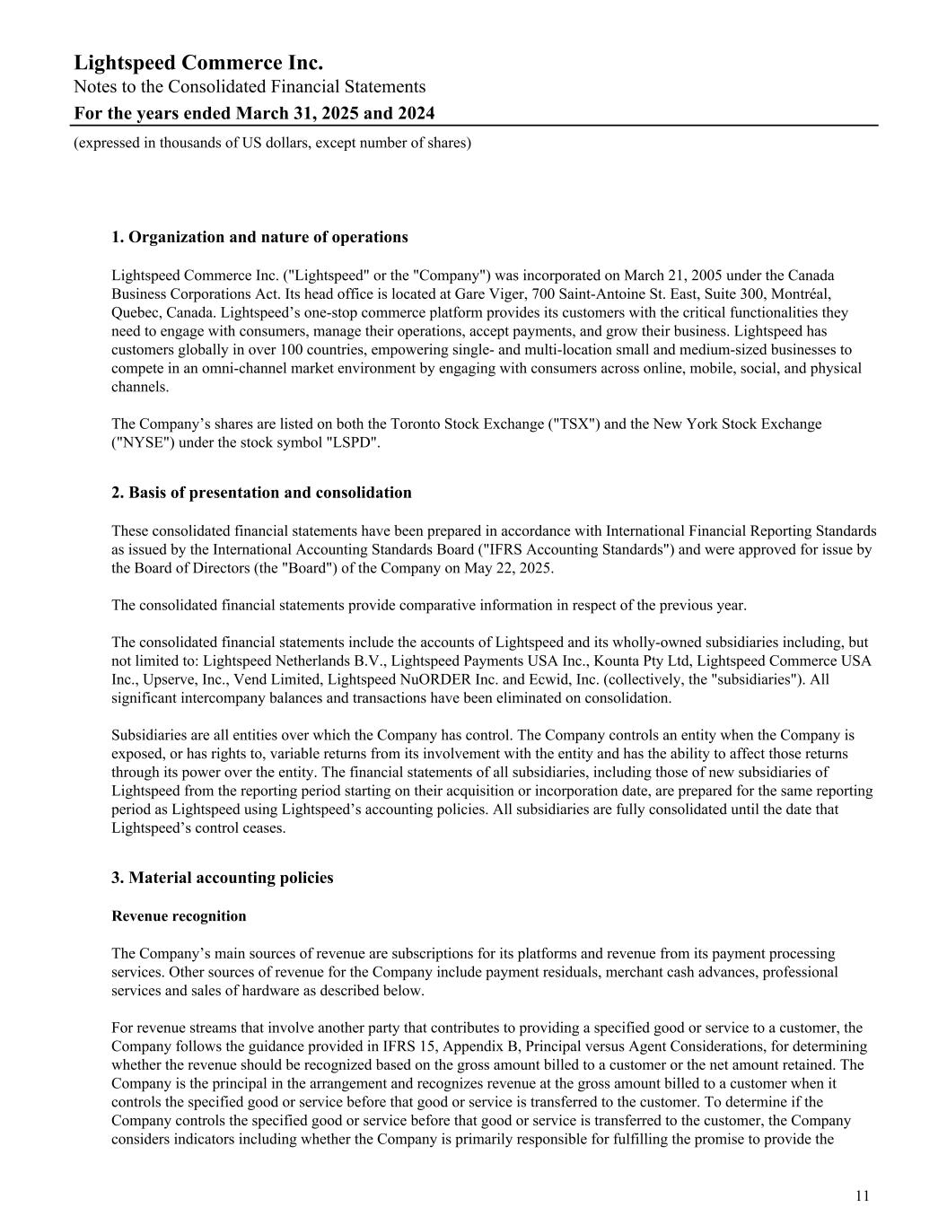 1. Organization and nature of operations Lightspeed Commerce Inc. ("Lightspeed" or the "Company") was incorporated on March 21, 2005 under the Canada Business Corporations Act. Its head office is located at Gare Viger, 700 Saint-Antoine St. East, Suite 300, Montréal, Quebec, Canada. Lightspeed’s one-stop commerce platform provides its customers with the critical functionalities they need to engage with consumers, manage their operations, accept payments, and grow their business. Lightspeed has customers globally in over 100 countries, empowering single- and multi-location small and medium-sized businesses to compete in an omni-channel market environment by engaging with consumers across online, mobile, social, and physical channels. The Company’s shares are listed on both the Toronto Stock Exchange ("TSX") and the New York Stock Exchange ("NYSE") under the stock symbol "LSPD". 2. Basis of presentation and consolidation These consolidated financial statements have been prepared in accordance with International Financial Reporting Standards as issued by the International Accounting Standards Board ("IFRS Accounting Standards") and were approved for issue by the Board of Directors (the "Board") of the Company on May 22, 2025. The consolidated financial statements provide comparative information in respect of the previous year. The consolidated financial statements include the accounts of Lightspeed and its wholly-owned subsidiaries including, but not limited to: Lightspeed Netherlands B.V., Lightspeed Payments USA Inc., Kounta Pty Ltd, Lightspeed Commerce USA Inc., Upserve, Inc., Vend Limited, Lightspeed NuORDER Inc. and Ecwid, Inc. (collectively, the "subsidiaries"). All significant intercompany balances and transactions have been eliminated on consolidation. Subsidiaries are all entities over which the Company has control. The Company controls an entity when the Company is exposed, or has rights to, variable returns from its involvement with the entity and has the ability to affect those returns through its power over the entity. The financial statements of all subsidiaries, including those of new subsidiaries of Lightspeed from the reporting period starting on their acquisition or incorporation date, are prepared for the same reporting period as Lightspeed using Lightspeed’s accounting policies. All subsidiaries are fully consolidated until the date that Lightspeed’s control ceases. 3. Material accounting policies Revenue recognition The Company’s main sources of revenue are subscriptions for its platforms and revenue from its payment processing services. Other sources of revenue for the Company include payment residuals, merchant cash advances, professional services and sales of hardware as described below. For revenue streams that involve another party that contributes to providing a specified good or service to a customer, the Company follows the guidance provided in IFRS 15, Appendix B, Principal versus Agent Considerations, for determining whether the revenue should be recognized based on the gross amount billed to a customer or the net amount retained. The Company is the principal in the arrangement and recognizes revenue at the gross amount billed to a customer when it controls the specified good or service before that good or service is transferred to the customer. To determine if the Company controls the specified good or service before that good or service is transferred to the customer, the Company considers indicators including whether the Company is primarily responsible for fulfilling the promise to provide the Lightspeed Commerce Inc. Notes to the Consolidated Financial Statements For the years ended March 31, 2025 and 2024 (expressed in thousands of US dollars, except number of shares) 11