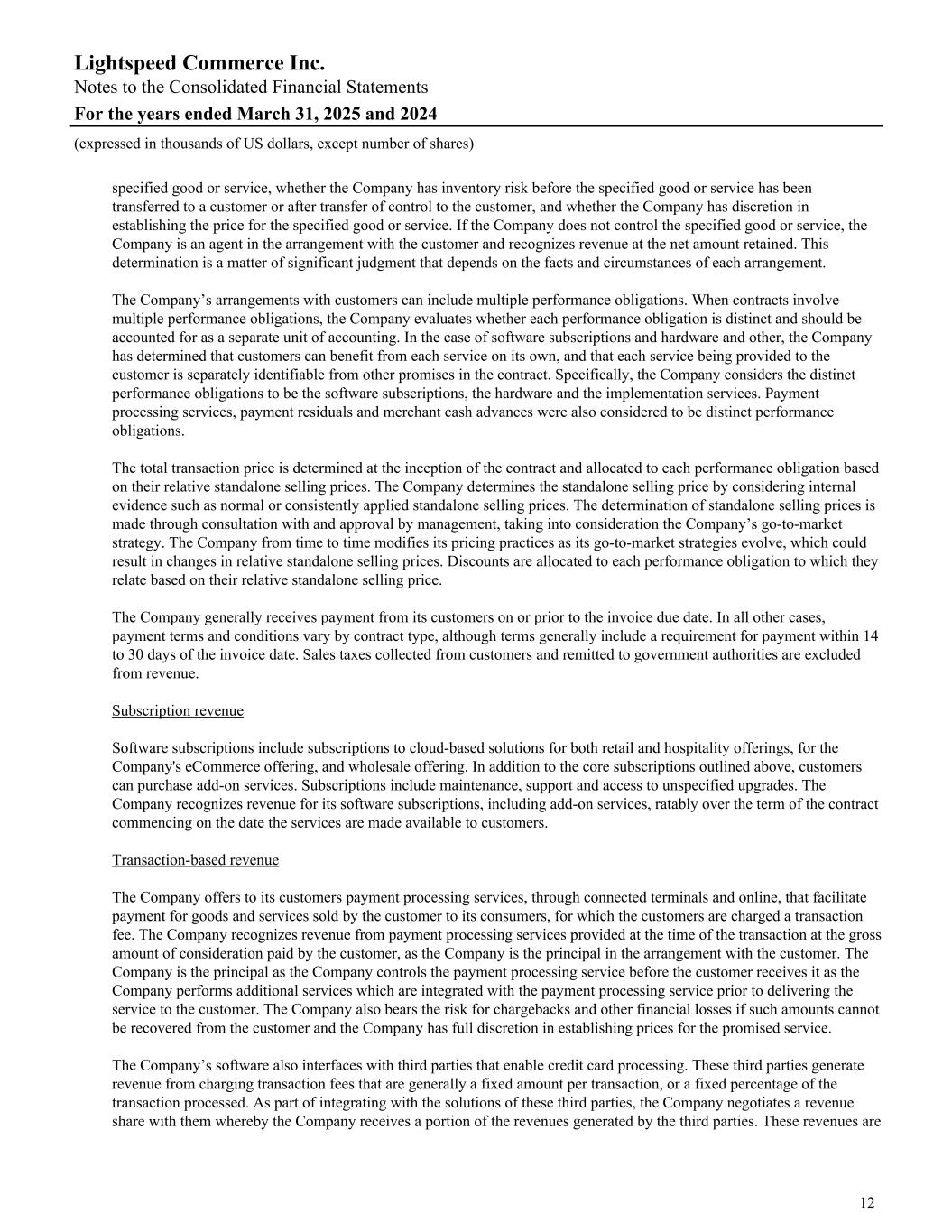 specified good or service, whether the Company has inventory risk before the specified good or service has been transferred to a customer or after transfer of control to the customer, and whether the Company has discretion in establishing the price for the specified good or service. If the Company does not control the specified good or service, the Company is an agent in the arrangement with the customer and recognizes revenue at the net amount retained. This determination is a matter of significant judgment that depends on the facts and circumstances of each arrangement. The Company’s arrangements with customers can include multiple performance obligations. When contracts involve multiple performance obligations, the Company evaluates whether each performance obligation is distinct and should be accounted for as a separate unit of accounting. In the case of software subscriptions and hardware and other, the Company has determined that customers can benefit from each service on its own, and that each service being provided to the customer is separately identifiable from other promises in the contract. Specifically, the Company considers the distinct performance obligations to be the software subscriptions, the hardware and the implementation services. Payment processing services, payment residuals and merchant cash advances were also considered to be distinct performance obligations. The total transaction price is determined at the inception of the contract and allocated to each performance obligation based on their relative standalone selling prices. The Company determines the standalone selling price by considering internal evidence such as normal or consistently applied standalone selling prices. The determination of standalone selling prices is made through consultation with and approval by management, taking into consideration the Company’s go-to-market strategy. The Company from time to time modifies its pricing practices as its go-to-market strategies evolve, which could result in changes in relative standalone selling prices. Discounts are allocated to each performance obligation to which they relate based on their relative standalone selling price. The Company generally receives payment from its customers on or prior to the invoice due date. In all other cases, payment terms and conditions vary by contract type, although terms generally include a requirement for payment within 14 to 30 days of the invoice date. Sales taxes collected from customers and remitted to government authorities are excluded from revenue. Subscription revenue Software subscriptions include subscriptions to cloud-based solutions for both retail and hospitality offerings, for the Company's eCommerce offering, and wholesale offering. In addition to the core subscriptions outlined above, customers can purchase add-on services. Subscriptions include maintenance, support and access to unspecified upgrades. The Company recognizes revenue for its software subscriptions, including add-on services, ratably over the term of the contract commencing on the date the services are made available to customers. Transaction-based revenue The Company offers to its customers payment processing services, through connected terminals and online, that facilitate payment for goods and services sold by the customer to its consumers, for which the customers are charged a transaction fee. The Company recognizes revenue from payment processing services provided at the time of the transaction at the gross amount of consideration paid by the customer, as the Company is the principal in the arrangement with the customer. The Company is the principal as the Company controls the payment processing service before the customer receives it as the Company performs additional services which are integrated with the payment processing service prior to delivering the service to the customer. The Company also bears the risk for chargebacks and other financial losses if such amounts cannot be recovered from the customer and the Company has full discretion in establishing prices for the promised service. The Company’s software also interfaces with third parties that enable credit card processing. These third parties generate revenue from charging transaction fees that are generally a fixed amount per transaction, or a fixed percentage of the transaction processed. As part of integrating with the solutions of these third parties, the Company negotiates a revenue share with them whereby the Company receives a portion of the revenues generated by the third parties. These revenues are Lightspeed Commerce Inc. Notes to the Consolidated Financial Statements For the years ended March 31, 2025 and 2024 (expressed in thousands of US dollars, except number of shares) 12