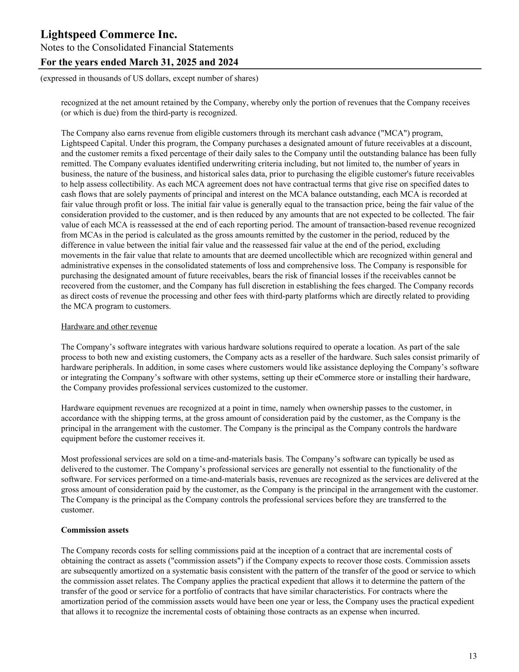 recognized at the net amount retained by the Company, whereby only the portion of revenues that the Company receives (or which is due) from the third-party is recognized. The Company also earns revenue from eligible customers through its merchant cash advance ("MCA") program, Lightspeed Capital. Under this program, the Company purchases a designated amount of future receivables at a discount, and the customer remits a fixed percentage of their daily sales to the Company until the outstanding balance has been fully remitted. The Company evaluates identified underwriting criteria including, but not limited to, the number of years in business, the nature of the business, and historical sales data, prior to purchasing the eligible customer's future receivables to help assess collectibility. As each MCA agreement does not have contractual terms that give rise on specified dates to cash flows that are solely payments of principal and interest on the MCA balance outstanding, each MCA is recorded at fair value through profit or loss. The initial fair value is generally equal to the transaction price, being the fair value of the consideration provided to the customer, and is then reduced by any amounts that are not expected to be collected. The fair value of each MCA is reassessed at the end of each reporting period. The amount of transaction-based revenue recognized from MCAs in the period is calculated as the gross amounts remitted by the customer in the period, reduced by the difference in value between the initial fair value and the reassessed fair value at the end of the period, excluding movements in the fair value that relate to amounts that are deemed uncollectible which are recognized within general and administrative expenses in the consolidated statements of loss and comprehensive loss. The Company is responsible for purchasing the designated amount of future receivables, bears the risk of financial losses if the receivables cannot be recovered from the customer, and the Company has full discretion in establishing the fees charged. The Company records as direct costs of revenue the processing and other fees with third-party platforms which are directly related to providing the MCA program to customers. Hardware and other revenue The Company’s software integrates with various hardware solutions required to operate a location. As part of the sale process to both new and existing customers, the Company acts as a reseller of the hardware. Such sales consist primarily of hardware peripherals. In addition, in some cases where customers would like assistance deploying the Company’s software or integrating the Company’s software with other systems, setting up their eCommerce store or installing their hardware, the Company provides professional services customized to the customer. Hardware equipment revenues are recognized at a point in time, namely when ownership passes to the customer, in accordance with the shipping terms, at the gross amount of consideration paid by the customer, as the Company is the principal in the arrangement with the customer. The Company is the principal as the Company controls the hardware equipment before the customer receives it. Most professional services are sold on a time-and-materials basis. The Company’s software can typically be used as delivered to the customer. The Company’s professional services are generally not essential to the functionality of the software. For services performed on a time-and-materials basis, revenues are recognized as the services are delivered at the gross amount of consideration paid by the customer, as the Company is the principal in the arrangement with the customer. The Company is the principal as the Company controls the professional services before they are transferred to the customer. Commission assets The Company records costs for selling commissions paid at the inception of a contract that are incremental costs of obtaining the contract as assets ("commission assets") if the Company expects to recover those costs. Commission assets are subsequently amortized on a systematic basis consistent with the pattern of the transfer of the good or service to which the commission asset relates. The Company applies the practical expedient that allows it to determine the pattern of the transfer of the good or service for a portfolio of contracts that have similar characteristics. For contracts where the amortization period of the commission assets would have been one year or less, the Company uses the practical expedient that allows it to recognize the incremental costs of obtaining those contracts as an expense when incurred. Lightspeed Commerce Inc. Notes to the Consolidated Financial Statements For the years ended March 31, 2025 and 2024 (expressed in thousands of US dollars, except number of shares) 13