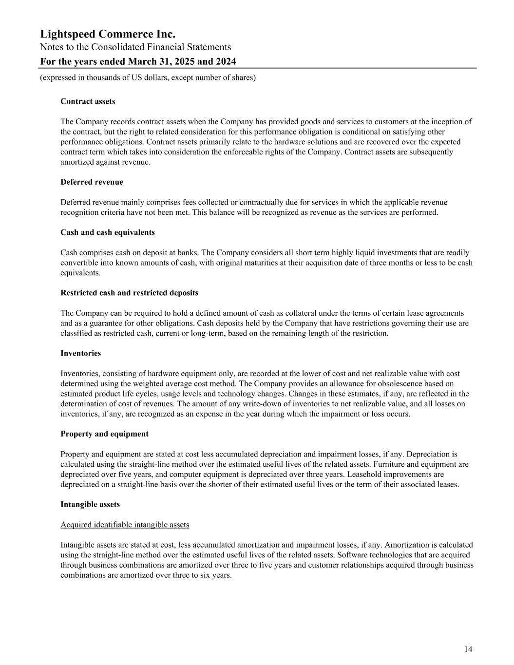 Contract assets The Company records contract assets when the Company has provided goods and services to customers at the inception of the contract, but the right to related consideration for this performance obligation is conditional on satisfying other performance obligations. Contract assets primarily relate to the hardware solutions and are recovered over the expected contract term which takes into consideration the enforceable rights of the Company. Contract assets are subsequently amortized against revenue. Deferred revenue Deferred revenue mainly comprises fees collected or contractually due for services in which the applicable revenue recognition criteria have not been met. This balance will be recognized as revenue as the services are performed. Cash and cash equivalents Cash comprises cash on deposit at banks. The Company considers all short term highly liquid investments that are readily convertible into known amounts of cash, with original maturities at their acquisition date of three months or less to be cash equivalents. Restricted cash and restricted deposits The Company can be required to hold a defined amount of cash as collateral under the terms of certain lease agreements and as a guarantee for other obligations. Cash deposits held by the Company that have restrictions governing their use are classified as restricted cash, current or long-term, based on the remaining length of the restriction. Inventories Inventories, consisting of hardware equipment only, are recorded at the lower of cost and net realizable value with cost determined using the weighted average cost method. The Company provides an allowance for obsolescence based on estimated product life cycles, usage levels and technology changes. Changes in these estimates, if any, are reflected in the determination of cost of revenues. The amount of any write-down of inventories to net realizable value, and all losses on inventories, if any, are recognized as an expense in the year during which the impairment or loss occurs. Property and equipment Property and equipment are stated at cost less accumulated depreciation and impairment losses, if any. Depreciation is calculated using the straight-line method over the estimated useful lives of the related assets. Furniture and equipment are depreciated over five years, and computer equipment is depreciated over three years. Leasehold improvements are depreciated on a straight-line basis over the shorter of their estimated useful lives or the term of their associated leases. Intangible assets Acquired identifiable intangible assets Intangible assets are stated at cost, less accumulated amortization and impairment losses, if any. Amortization is calculated using the straight-line method over the estimated useful lives of the related assets. Software technologies that are acquired through business combinations are amortized over three to five years and customer relationships acquired through business combinations are amortized over three to six years. Lightspeed Commerce Inc. Notes to the Consolidated Financial Statements For the years ended March 31, 2025 and 2024 (expressed in thousands of US dollars, except number of shares) 14