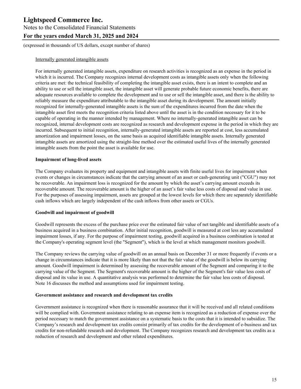 Internally generated intangible assets For internally generated intangible assets, expenditure on research activities is recognized as an expense in the period in which it is incurred. The Company recognizes internal development costs as intangible assets only when the following criteria are met: the technical feasibility of completing the intangible asset exists, there is an intent to complete and an ability to use or sell the intangible asset, the intangible asset will generate probable future economic benefits, there are adequate resources available to complete the development and to use or sell the intangible asset, and there is the ability to reliably measure the expenditure attributable to the intangible asset during its development. The amount initially recognized for internally-generated intangible assets is the sum of the expenditures incurred from the date when the intangible asset first meets the recognition criteria listed above until the asset is in the condition necessary for it to be capable of operating in the manner intended by management. Where no internally-generated intangible asset can be recognized, internal development costs are recognized as research and development expense in the period in which they are incurred. Subsequent to initial recognition, internally-generated intangible assets are reported at cost, less accumulated amortization and impairment losses, on the same basis as acquired identifiable intangible assets. Internally generated intangible assets are amortized using the straight-line method over the estimated useful lives of the internally generated intangible assets from the point the asset is available for use. Impairment of long-lived assets The Company evaluates its property and equipment and intangible assets with finite useful lives for impairment when events or changes in circumstances indicate that the carrying amount of an asset or cash-generating unit ("CGU") may not be recoverable. An impairment loss is recognized for the amount by which the asset’s carrying amount exceeds its recoverable amount. The recoverable amount is the higher of an asset’s fair value less costs of disposal and value in use. For the purposes of assessing impairment, assets are grouped at the lowest levels for which there are separately identifiable cash inflows which are largely independent of the cash inflows from other assets or CGUs. Goodwill and impairment of goodwill Goodwill represents the excess of the purchase price over the estimated fair value of net tangible and identifiable assets of a business acquired in a business combination. After initial recognition, goodwill is measured at cost less any accumulated impairment losses, if any. For the purpose of impairment testing, goodwill acquired in a business combination is tested at the Company's operating segment level (the "Segment"), which is the level at which management monitors goodwill. The Company reviews the carrying value of goodwill on an annual basis on December 31 or more frequently if events or a change in circumstances indicate that it is more likely than not that the fair value of the goodwill is below its carrying amount. Goodwill impairment is determined by assessing the recoverable amount of the Segment and comparing it to the carrying value of the Segment. The Segment's recoverable amount is the higher of the Segment's fair value less costs of disposal and its value in use. A quantitative analysis was performed to determine the fair value less costs of disposal. Note 16 discusses the method and assumptions used for impairment testing. Government assistance and research and development tax credits Government assistance is recognized when there is reasonable assurance that it will be received and all related conditions will be complied with. Government assistance relating to an expense item is recognized as a reduction of expense over the period necessary to match the government assistance on a systematic basis to the costs that it is intended to subsidize. The Company’s research and development tax credits consist primarily of tax credits for the development of e-business and tax credits for non-refundable research and development. The Company recognizes research and development tax credits as a reduction of research and development and other related expenditures. Lightspeed Commerce Inc. Notes to the Consolidated Financial Statements For the years ended March 31, 2025 and 2024 (expressed in thousands of US dollars, except number of shares) 15