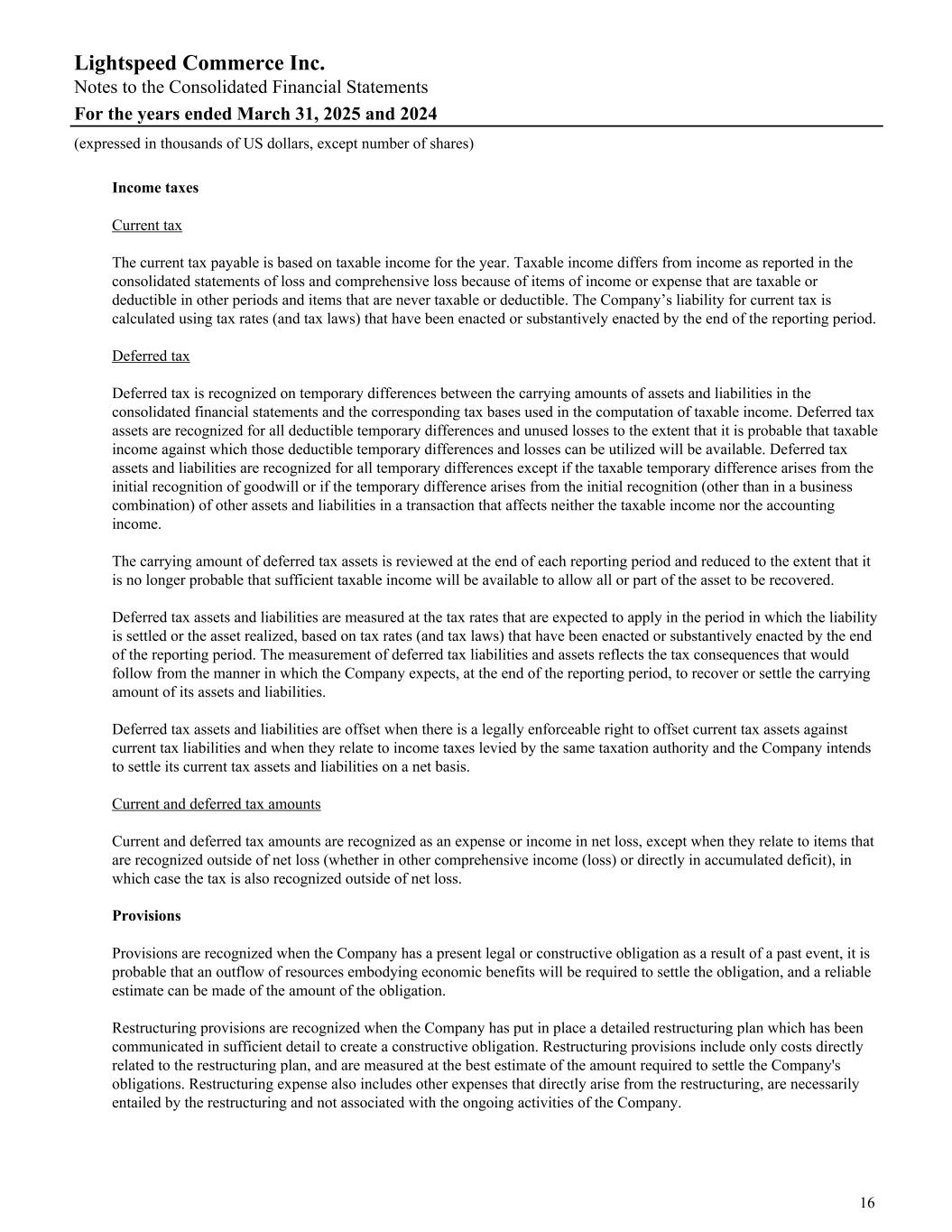 Income taxes Current tax The current tax payable is based on taxable income for the year. Taxable income differs from income as reported in the consolidated statements of loss and comprehensive loss because of items of income or expense that are taxable or deductible in other periods and items that are never taxable or deductible. The Company’s liability for current tax is calculated using tax rates (and tax laws) that have been enacted or substantively enacted by the end of the reporting period. Deferred tax Deferred tax is recognized on temporary differences between the carrying amounts of assets and liabilities in the consolidated financial statements and the corresponding tax bases used in the computation of taxable income. Deferred tax assets are recognized for all deductible temporary differences and unused losses to the extent that it is probable that taxable income against which those deductible temporary differences and losses can be utilized will be available. Deferred tax assets and liabilities are recognized for all temporary differences except if the taxable temporary difference arises from the initial recognition of goodwill or if the temporary difference arises from the initial recognition (other than in a business combination) of other assets and liabilities in a transaction that affects neither the taxable income nor the accounting income. The carrying amount of deferred tax assets is reviewed at the end of each reporting period and reduced to the extent that it is no longer probable that sufficient taxable income will be available to allow all or part of the asset to be recovered. Deferred tax assets and liabilities are measured at the tax rates that are expected to apply in the period in which the liability is settled or the asset realized, based on tax rates (and tax laws) that have been enacted or substantively enacted by the end of the reporting period. The measurement of deferred tax liabilities and assets reflects the tax consequences that would follow from the manner in which the Company expects, at the end of the reporting period, to recover or settle the carrying amount of its assets and liabilities. Deferred tax assets and liabilities are offset when there is a legally enforceable right to offset current tax assets against current tax liabilities and when they relate to income taxes levied by the same taxation authority and the Company intends to settle its current tax assets and liabilities on a net basis. Current and deferred tax amounts Current and deferred tax amounts are recognized as an expense or income in net loss, except when they relate to items that are recognized outside of net loss (whether in other comprehensive income (loss) or directly in accumulated deficit), in which case the tax is also recognized outside of net loss. Provisions Provisions are recognized when the Company has a present legal or constructive obligation as a result of a past event, it is probable that an outflow of resources embodying economic benefits will be required to settle the obligation, and a reliable estimate can be made of the amount of the obligation. Restructuring provisions are recognized when the Company has put in place a detailed restructuring plan which has been communicated in sufficient detail to create a constructive obligation. Restructuring provisions include only costs directly related to the restructuring plan, and are measured at the best estimate of the amount required to settle the Company's obligations. Restructuring expense also includes other expenses that directly arise from the restructuring, are necessarily entailed by the restructuring and not associated with the ongoing activities of the Company. Lightspeed Commerce Inc. Notes to the Consolidated Financial Statements For the years ended March 31, 2025 and 2024 (expressed in thousands of US dollars, except number of shares) 16