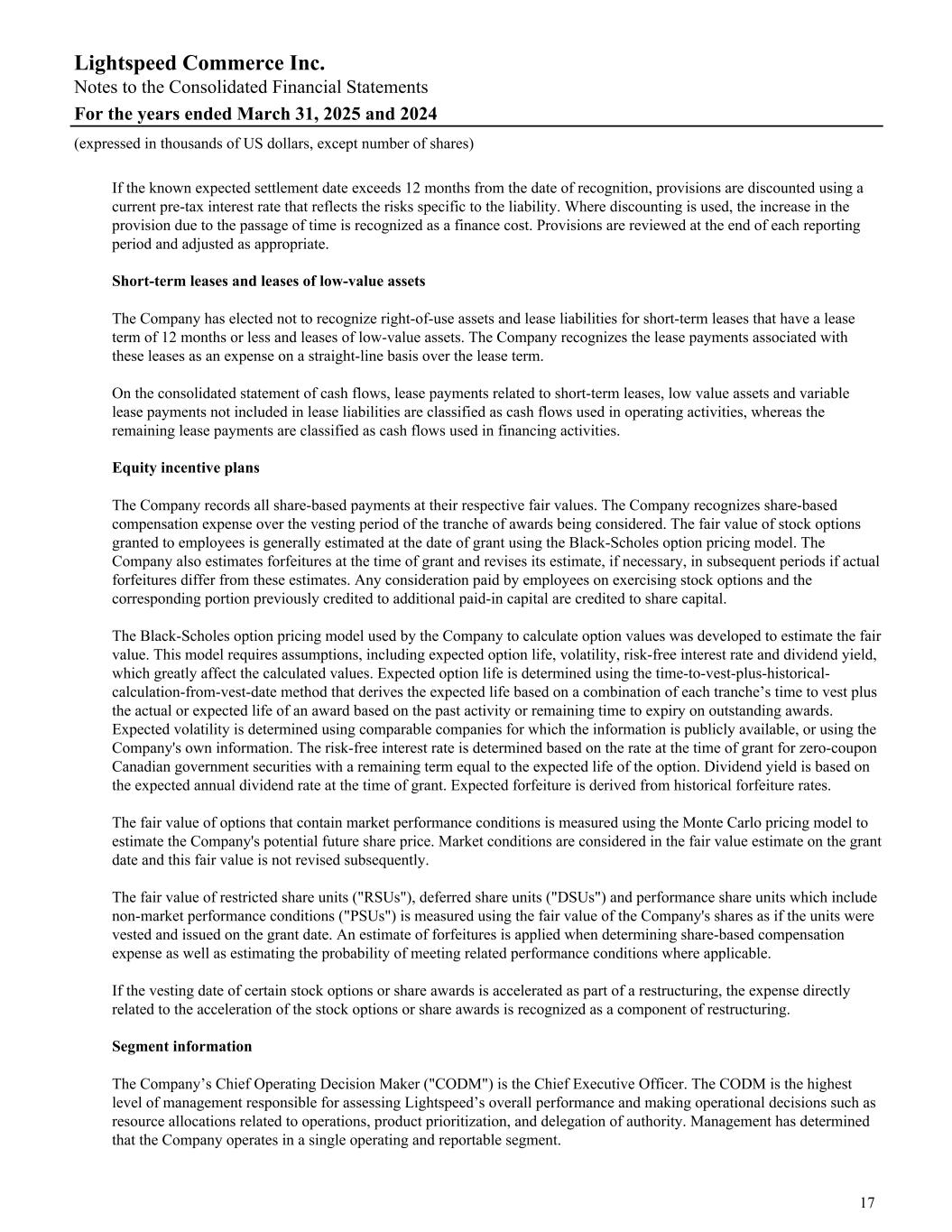 If the known expected settlement date exceeds 12 months from the date of recognition, provisions are discounted using a current pre-tax interest rate that reflects the risks specific to the liability. Where discounting is used, the increase in the provision due to the passage of time is recognized as a finance cost. Provisions are reviewed at the end of each reporting period and adjusted as appropriate. Short-term leases and leases of low-value assets The Company has elected not to recognize right-of-use assets and lease liabilities for short-term leases that have a lease term of 12 months or less and leases of low-value assets. The Company recognizes the lease payments associated with these leases as an expense on a straight-line basis over the lease term. On the consolidated statement of cash flows, lease payments related to short-term leases, low value assets and variable lease payments not included in lease liabilities are classified as cash flows used in operating activities, whereas the remaining lease payments are classified as cash flows used in financing activities. Equity incentive plans The Company records all share-based payments at their respective fair values. The Company recognizes share-based compensation expense over the vesting period of the tranche of awards being considered. The fair value of stock options granted to employees is generally estimated at the date of grant using the Black-Scholes option pricing model. The Company also estimates forfeitures at the time of grant and revises its estimate, if necessary, in subsequent periods if actual forfeitures differ from these estimates. Any consideration paid by employees on exercising stock options and the corresponding portion previously credited to additional paid-in capital are credited to share capital. The Black-Scholes option pricing model used by the Company to calculate option values was developed to estimate the fair value. This model requires assumptions, including expected option life, volatility, risk-free interest rate and dividend yield, which greatly affect the calculated values. Expected option life is determined using the time-to-vest-plus-historical- calculation-from-vest-date method that derives the expected life based on a combination of each tranche’s time to vest plus the actual or expected life of an award based on the past activity or remaining time to expiry on outstanding awards. Expected volatility is determined using comparable companies for which the information is publicly available, or using the Company's own information. The risk-free interest rate is determined based on the rate at the time of grant for zero-coupon Canadian government securities with a remaining term equal to the expected life of the option. Dividend yield is based on the expected annual dividend rate at the time of grant. Expected forfeiture is derived from historical forfeiture rates. The fair value of options that contain market performance conditions is measured using the Monte Carlo pricing model to estimate the Company's potential future share price. Market conditions are considered in the fair value estimate on the grant date and this fair value is not revised subsequently. The fair value of restricted share units ("RSUs"), deferred share units ("DSUs") and performance share units which include non-market performance conditions ("PSUs") is measured using the fair value of the Company's shares as if the units were vested and issued on the grant date. An estimate of forfeitures is applied when determining share-based compensation expense as well as estimating the probability of meeting related performance conditions where applicable. If the vesting date of certain stock options or share awards is accelerated as part of a restructuring, the expense directly related to the acceleration of the stock options or share awards is recognized as a component of restructuring. Segment information The Company’s Chief Operating Decision Maker ("CODM") is the Chief Executive Officer. The CODM is the highest level of management responsible for assessing Lightspeed’s overall performance and making operational decisions such as resource allocations related to operations, product prioritization, and delegation of authority. Management has determined that the Company operates in a single operating and reportable segment. Lightspeed Commerce Inc. Notes to the Consolidated Financial Statements For the years ended March 31, 2025 and 2024 (expressed in thousands of US dollars, except number of shares) 17