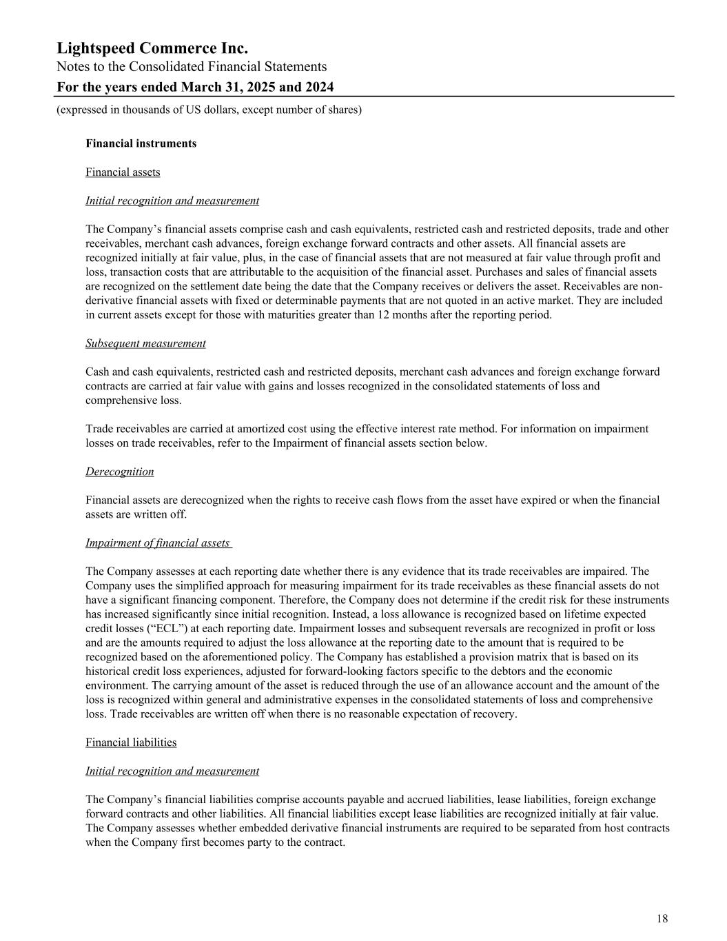 Financial instruments Financial assets Initial recognition and measurement The Company’s financial assets comprise cash and cash equivalents, restricted cash and restricted deposits, trade and other receivables, merchant cash advances, foreign exchange forward contracts and other assets. All financial assets are recognized initially at fair value, plus, in the case of financial assets that are not measured at fair value through profit and loss, transaction costs that are attributable to the acquisition of the financial asset. Purchases and sales of financial assets are recognized on the settlement date being the date that the Company receives or delivers the asset. Receivables are non- derivative financial assets with fixed or determinable payments that are not quoted in an active market. They are included in current assets except for those with maturities greater than 12 months after the reporting period. Subsequent measurement Cash and cash equivalents, restricted cash and restricted deposits, merchant cash advances and foreign exchange forward contracts are carried at fair value with gains and losses recognized in the consolidated statements of loss and comprehensive loss. Trade receivables are carried at amortized cost using the effective interest rate method. For information on impairment losses on trade receivables, refer to the Impairment of financial assets section below. Derecognition Financial assets are derecognized when the rights to receive cash flows from the asset have expired or when the financial assets are written off. Impairment of financial assets The Company assesses at each reporting date whether there is any evidence that its trade receivables are impaired. The Company uses the simplified approach for measuring impairment for its trade receivables as these financial assets do not have a significant financing component. Therefore, the Company does not determine if the credit risk for these instruments has increased significantly since initial recognition. Instead, a loss allowance is recognized based on lifetime expected credit losses (“ECL”) at each reporting date. Impairment losses and subsequent reversals are recognized in profit or loss and are the amounts required to adjust the loss allowance at the reporting date to the amount that is required to be recognized based on the aforementioned policy. The Company has established a provision matrix that is based on its historical credit loss experiences, adjusted for forward-looking factors specific to the debtors and the economic environment. The carrying amount of the asset is reduced through the use of an allowance account and the amount of the loss is recognized within general and administrative expenses in the consolidated statements of loss and comprehensive loss. Trade receivables are written off when there is no reasonable expectation of recovery. Financial liabilities Initial recognition and measurement The Company’s financial liabilities comprise accounts payable and accrued liabilities, lease liabilities, foreign exchange forward contracts and other liabilities. All financial liabilities except lease liabilities are recognized initially at fair value. The Company assesses whether embedded derivative financial instruments are required to be separated from host contracts when the Company first becomes party to the contract. Lightspeed Commerce Inc. Notes to the Consolidated Financial Statements For the years ended March 31, 2025 and 2024 (expressed in thousands of US dollars, except number of shares) 18