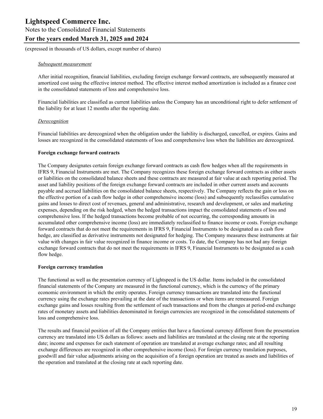Subsequent measurement After initial recognition, financial liabilities, excluding foreign exchange forward contracts, are subsequently measured at amortized cost using the effective interest method. The effective interest method amortization is included as a finance cost in the consolidated statements of loss and comprehensive loss. Financial liabilities are classified as current liabilities unless the Company has an unconditional right to defer settlement of the liability for at least 12 months after the reporting date. Derecognition Financial liabilities are derecognized when the obligation under the liability is discharged, cancelled, or expires. Gains and losses are recognized in the consolidated statements of loss and comprehensive loss when the liabilities are derecognized. Foreign exchange forward contracts The Company designates certain foreign exchange forward contracts as cash flow hedges when all the requirements in IFRS 9, Financial Instruments are met. The Company recognizes these foreign exchange forward contracts as either assets or liabilities on the consolidated balance sheets and these contracts are measured at fair value at each reporting period. The asset and liability positions of the foreign exchange forward contracts are included in other current assets and accounts payable and accrued liabilities on the consolidated balance sheets, respectively. The Company reflects the gain or loss on the effective portion of a cash flow hedge in other comprehensive income (loss) and subsequently reclassifies cumulative gains and losses to direct cost of revenues, general and administrative, research and development, or sales and marketing expenses, depending on the risk hedged, when the hedged transactions impact the consolidated statements of loss and comprehensive loss. If the hedged transactions become probable of not occurring, the corresponding amounts in accumulated other comprehensive income (loss) are immediately reclassified to finance income or costs. Foreign exchange forward contracts that do not meet the requirements in IFRS 9, Financial Instruments to be designated as a cash flow hedge, are classified as derivative instruments not designated for hedging. The Company measures these instruments at fair value with changes in fair value recognized in finance income or costs. To date, the Company has not had any foreign exchange forward contracts that do not meet the requirements in IFRS 9, Financial Instruments to be designated as a cash flow hedge. Foreign currency translation The functional as well as the presentation currency of Lightspeed is the US dollar. Items included in the consolidated financial statements of the Company are measured in the functional currency, which is the currency of the primary economic environment in which the entity operates. Foreign currency transactions are translated into the functional currency using the exchange rates prevailing at the date of the transactions or when items are remeasured. Foreign exchange gains and losses resulting from the settlement of such transactions and from the changes at period-end exchange rates of monetary assets and liabilities denominated in foreign currencies are recognized in the consolidated statements of loss and comprehensive loss. The results and financial position of all the Company entities that have a functional currency different from the presentation currency are translated into US dollars as follows: assets and liabilities are translated at the closing rate at the reporting date; income and expenses for each statement of operation are translated at average exchange rates; and all resulting exchange differences are recognized in other comprehensive income (loss). For foreign currency translation purposes, goodwill and fair value adjustments arising on the acquisition of a foreign operation are treated as assets and liabilities of the operation and translated at the closing rate at each reporting date. Lightspeed Commerce Inc. Notes to the Consolidated Financial Statements For the years ended March 31, 2025 and 2024 (expressed in thousands of US dollars, except number of shares) 19