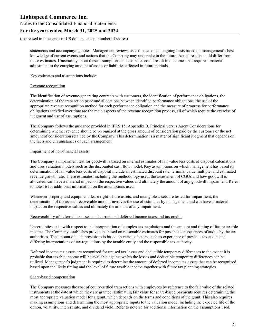 statements and accompanying notes. Management reviews its estimates on an ongoing basis based on management’s best knowledge of current events and actions that the Company may undertake in the future. Actual results could differ from those estimates. Uncertainty about these assumptions and estimates could result in outcomes that require a material adjustment to the carrying amount of assets or liabilities affected in future periods. Key estimates and assumptions include: Revenue recognition The identification of revenue-generating contracts with customers, the identification of performance obligations, the determination of the transaction price and allocations between identified performance obligations, the use of the appropriate revenue recognition method for each performance obligation and the measure of progress for performance obligations satisfied over time are the main aspects of the revenue recognition process, all of which require the exercise of judgment and use of assumptions. The Company follows the guidance provided in IFRS 15, Appendix B, Principal versus Agent Considerations for determining whether revenue should be recognized at the gross amount of consideration paid by the customer or the net amount of consideration retained by the Company. This determination is a matter of significant judgment that depends on the facts and circumstances of each arrangement. Impairment of non-financial assets The Company’s impairment test for goodwill is based on internal estimates of fair value less costs of disposal calculations and uses valuation models such as the discounted cash flow model. Key assumptions on which management has based its determination of fair value less costs of disposal include an estimated discount rate, terminal value multiple, and estimated revenue growth rate. These estimates, including the methodology used, the assessment of CGUs and how goodwill is allocated, can have a material impact on the respective values and ultimately the amount of any goodwill impairment. Refer to note 16 for additional information on the assumptions used. Whenever property and equipment, lease right-of-use assets, and intangible assets are tested for impairment, the determination of the assets’ recoverable amount involves the use of estimates by management and can have a material impact on the respective values and ultimately the amount of any impairment. Recoverability of deferred tax assets and current and deferred income taxes and tax credits Uncertainties exist with respect to the interpretation of complex tax regulations and the amount and timing of future taxable income. The Company establishes provisions based on reasonable estimates for possible consequences of audits by the tax authorities. The amount of such provisions is based on various factors, such as experience of previous tax audits and differing interpretations of tax regulations by the taxable entity and the responsible tax authority. Deferred income tax assets are recognized for unused tax losses and deductible temporary differences to the extent it is probable that taxable income will be available against which the losses and deductible temporary differences can be utilized. Management’s judgment is required to determine the amount of deferred income tax assets that can be recognized, based upon the likely timing and the level of future taxable income together with future tax planning strategies. Share-based compensation The Company measures the cost of equity-settled transactions with employees by reference to the fair value of the related instruments at the date at which they are granted. Estimating fair value for share-based payments requires determining the most appropriate valuation model for a grant, which depends on the terms and conditions of the grant. This also requires making assumptions and determining the most appropriate inputs to the valuation model including the expected life of the option, volatility, interest rate, and dividend yield. Refer to note 25 for additional information on the assumptions used. Lightspeed Commerce Inc. Notes to the Consolidated Financial Statements For the years ended March 31, 2025 and 2024 (expressed in thousands of US dollars, except number of shares) 21
