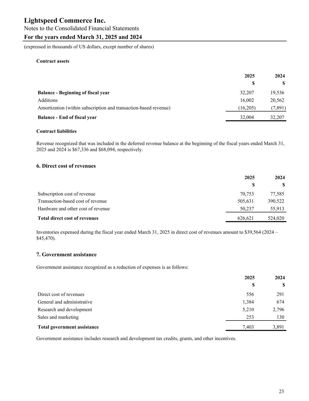 Contract assets 2025 2024 $ $ Balance - Beginning of fiscal year 32,207 19,536 Additions 16,002 20,562 Amortization (within subscription and transaction-based revenue) (16,205) (7,891) Balance - End of fiscal year 32,004 32,207 Contract liabilities Revenue recognized that was included in the deferred revenue balance at the beginning of the fiscal years ended March 31, 2025 and 2024 is $67,336 and $68,094, respectively. 6. Direct cost of revenues 2025 2024 $ $ Subscription cost of revenue 70,753 77,585 Transaction-based cost of revenue 505,631 390,522 Hardware and other cost of revenue 50,237 55,913 Total direct cost of revenues 626,621 524,020 Inventories expensed during the fiscal year ended March 31, 2025 in direct cost of revenues amount to $39,564 (2024 – $45,470). 7. Government assistance Government assistance recognized as a reduction of expenses is as follows: 2025 2024 $ $ Direct cost of revenues 556 291 General and administrative 1,384 674 Research and development 5,210 2,796 Sales and marketing 253 130 Total government assistance 7,403 3,891 Government assistance includes research and development tax credits, grants, and other incentives. Lightspeed Commerce Inc. Notes to the Consolidated Financial Statements For the years ended March 31, 2025 and 2024 (expressed in thousands of US dollars, except number of shares) 23