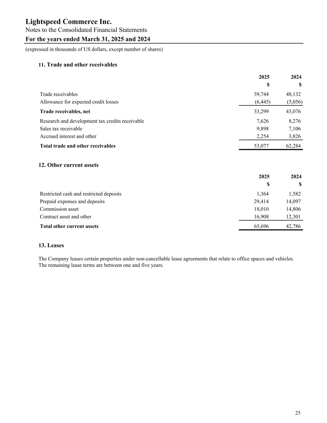 11. Trade and other receivables 2025 2024 $ $ Trade receivables 39,744 48,132 Allowance for expected credit losses (6,445) (5,056) Trade receivables, net 33,299 43,076 Research and development tax credits receivable 7,626 8,276 Sales tax receivable 9,898 7,106 Accrued interest and other 2,254 3,826 Total trade and other receivables 53,077 62,284 12. Other current assets 2025 2024 $ $ Restricted cash and restricted deposits 1,364 1,582 Prepaid expenses and deposits 29,414 14,097 Commission asset 18,010 14,806 Contract asset and other 16,908 12,301 Total other current assets 65,696 42,786 13. Leases The Company leases certain properties under non-cancellable lease agreements that relate to office spaces and vehicles. The remaining lease terms are between one and five years. Lightspeed Commerce Inc. Notes to the Consolidated Financial Statements For the years ended March 31, 2025 and 2024 (expressed in thousands of US dollars, except number of shares) 25