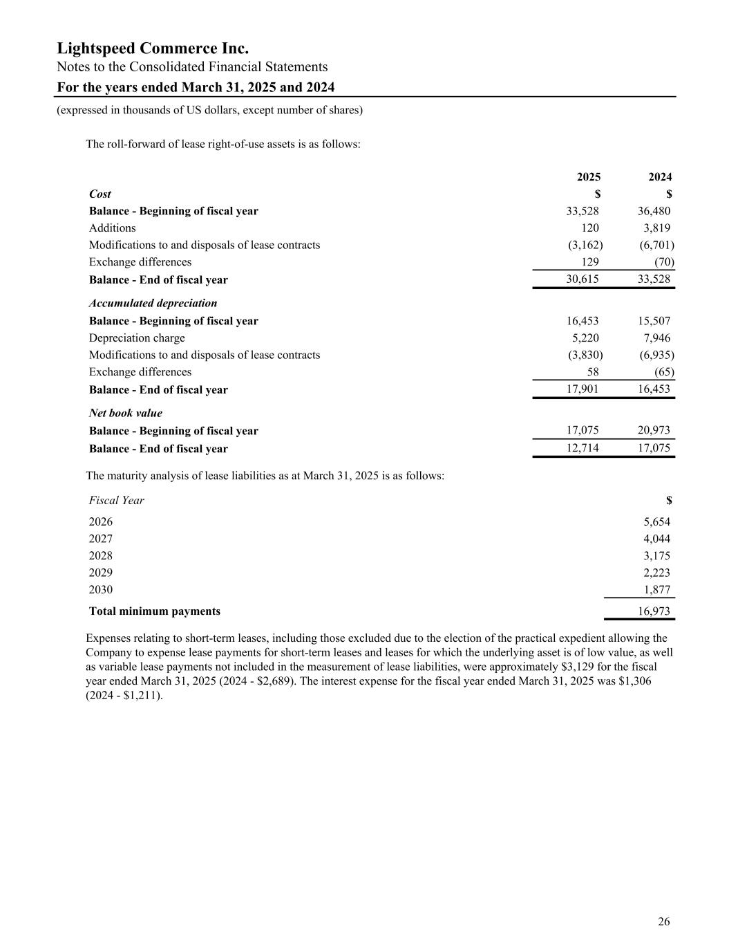 The roll-forward of lease right-of-use assets is as follows: 2025 2024 Cost $ $ Balance - Beginning of fiscal year 33,528 36,480 Additions 120 3,819 Modifications to and disposals of lease contracts (3,162) (6,701) Exchange differences 129 (70) Balance - End of fiscal year 30,615 33,528 Accumulated depreciation Balance - Beginning of fiscal year 16,453 15,507 Depreciation charge 5,220 7,946 Modifications to and disposals of lease contracts (3,830) (6,935) Exchange differences 58 (65) Balance - End of fiscal year 17,901 16,453 Net book value Balance - Beginning of fiscal year 17,075 20,973 Balance - End of fiscal year 12,714 17,075 The maturity analysis of lease liabilities as at March 31, 2025 is as follows: Fiscal Year $ 2026 5,654 2027 4,044 2028 3,175 2029 2,223 2030 1,877 Total minimum payments 16,973 Expenses relating to short-term leases, including those excluded due to the election of the practical expedient allowing the Company to expense lease payments for short-term leases and leases for which the underlying asset is of low value, as well as variable lease payments not included in the measurement of lease liabilities, were approximately $3,129 for the fiscal year ended March 31, 2025 (2024 - $2,689). The interest expense for the fiscal year ended March 31, 2025 was $1,306 (2024 - $1,211). Lightspeed Commerce Inc. Notes to the Consolidated Financial Statements For the years ended March 31, 2025 and 2024 (expressed in thousands of US dollars, except number of shares) 26