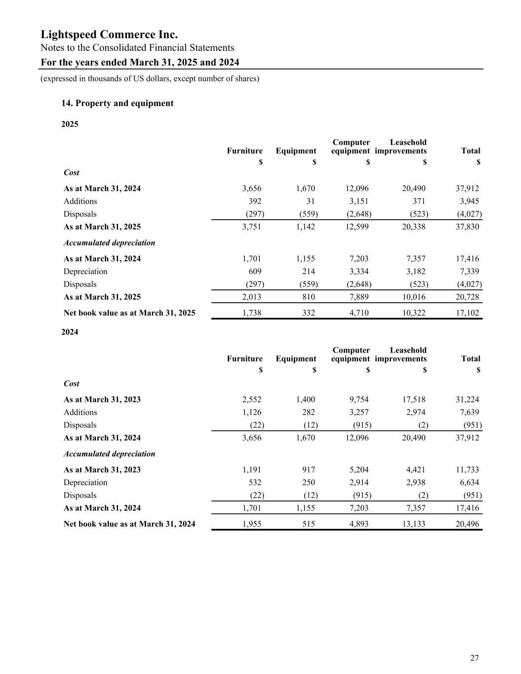 14. Property and equipment 2025 Furniture Equipment Computer equipment Leasehold improvements Total $ $ $ $ $ Cost As at March 31, 2024 3,656 1,670 12,096 20,490 37,912 Additions 392 31 3,151 371 3,945 Disposals (297) (559) (2,648) (523) (4,027) As at March 31, 2025 3,751 1,142 12,599 20,338 37,830 Accumulated depreciation As at March 31, 2024 1,701 1,155 7,203 7,357 17,416 Depreciation 609 214 3,334 3,182 7,339 Disposals (297) (559) (2,648) (523) (4,027) As at March 31, 2025 2,013 810 7,889 10,016 20,728 Net book value as at March 31, 2025 1,738 332 4,710 10,322 17,102 2024 Furniture Equipment Computer equipment Leasehold improvements Total $ $ $ $ $ Cost As at March 31, 2023 2,552 1,400 9,754 17,518 31,224 Additions 1,126 282 3,257 2,974 7,639 Disposals (22) (12) (915) (2) (951) As at March 31, 2024 3,656 1,670 12,096 20,490 37,912 Accumulated depreciation As at March 31, 2023 1,191 917 5,204 4,421 11,733 Depreciation 532 250 2,914 2,938 6,634 Disposals (22) (12) (915) (2) (951) As at March 31, 2024 1,701 1,155 7,203 7,357 17,416 Net book value as at March 31, 2024 1,955 515 4,893 13,133 20,496 Lightspeed Commerce Inc. Notes to the Consolidated Financial Statements For the years ended March 31, 2025 and 2024 (expressed in thousands of US dollars, except number of shares) 27