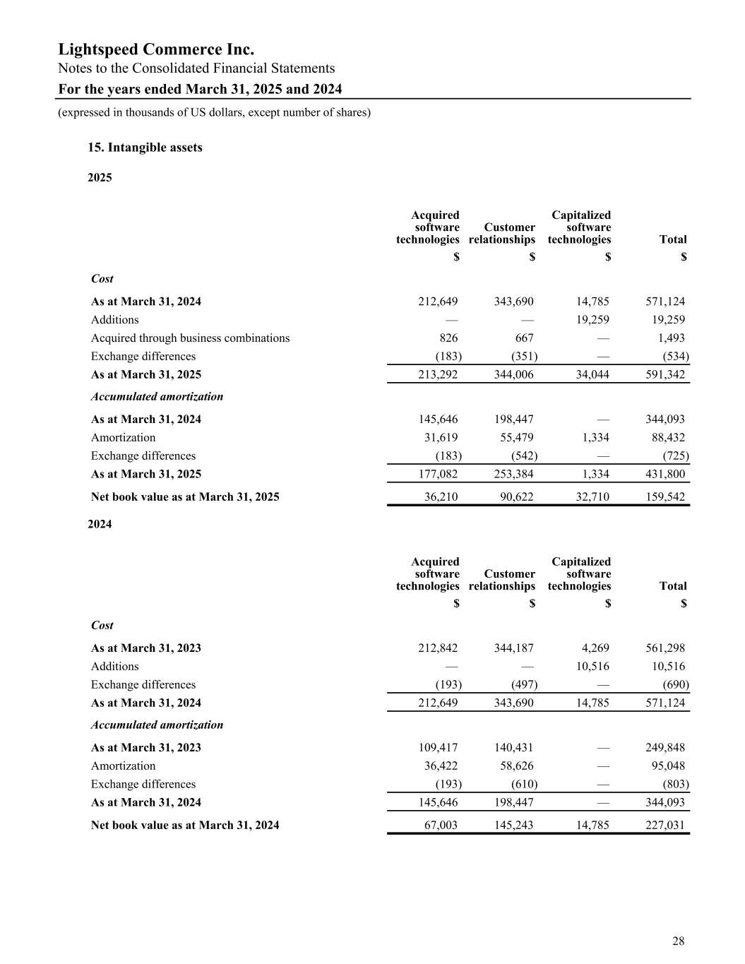 15. Intangible assets 2025 Acquired software technologies Customer relationships Capitalized software technologies Total $ $ $ $ Cost As at March 31, 2024 212,649 343,690 14,785 571,124 Additions — — 19,259 19,259 Acquired through business combinations 826 667 — 1,493 Exchange differences (183) (351) — (534) As at March 31, 2025 213,292 344,006 34,044 591,342 Accumulated amortization As at March 31, 2024 145,646 198,447 — 344,093 Amortization 31,619 55,479 1,334 88,432 Exchange differences (183) (542) — (725) As at March 31, 2025 177,082 253,384 1,334 431,800 Net book value as at March 31, 2025 36,210 90,622 32,710 159,542 2024 Acquired software technologies Customer relationships Capitalized software technologies Total $ $ $ $ Cost As at March 31, 2023 212,842 344,187 4,269 561,298 Additions — — 10,516 10,516 Exchange differences (193) (497) — (690) As at March 31, 2024 212,649 343,690 14,785 571,124 Accumulated amortization As at March 31, 2023 109,417 140,431 — 249,848 Amortization 36,422 58,626 — 95,048 Exchange differences (193) (610) — (803) As at March 31, 2024 145,646 198,447 — 344,093 Net book value as at March 31, 2024 67,003 145,243 14,785 227,031 Lightspeed Commerce Inc. Notes to the Consolidated Financial Statements For the years ended March 31, 2025 and 2024 (expressed in thousands of US dollars, except number of shares) 28