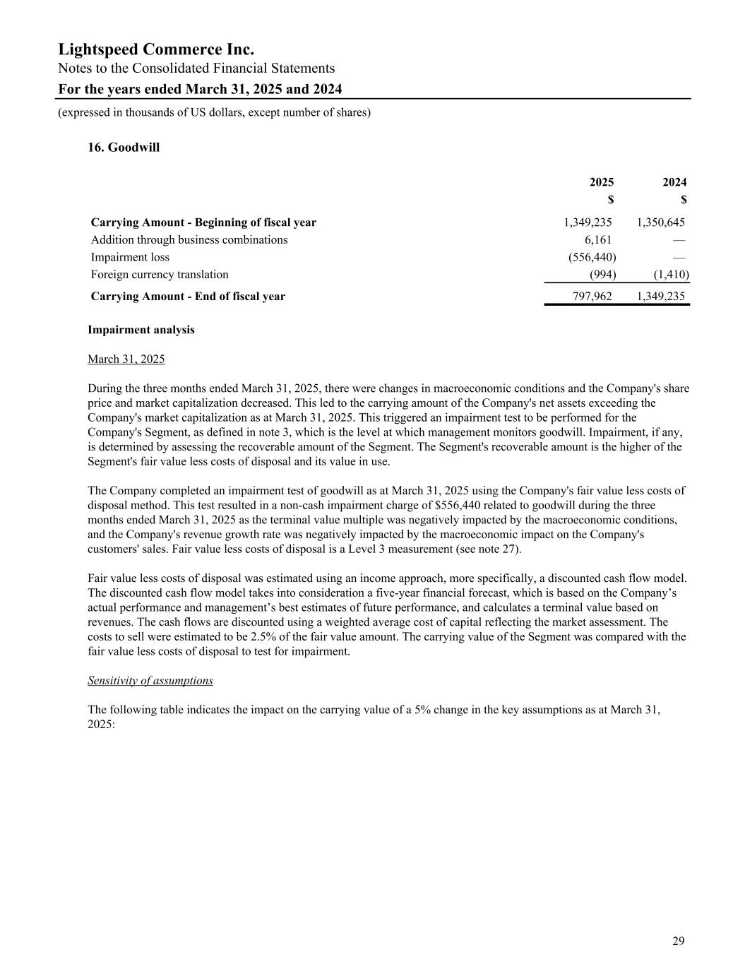 16. Goodwill 2025 2024 $ $ Carrying Amount - Beginning of fiscal year 1,349,235 1,350,645 Addition through business combinations 6,161 — Impairment loss (556,440) — Foreign currency translation (994) (1,410) Carrying Amount - End of fiscal year 797,962 1,349,235 Impairment analysis March 31, 2025 During the three months ended March 31, 2025, there were changes in macroeconomic conditions and the Company's share price and market capitalization decreased. This led to the carrying amount of the Company's net assets exceeding the Company's market capitalization as at March 31, 2025. This triggered an impairment test to be performed for the Company's Segment, as defined in note 3, which is the level at which management monitors goodwill. Impairment, if any, is determined by assessing the recoverable amount of the Segment. The Segment's recoverable amount is the higher of the Segment's fair value less costs of disposal and its value in use. The Company completed an impairment test of goodwill as at March 31, 2025 using the Company's fair value less costs of disposal method. This test resulted in a non-cash impairment charge of $556,440 related to goodwill during the three months ended March 31, 2025 as the terminal value multiple was negatively impacted by the macroeconomic conditions, and the Company's revenue growth rate was negatively impacted by the macroeconomic impact on the Company's customers' sales. Fair value less costs of disposal is a Level 3 measurement (see note 27). Fair value less costs of disposal was estimated using an income approach, more specifically, a discounted cash flow model. The discounted cash flow model takes into consideration a five-year financial forecast, which is based on the Company’s actual performance and management’s best estimates of future performance, and calculates a terminal value based on revenues. The cash flows are discounted using a weighted average cost of capital reflecting the market assessment. The costs to sell were estimated to be 2.5% of the fair value amount. The carrying value of the Segment was compared with the fair value less costs of disposal to test for impairment. Sensitivity of assumptions The following table indicates the impact on the carrying value of a 5% change in the key assumptions as at March 31, 2025: Lightspeed Commerce Inc. Notes to the Consolidated Financial Statements For the years ended March 31, 2025 and 2024 (expressed in thousands of US dollars, except number of shares) 29