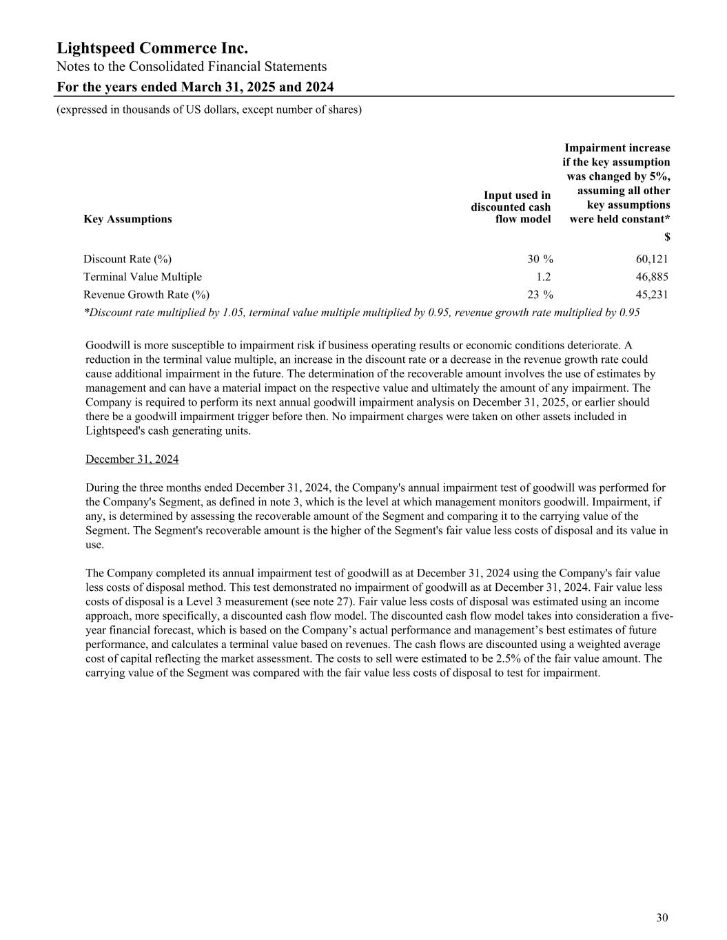 Key Assumptions Input used in discounted cash flow model Impairment increase if the key assumption was changed by 5%, assuming all other key assumptions were held constant* $ Discount Rate (%) 30 % 60,121 Terminal Value Multiple 1.2 46,885 Revenue Growth Rate (%) 23 % 45,231 *Discount rate multiplied by 1.05, terminal value multiple multiplied by 0.95, revenue growth rate multiplied by 0.95 Goodwill is more susceptible to impairment risk if business operating results or economic conditions deteriorate. A reduction in the terminal value multiple, an increase in the discount rate or a decrease in the revenue growth rate could cause additional impairment in the future. The determination of the recoverable amount involves the use of estimates by management and can have a material impact on the respective value and ultimately the amount of any impairment. The Company is required to perform its next annual goodwill impairment analysis on December 31, 2025, or earlier should there be a goodwill impairment trigger before then. No impairment charges were taken on other assets included in Lightspeed's cash generating units. December 31, 2024 During the three months ended December 31, 2024, the Company's annual impairment test of goodwill was performed for the Company's Segment, as defined in note 3, which is the level at which management monitors goodwill. Impairment, if any, is determined by assessing the recoverable amount of the Segment and comparing it to the carrying value of the Segment. The Segment's recoverable amount is the higher of the Segment's fair value less costs of disposal and its value in use. The Company completed its annual impairment test of goodwill as at December 31, 2024 using the Company's fair value less costs of disposal method. This test demonstrated no impairment of goodwill as at December 31, 2024. Fair value less costs of disposal is a Level 3 measurement (see note 27). Fair value less costs of disposal was estimated using an income approach, more specifically, a discounted cash flow model. The discounted cash flow model takes into consideration a five- year financial forecast, which is based on the Company’s actual performance and management’s best estimates of future performance, and calculates a terminal value based on revenues. The cash flows are discounted using a weighted average cost of capital reflecting the market assessment. The costs to sell were estimated to be 2.5% of the fair value amount. The carrying value of the Segment was compared with the fair value less costs of disposal to test for impairment. Lightspeed Commerce Inc. Notes to the Consolidated Financial Statements For the years ended March 31, 2025 and 2024 (expressed in thousands of US dollars, except number of shares) 30