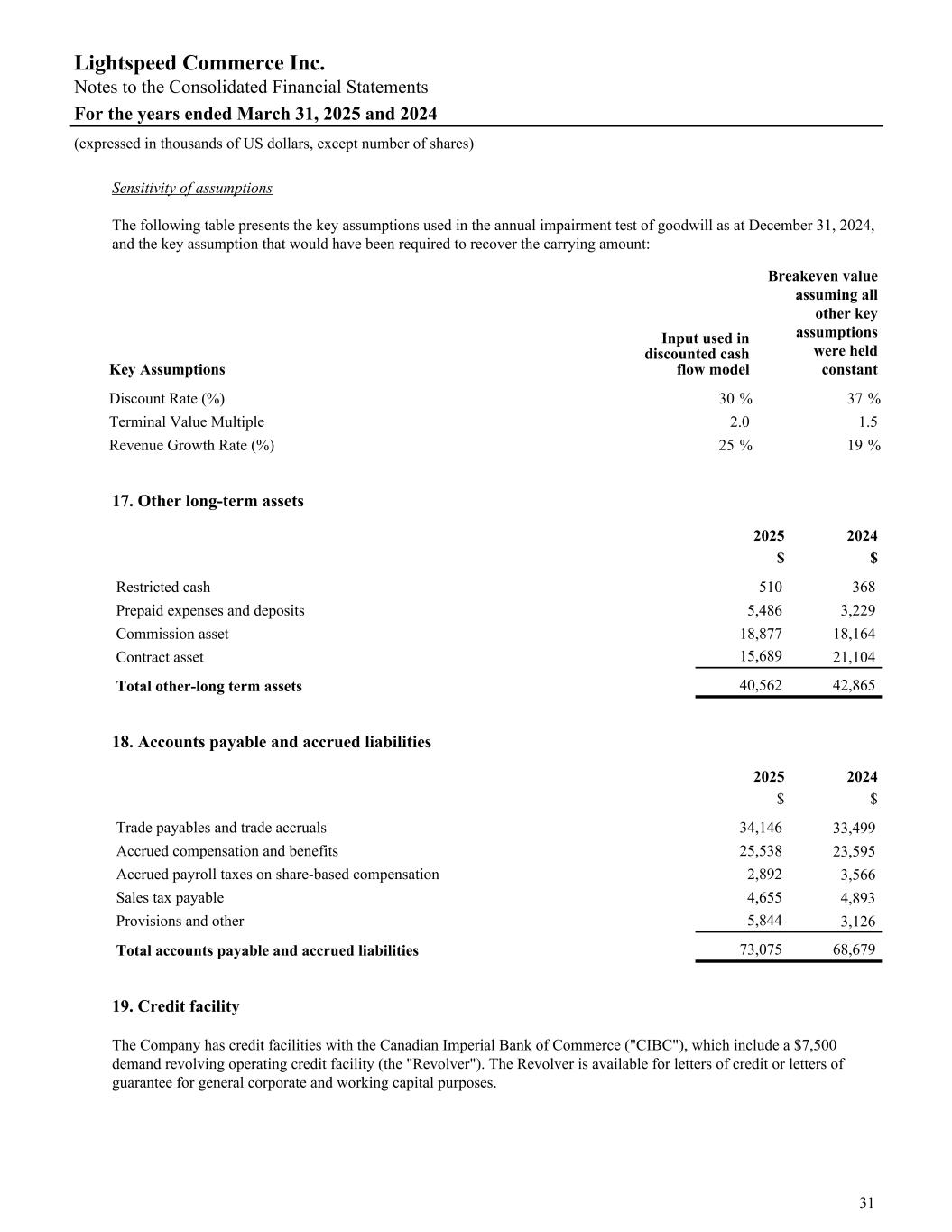 Sensitivity of assumptions The following table presents the key assumptions used in the annual impairment test of goodwill as at December 31, 2024, and the key assumption that would have been required to recover the carrying amount: Key Assumptions Input used in discounted cash flow model Breakeven value assuming all other key assumptions were held constant Discount Rate (%) 30 % 37 % Terminal Value Multiple 2.0 1.5 Revenue Growth Rate (%) 25 % 19 % 17. Other long-term assets 2025 2024 $ $ Restricted cash 510 368 Prepaid expenses and deposits 5,486 3,229 Commission asset 18,877 18,164 Contract asset 15,689 21,104 Total other-long term assets 40,562 42,865 18. Accounts payable and accrued liabilities 2025 2024 $ $ Trade payables and trade accruals 34,146 33,499 Accrued compensation and benefits 25,538 23,595 Accrued payroll taxes on share-based compensation 2,892 3,566 Sales tax payable 4,655 4,893 Provisions and other 5,844 3,126 Total accounts payable and accrued liabilities 73,075 68,679 19. Credit facility The Company has credit facilities with the Canadian Imperial Bank of Commerce ("CIBC"), which include a $7,500 demand revolving operating credit facility (the "Revolver"). The Revolver is available for letters of credit or letters of guarantee for general corporate and working capital purposes. Lightspeed Commerce Inc. Notes to the Consolidated Financial Statements For the years ended March 31, 2025 and 2024 (expressed in thousands of US dollars, except number of shares) 31