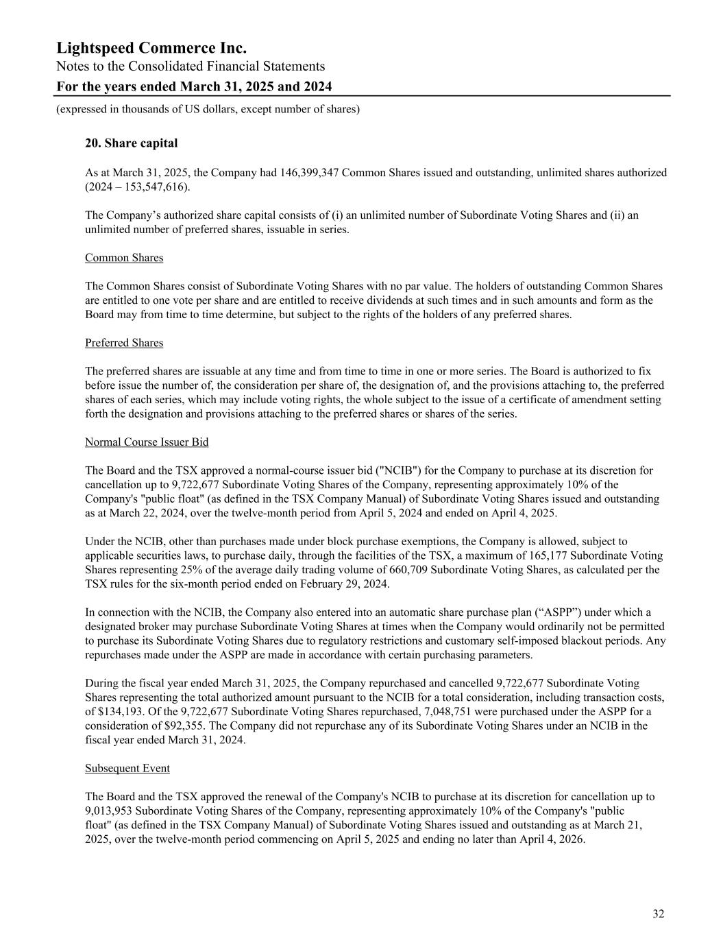 20. Share capital As at March 31, 2025, the Company had 146,399,347 Common Shares issued and outstanding, unlimited shares authorized (2024 – 153,547,616). The Company’s authorized share capital consists of (i) an unlimited number of Subordinate Voting Shares and (ii) an unlimited number of preferred shares, issuable in series. Common Shares The Common Shares consist of Subordinate Voting Shares with no par value. The holders of outstanding Common Shares are entitled to one vote per share and are entitled to receive dividends at such times and in such amounts and form as the Board may from time to time determine, but subject to the rights of the holders of any preferred shares. Preferred Shares The preferred shares are issuable at any time and from time to time in one or more series. The Board is authorized to fix before issue the number of, the consideration per share of, the designation of, and the provisions attaching to, the preferred shares of each series, which may include voting rights, the whole subject to the issue of a certificate of amendment setting forth the designation and provisions attaching to the preferred shares or shares of the series. Normal Course Issuer Bid The Board and the TSX approved a normal-course issuer bid ("NCIB") for the Company to purchase at its discretion for cancellation up to 9,722,677 Subordinate Voting Shares of the Company, representing approximately 10% of the Company's "public float" (as defined in the TSX Company Manual) of Subordinate Voting Shares issued and outstanding as at March 22, 2024, over the twelve-month period from April 5, 2024 and ended on April 4, 2025. Under the NCIB, other than purchases made under block purchase exemptions, the Company is allowed, subject to applicable securities laws, to purchase daily, through the facilities of the TSX, a maximum of 165,177 Subordinate Voting Shares representing 25% of the average daily trading volume of 660,709 Subordinate Voting Shares, as calculated per the TSX rules for the six-month period ended on February 29, 2024. In connection with the NCIB, the Company also entered into an automatic share purchase plan (“ASPP”) under which a designated broker may purchase Subordinate Voting Shares at times when the Company would ordinarily not be permitted to purchase its Subordinate Voting Shares due to regulatory restrictions and customary self-imposed blackout periods. Any repurchases made under the ASPP are made in accordance with certain purchasing parameters. During the fiscal year ended March 31, 2025, the Company repurchased and cancelled 9,722,677 Subordinate Voting Shares representing the total authorized amount pursuant to the NCIB for a total consideration, including transaction costs, of $134,193. Of the 9,722,677 Subordinate Voting Shares repurchased, 7,048,751 were purchased under the ASPP for a consideration of $92,355. The Company did not repurchase any of its Subordinate Voting Shares under an NCIB in the fiscal year ended March 31, 2024. Subsequent Event The Board and the TSX approved the renewal of the Company's NCIB to purchase at its discretion for cancellation up to 9,013,953 Subordinate Voting Shares of the Company, representing approximately 10% of the Company's "public float" (as defined in the TSX Company Manual) of Subordinate Voting Shares issued and outstanding as at March 21, 2025, over the twelve-month period commencing on April 5, 2025 and ending no later than April 4, 2026. Lightspeed Commerce Inc. Notes to the Consolidated Financial Statements For the years ended March 31, 2025 and 2024 (expressed in thousands of US dollars, except number of shares) 32