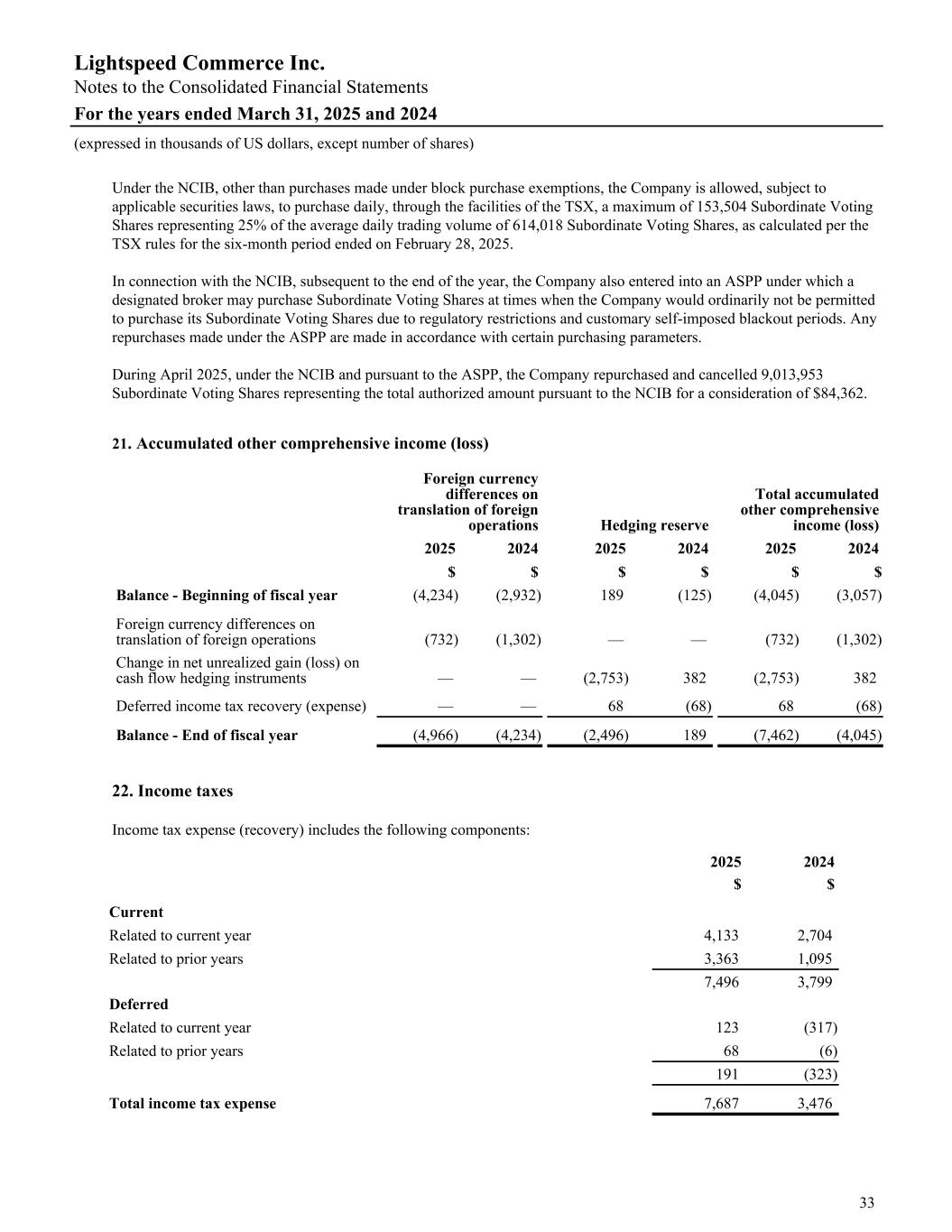 Under the NCIB, other than purchases made under block purchase exemptions, the Company is allowed, subject to applicable securities laws, to purchase daily, through the facilities of the TSX, a maximum of 153,504 Subordinate Voting Shares representing 25% of the average daily trading volume of 614,018 Subordinate Voting Shares, as calculated per the TSX rules for the six-month period ended on February 28, 2025. In connection with the NCIB, subsequent to the end of the year, the Company also entered into an ASPP under which a designated broker may purchase Subordinate Voting Shares at times when the Company would ordinarily not be permitted to purchase its Subordinate Voting Shares due to regulatory restrictions and customary self-imposed blackout periods. Any repurchases made under the ASPP are made in accordance with certain purchasing parameters. During April 2025, under the NCIB and pursuant to the ASPP, the Company repurchased and cancelled 9,013,953 Subordinate Voting Shares representing the total authorized amount pursuant to the NCIB for a consideration of $84,362. 21. Accumulated other comprehensive income (loss) Foreign currency differences on translation of foreign operations Hedging reserve Total accumulated other comprehensive income (loss) 2025 2024 2025 2024 2025 2024 $ $ $ $ $ $ Balance - Beginning of fiscal year (4,234) (2,932) 189 (125) (4,045) (3,057) Foreign currency differences on translation of foreign operations (732) (1,302) — — (732) (1,302) Change in net unrealized gain (loss) on cash flow hedging instruments — — (2,753) 382 (2,753) 382 Deferred income tax recovery (expense) — — 68 (68) 68 (68) Balance - End of fiscal year (4,966) (4,234) (2,496) 189 (7,462) (4,045) 22. Income taxes Income tax expense (recovery) includes the following components: 2025 2024 $ $ Current Related to current year 4,133 2,704 Related to prior years 3,363 1,095 7,496 3,799 Deferred Related to current year 123 (317) Related to prior years 68 (6) 191 (323) Total income tax expense 7,687 3,476 Lightspeed Commerce Inc. Notes to the Consolidated Financial Statements For the years ended March 31, 2025 and 2024 (expressed in thousands of US dollars, except number of shares) 33