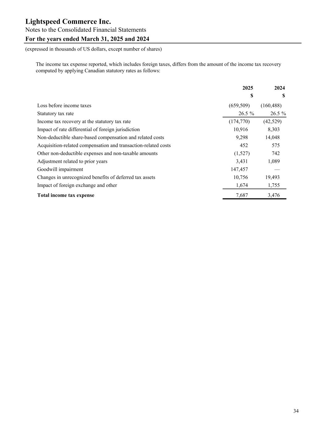The income tax expense reported, which includes foreign taxes, differs from the amount of the income tax recovery computed by applying Canadian statutory rates as follows: 2025 2024 $ $ Loss before income taxes (659,509) (160,488) Statutory tax rate 26.5 % 26.5 % Income tax recovery at the statutory tax rate (174,770) (42,529) Impact of rate differential of foreign jurisdiction 10,916 8,303 Non-deductible share-based compensation and related costs 9,298 14,048 Acquisition-related compensation and transaction-related costs 452 575 Other non-deductible expenses and non-taxable amounts (1,527) 742 Adjustment related to prior years 3,431 1,089 Goodwill impairment 147,457 — Changes in unrecognized benefits of deferred tax assets 10,756 19,493 Impact of foreign exchange and other 1,674 1,755 Total income tax expense 7,687 3,476 Lightspeed Commerce Inc. Notes to the Consolidated Financial Statements For the years ended March 31, 2025 and 2024 (expressed in thousands of US dollars, except number of shares) 34