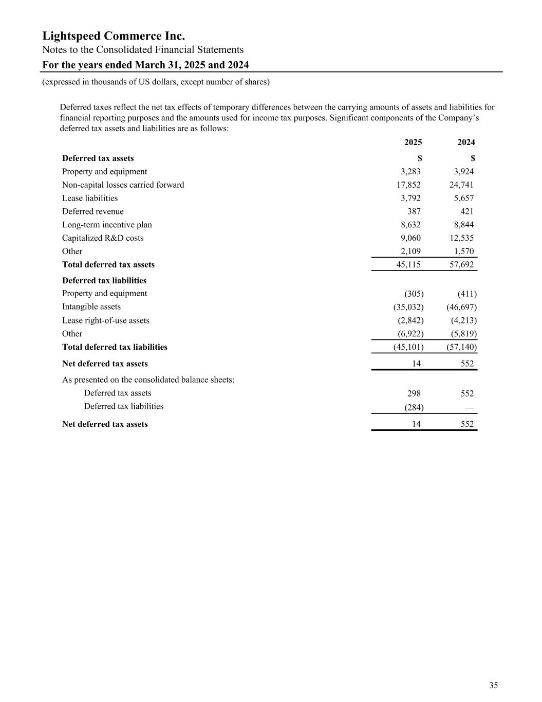 Deferred taxes reflect the net tax effects of temporary differences between the carrying amounts of assets and liabilities for financial reporting purposes and the amounts used for income tax purposes. Significant components of the Company’s deferred tax assets and liabilities are as follows: 2025 2024 Deferred tax assets $ $ Property and equipment 3,283 3,924 Non-capital losses carried forward 17,852 24,741 Lease liabilities 3,792 5,657 Deferred revenue 387 421 Long-term incentive plan 8,632 8,844 Capitalized R&D costs 9,060 12,535 Other 2,109 1,570 Total deferred tax assets 45,115 57,692 Deferred tax liabilities Property and equipment (305) (411) Intangible assets (35,032) (46,697) Lease right-of-use assets (2,842) (4,213) Other (6,922) (5,819) Total deferred tax liabilities (45,101) (57,140) Net deferred tax assets 14 552 As presented on the consolidated balance sheets: Deferred tax assets 298 552 Deferred tax liabilities (284) — Net deferred tax assets 14 552 Lightspeed Commerce Inc. Notes to the Consolidated Financial Statements For the years ended March 31, 2025 and 2024 (expressed in thousands of US dollars, except number of shares) 35