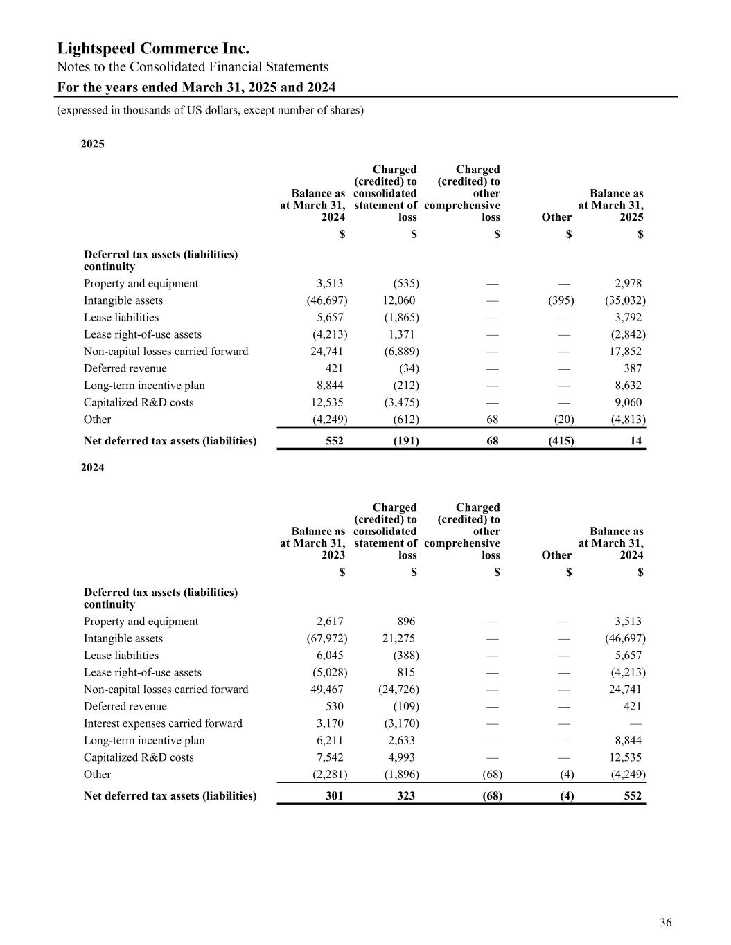 2025 Balance as at March 31, 2024 Charged (credited) to consolidated statement of loss Charged (credited) to other comprehensive loss Other Balance as at March 31, 2025 $ $ $ $ $ Deferred tax assets (liabilities) continuity Property and equipment 3,513 (535) — — 2,978 Intangible assets (46,697) 12,060 — (395) (35,032) Lease liabilities 5,657 (1,865) — — 3,792 Lease right-of-use assets (4,213) 1,371 — — (2,842) Non-capital losses carried forward 24,741 (6,889) — — 17,852 Deferred revenue 421 (34) — — 387 Long-term incentive plan 8,844 (212) — — 8,632 Capitalized R&D costs 12,535 (3,475) — — 9,060 Other (4,249) (612) 68 (20) (4,813) Net deferred tax assets (liabilities) 552 (191) 68 (415) 14 2024 Balance as at March 31, 2023 Charged (credited) to consolidated statement of loss Charged (credited) to other comprehensive loss Other Balance as at March 31, 2024 $ $ $ $ $ Deferred tax assets (liabilities) continuity Property and equipment 2,617 896 — — 3,513 Intangible assets (67,972) 21,275 — — (46,697) Lease liabilities 6,045 (388) — — 5,657 Lease right-of-use assets (5,028) 815 — — (4,213) Non-capital losses carried forward 49,467 (24,726) — — 24,741 Deferred revenue 530 (109) — — 421 Interest expenses carried forward 3,170 (3,170) — — — Long-term incentive plan 6,211 2,633 — — 8,844 Capitalized R&D costs 7,542 4,993 — — 12,535 Other (2,281) (1,896) (68) (4) (4,249) Net deferred tax assets (liabilities) 301 323 (68) (4) 552 Lightspeed Commerce Inc. Notes to the Consolidated Financial Statements For the years ended March 31, 2025 and 2024 (expressed in thousands of US dollars, except number of shares) 36
