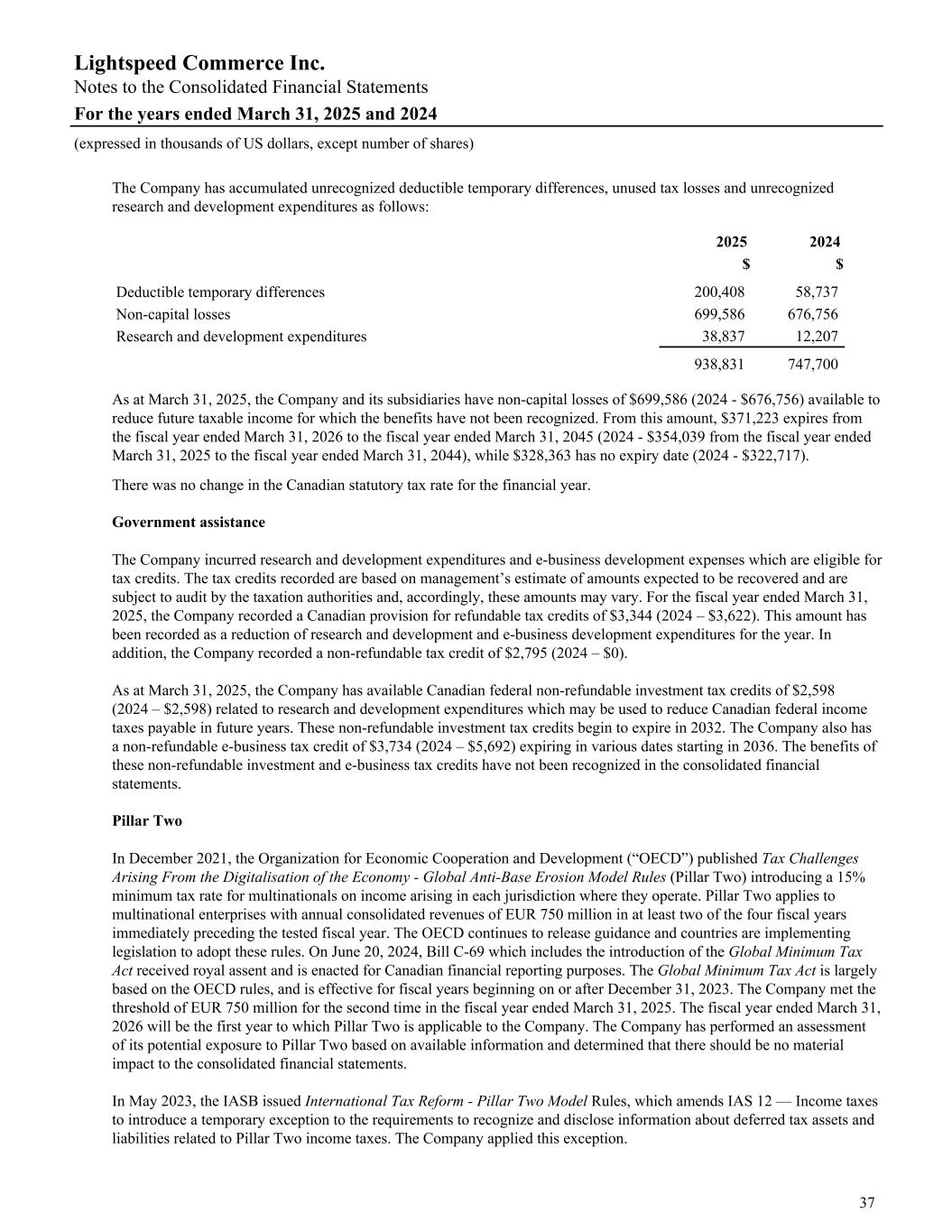 The Company has accumulated unrecognized deductible temporary differences, unused tax losses and unrecognized research and development expenditures as follows: 2025 2024 $ $ Deductible temporary differences 200,408 58,737 Non-capital losses 699,586 676,756 Research and development expenditures 38,837 12,207 938,831 747,700 As at March 31, 2025, the Company and its subsidiaries have non-capital losses of $699,586 (2024 - $676,756) available to reduce future taxable income for which the benefits have not been recognized. From this amount, $371,223 expires from the fiscal year ended March 31, 2026 to the fiscal year ended March 31, 2045 (2024 - $354,039 from the fiscal year ended March 31, 2025 to the fiscal year ended March 31, 2044), while $328,363 has no expiry date (2024 - $322,717). There was no change in the Canadian statutory tax rate for the financial year. Government assistance The Company incurred research and development expenditures and e-business development expenses which are eligible for tax credits. The tax credits recorded are based on management’s estimate of amounts expected to be recovered and are subject to audit by the taxation authorities and, accordingly, these amounts may vary. For the fiscal year ended March 31, 2025, the Company recorded a Canadian provision for refundable tax credits of $3,344 (2024 – $3,622). This amount has been recorded as a reduction of research and development and e-business development expenditures for the year. In addition, the Company recorded a non-refundable tax credit of $2,795 (2024 – $0). As at March 31, 2025, the Company has available Canadian federal non-refundable investment tax credits of $2,598 (2024 – $2,598) related to research and development expenditures which may be used to reduce Canadian federal income taxes payable in future years. These non-refundable investment tax credits begin to expire in 2032. The Company also has a non-refundable e-business tax credit of $3,734 (2024 – $5,692) expiring in various dates starting in 2036. The benefits of these non-refundable investment and e-business tax credits have not been recognized in the consolidated financial statements. Pillar Two In December 2021, the Organization for Economic Cooperation and Development (“OECD”) published Tax Challenges Arising From the Digitalisation of the Economy - Global Anti-Base Erosion Model Rules (Pillar Two) introducing a 15% minimum tax rate for multinationals on income arising in each jurisdiction where they operate. Pillar Two applies to multinational enterprises with annual consolidated revenues of EUR 750 million in at least two of the four fiscal years immediately preceding the tested fiscal year. The OECD continues to release guidance and countries are implementing legislation to adopt these rules. On June 20, 2024, Bill C-69 which includes the introduction of the Global Minimum Tax Act received royal assent and is enacted for Canadian financial reporting purposes. The Global Minimum Tax Act is largely based on the OECD rules, and is effective for fiscal years beginning on or after December 31, 2023. The Company met the threshold of EUR 750 million for the second time in the fiscal year ended March 31, 2025. The fiscal year ended March 31, 2026 will be the first year to which Pillar Two is applicable to the Company. The Company has performed an assessment of its potential exposure to Pillar Two based on available information and determined that there should be no material impact to the consolidated financial statements. In May 2023, the IASB issued International Tax Reform - Pillar Two Model Rules, which amends IAS 12 — Income taxes to introduce a temporary exception to the requirements to recognize and disclose information about deferred tax assets and liabilities related to Pillar Two income taxes. The Company applied this exception. Lightspeed Commerce Inc. Notes to the Consolidated Financial Statements For the years ended March 31, 2025 and 2024 (expressed in thousands of US dollars, except number of shares) 37