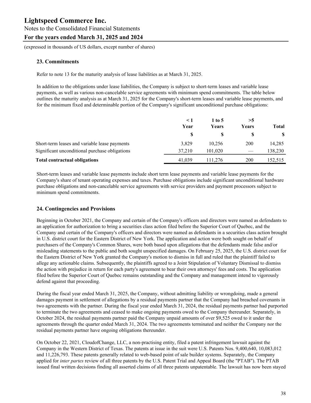 23. Commitments Refer to note 13 for the maturity analysis of lease liabilities as at March 31, 2025. In addition to the obligations under lease liabilities, the Company is subject to short-term leases and variable lease payments, as well as various non-cancelable service agreements with minimum spend commitments. The table below outlines the maturity analysis as at March 31, 2025 for the Company's short-term leases and variable lease payments, and for the minimum fixed and determinable portion of the Company's significant unconditional purchase obligations: < 1 Year 1 to 5 Years >5 Years Total $ $ $ $ Short-term leases and variable lease payments 3,829 10,256 200 14,285 Significant unconditional purchase obligations 37,210 101,020 — 138,230 Total contractual obligations 41,039 111,276 200 152,515 Short-term leases and variable lease payments include short term lease payments and variable lease payments for the Company's share of tenant operating expenses and taxes. Purchase obligations include significant unconditional hardware purchase obligations and non-cancelable service agreements with service providers and payment processors subject to minimum spend commitments. 24. Contingencies and Provisions Beginning in October 2021, the Company and certain of the Company's officers and directors were named as defendants to an application for authorization to bring a securities class action filed before the Superior Court of Quebec, and the Company and certain of the Company's officers and directors were named as defendants in a securities class action brought in U.S. district court for the Eastern District of New York. The application and action were both sought on behalf of purchasers of the Company's Common Shares, were both based upon allegations that the defendants made false and/or misleading statements to the public and both sought unspecified damages. On February 25, 2025, the U.S. district court for the Eastern District of New York granted the Company's motion to dismiss in full and ruled that the plaintiff failed to allege any actionable claims. Subsequently, the plaintiffs agreed to a Joint Stipulation of Voluntary Dismissal to dismiss the action with prejudice in return for each party's agreement to bear their own attorneys' fees and costs. The application filed before the Superior Court of Quebec remains outstanding and the Company and management intend to vigorously defend against that proceeding. During the fiscal year ended March 31, 2025, the Company, without admitting liability or wrongdoing, made a general damages payment in settlement of allegations by a residual payments partner that the Company had breached covenants in two agreements with the partner. During the fiscal year ended March 31, 2024, the residual payments partner had purported to terminate the two agreements and ceased to make ongoing payments owed to the Company thereunder. Separately, in October 2024, the residual payments partner paid the Company unpaid amounts of over $9,525 owed to it under the agreements through the quarter ended March 31, 2024. The two agreements terminated and neither the Company nor the residual payments partner have ongoing obligations thereunder. On October 22, 2021, CloudofChange, LLC, a non-practising entity, filed a patent infringement lawsuit against the Company in the Western District of Texas. The patents at issue in the suit were U.S. Patents Nos. 9,400,640, 10,083,012 and 11,226,793. These patents generally related to web-based point of sale builder systems. Separately, the Company applied for inter partes review of all three patents by the U.S. Patent Trial and Appeal Board (the "PTAB"). The PTAB issued final written decisions finding all asserted claims of all three patents unpatentable. The lawsuit has now been stayed Lightspeed Commerce Inc. Notes to the Consolidated Financial Statements For the years ended March 31, 2025 and 2024 (expressed in thousands of US dollars, except number of shares) 38