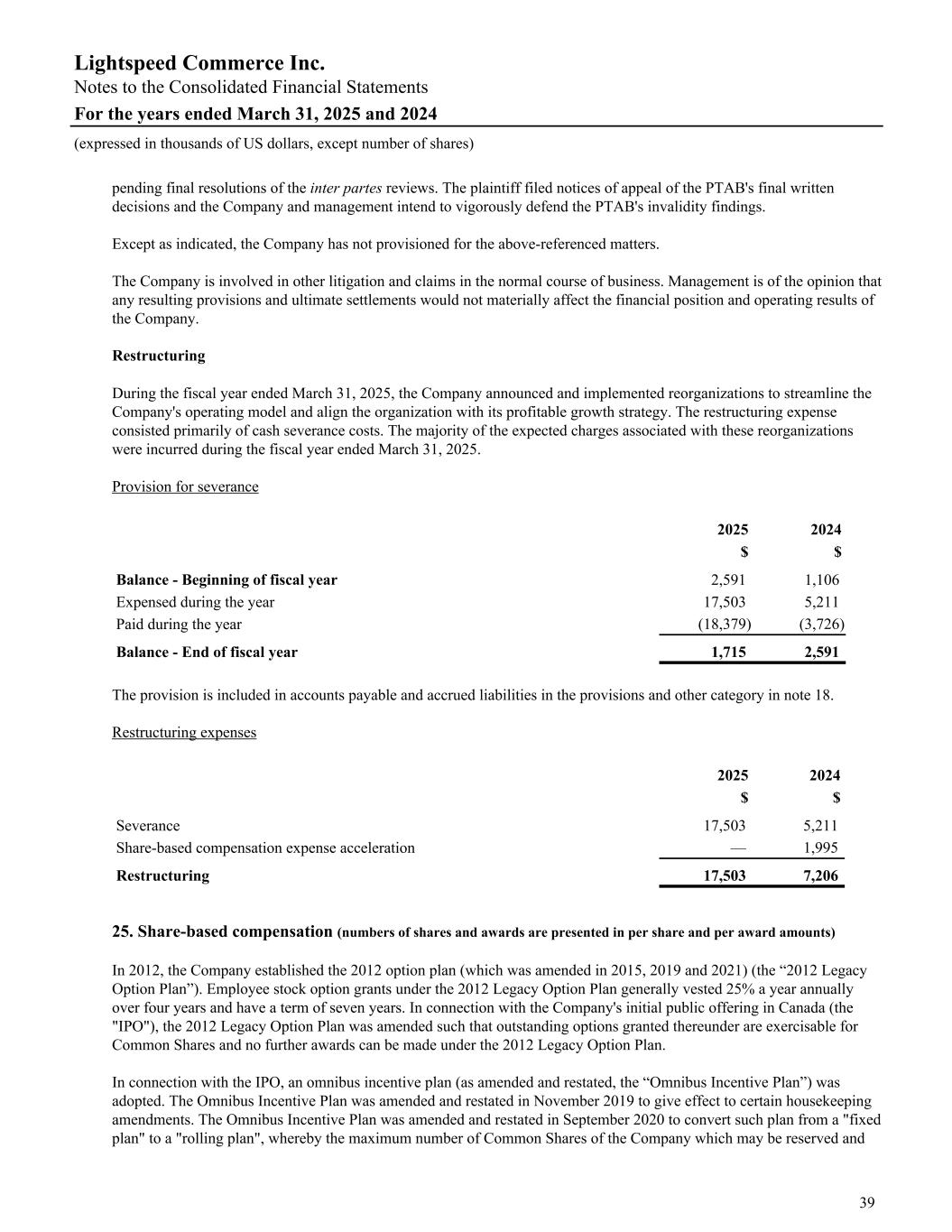 pending final resolutions of the inter partes reviews. The plaintiff filed notices of appeal of the PTAB's final written decisions and the Company and management intend to vigorously defend the PTAB's invalidity findings. Except as indicated, the Company has not provisioned for the above-referenced matters. The Company is involved in other litigation and claims in the normal course of business. Management is of the opinion that any resulting provisions and ultimate settlements would not materially affect the financial position and operating results of the Company. Restructuring During the fiscal year ended March 31, 2025, the Company announced and implemented reorganizations to streamline the Company's operating model and align the organization with its profitable growth strategy. The restructuring expense consisted primarily of cash severance costs. The majority of the expected charges associated with these reorganizations were incurred during the fiscal year ended March 31, 2025. Provision for severance 2025 2024 $ $ Balance - Beginning of fiscal year 2,591 1,106 Expensed during the year 17,503 5,211 Paid during the year (18,379) (3,726) Balance - End of fiscal year 1,715 2,591 The provision is included in accounts payable and accrued liabilities in the provisions and other category in note 18. Restructuring expenses 2025 2024 $ $ Severance 17,503 5,211 Share-based compensation expense acceleration — 1,995 Restructuring 17,503 7,206 25. Share-based compensation (numbers of shares and awards are presented in per share and per award amounts) In 2012, the Company established the 2012 option plan (which was amended in 2015, 2019 and 2021) (the “2012 Legacy Option Plan”). Employee stock option grants under the 2012 Legacy Option Plan generally vested 25% a year annually over four years and have a term of seven years. In connection with the Company's initial public offering in Canada (the "IPO"), the 2012 Legacy Option Plan was amended such that outstanding options granted thereunder are exercisable for Common Shares and no further awards can be made under the 2012 Legacy Option Plan. In connection with the IPO, an omnibus incentive plan (as amended and restated, the “Omnibus Incentive Plan”) was adopted. The Omnibus Incentive Plan was amended and restated in November 2019 to give effect to certain housekeeping amendments. The Omnibus Incentive Plan was amended and restated in September 2020 to convert such plan from a "fixed plan" to a "rolling plan", whereby the maximum number of Common Shares of the Company which may be reserved and Lightspeed Commerce Inc. Notes to the Consolidated Financial Statements For the years ended March 31, 2025 and 2024 (expressed in thousands of US dollars, except number of shares) 39