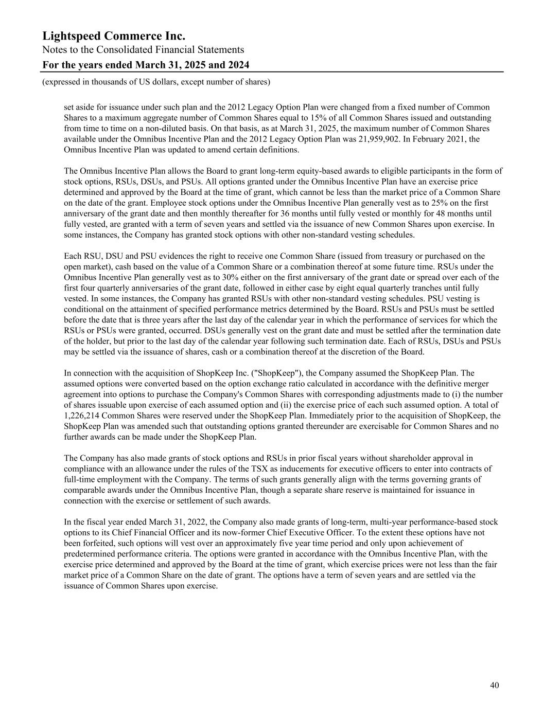 set aside for issuance under such plan and the 2012 Legacy Option Plan were changed from a fixed number of Common Shares to a maximum aggregate number of Common Shares equal to 15% of all Common Shares issued and outstanding from time to time on a non-diluted basis. On that basis, as at March 31, 2025, the maximum number of Common Shares available under the Omnibus Incentive Plan and the 2012 Legacy Option Plan was 21,959,902. In February 2021, the Omnibus Incentive Plan was updated to amend certain definitions. The Omnibus Incentive Plan allows the Board to grant long-term equity-based awards to eligible participants in the form of stock options, RSUs, DSUs, and PSUs. All options granted under the Omnibus Incentive Plan have an exercise price determined and approved by the Board at the time of grant, which cannot be less than the market price of a Common Share on the date of the grant. Employee stock options under the Omnibus Incentive Plan generally vest as to 25% on the first anniversary of the grant date and then monthly thereafter for 36 months until fully vested or monthly for 48 months until fully vested, are granted with a term of seven years and settled via the issuance of new Common Shares upon exercise. In some instances, the Company has granted stock options with other non-standard vesting schedules. Each RSU, DSU and PSU evidences the right to receive one Common Share (issued from treasury or purchased on the open market), cash based on the value of a Common Share or a combination thereof at some future time. RSUs under the Omnibus Incentive Plan generally vest as to 30% either on the first anniversary of the grant date or spread over each of the first four quarterly anniversaries of the grant date, followed in either case by eight equal quarterly tranches until fully vested. In some instances, the Company has granted RSUs with other non-standard vesting schedules. PSU vesting is conditional on the attainment of specified performance metrics determined by the Board. RSUs and PSUs must be settled before the date that is three years after the last day of the calendar year in which the performance of services for which the RSUs or PSUs were granted, occurred. DSUs generally vest on the grant date and must be settled after the termination date of the holder, but prior to the last day of the calendar year following such termination date. Each of RSUs, DSUs and PSUs may be settled via the issuance of shares, cash or a combination thereof at the discretion of the Board. In connection with the acquisition of ShopKeep Inc. ("ShopKeep"), the Company assumed the ShopKeep Plan. The assumed options were converted based on the option exchange ratio calculated in accordance with the definitive merger agreement into options to purchase the Company's Common Shares with corresponding adjustments made to (i) the number of shares issuable upon exercise of each assumed option and (ii) the exercise price of each such assumed option. A total of 1,226,214 Common Shares were reserved under the ShopKeep Plan. Immediately prior to the acquisition of ShopKeep, the ShopKeep Plan was amended such that outstanding options granted thereunder are exercisable for Common Shares and no further awards can be made under the ShopKeep Plan. The Company has also made grants of stock options and RSUs in prior fiscal years without shareholder approval in compliance with an allowance under the rules of the TSX as inducements for executive officers to enter into contracts of full-time employment with the Company. The terms of such grants generally align with the terms governing grants of comparable awards under the Omnibus Incentive Plan, though a separate share reserve is maintained for issuance in connection with the exercise or settlement of such awards. In the fiscal year ended March 31, 2022, the Company also made grants of long-term, multi-year performance-based stock options to its Chief Financial Officer and its now-former Chief Executive Officer. To the extent these options have not been forfeited, such options will vest over an approximately five year time period and only upon achievement of predetermined performance criteria. The options were granted in accordance with the Omnibus Incentive Plan, with the exercise price determined and approved by the Board at the time of grant, which exercise prices were not less than the fair market price of a Common Share on the date of grant. The options have a term of seven years and are settled via the issuance of Common Shares upon exercise. Lightspeed Commerce Inc. Notes to the Consolidated Financial Statements For the years ended March 31, 2025 and 2024 (expressed in thousands of US dollars, except number of shares) 40