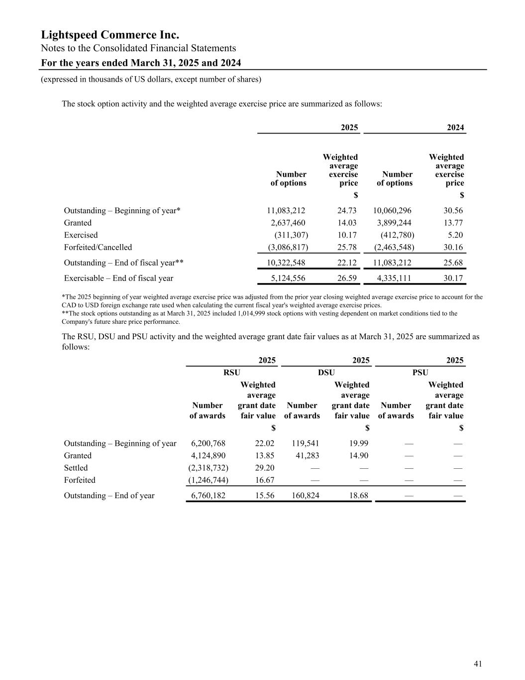 The stock option activity and the weighted average exercise price are summarized as follows: 2025 2024 Number of options Weighted average exercise price Number of options Weighted average exercise price $ $ Outstanding – Beginning of year* 11,083,212 24.73 10,060,296 30.56 Granted 2,637,460 14.03 3,899,244 13.77 Exercised (311,307) 10.17 (412,780) 5.20 Forfeited/Cancelled (3,086,817) 25.78 (2,463,548) 30.16 Outstanding – End of fiscal year** 10,322,548 22.12 11,083,212 25.68 Exercisable – End of fiscal year 5,124,556 26.59 4,335,111 30.17 *The 2025 beginning of year weighted average exercise price was adjusted from the prior year closing weighted average exercise price to account for the CAD to USD foreign exchange rate used when calculating the current fiscal year's weighted average exercise prices. **The stock options outstanding as at March 31, 2025 included 1,014,999 stock options with vesting dependent on market conditions tied to the Company's future share price performance. The RSU, DSU and PSU activity and the weighted average grant date fair values as at March 31, 2025 are summarized as follows: 2025 2025 2025 RSU DSU PSU Number of awards Weighted average grant date fair value Number of awards Weighted average grant date fair value Number of awards Weighted average grant date fair value $ $ $ Outstanding – Beginning of year 6,200,768 22.02 119,541 19.99 — — Granted 4,124,890 13.85 41,283 14.90 — — Settled (2,318,732) 29.20 — — — — Forfeited (1,246,744) 16.67 — — — — Outstanding – End of year 6,760,182 15.56 160,824 18.68 — — Lightspeed Commerce Inc. Notes to the Consolidated Financial Statements For the years ended March 31, 2025 and 2024 (expressed in thousands of US dollars, except number of shares) 41