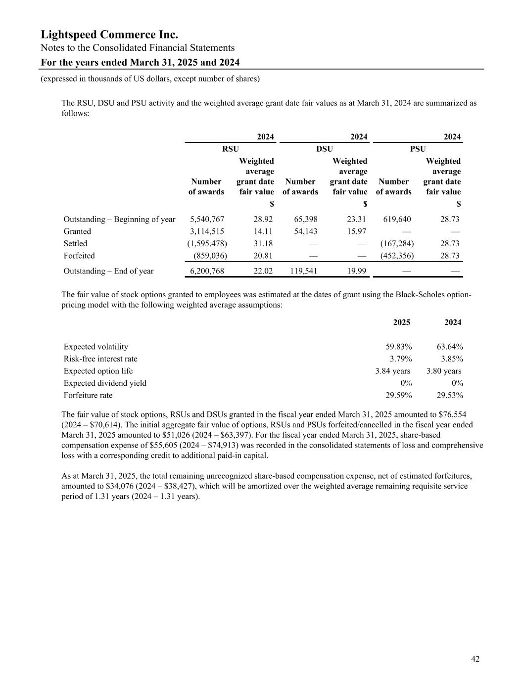 The RSU, DSU and PSU activity and the weighted average grant date fair values as at March 31, 2024 are summarized as follows: 2024 2024 2024 RSU DSU PSU Number of awards Weighted average grant date fair value Number of awards Weighted average grant date fair value Number of awards Weighted average grant date fair value $ $ $ Outstanding – Beginning of year 5,540,767 28.92 65,398 23.31 619,640 28.73 Granted 3,114,515 14.11 54,143 15.97 — — Settled (1,595,478) 31.18 — — (167,284) 28.73 Forfeited (859,036) 20.81 — — (452,356) 28.73 Outstanding – End of year 6,200,768 22.02 119,541 19.99 — — The fair value of stock options granted to employees was estimated at the dates of grant using the Black-Scholes option- pricing model with the following weighted average assumptions: 2025 2024 Expected volatility 59.83 % 63.64 % Risk-free interest rate 3.79 % 3.85 % Expected option life 3.84 years 3.80 years Expected dividend yield 0 % 0 % Forfeiture rate 29.59 % 29.53 % The fair value of stock options, RSUs and DSUs granted in the fiscal year ended March 31, 2025 amounted to $76,554 (2024 – $70,614). The initial aggregate fair value of options, RSUs and PSUs forfeited/cancelled in the fiscal year ended March 31, 2025 amounted to $51,026 (2024 – $63,397). For the fiscal year ended March 31, 2025, share-based compensation expense of $55,605 (2024 – $74,913) was recorded in the consolidated statements of loss and comprehensive loss with a corresponding credit to additional paid-in capital. As at March 31, 2025, the total remaining unrecognized share-based compensation expense, net of estimated forfeitures, amounted to $34,076 (2024 – $38,427), which will be amortized over the weighted average remaining requisite service period of 1.31 years (2024 – 1.31 years). Lightspeed Commerce Inc. Notes to the Consolidated Financial Statements For the years ended March 31, 2025 and 2024 (expressed in thousands of US dollars, except number of shares) 42