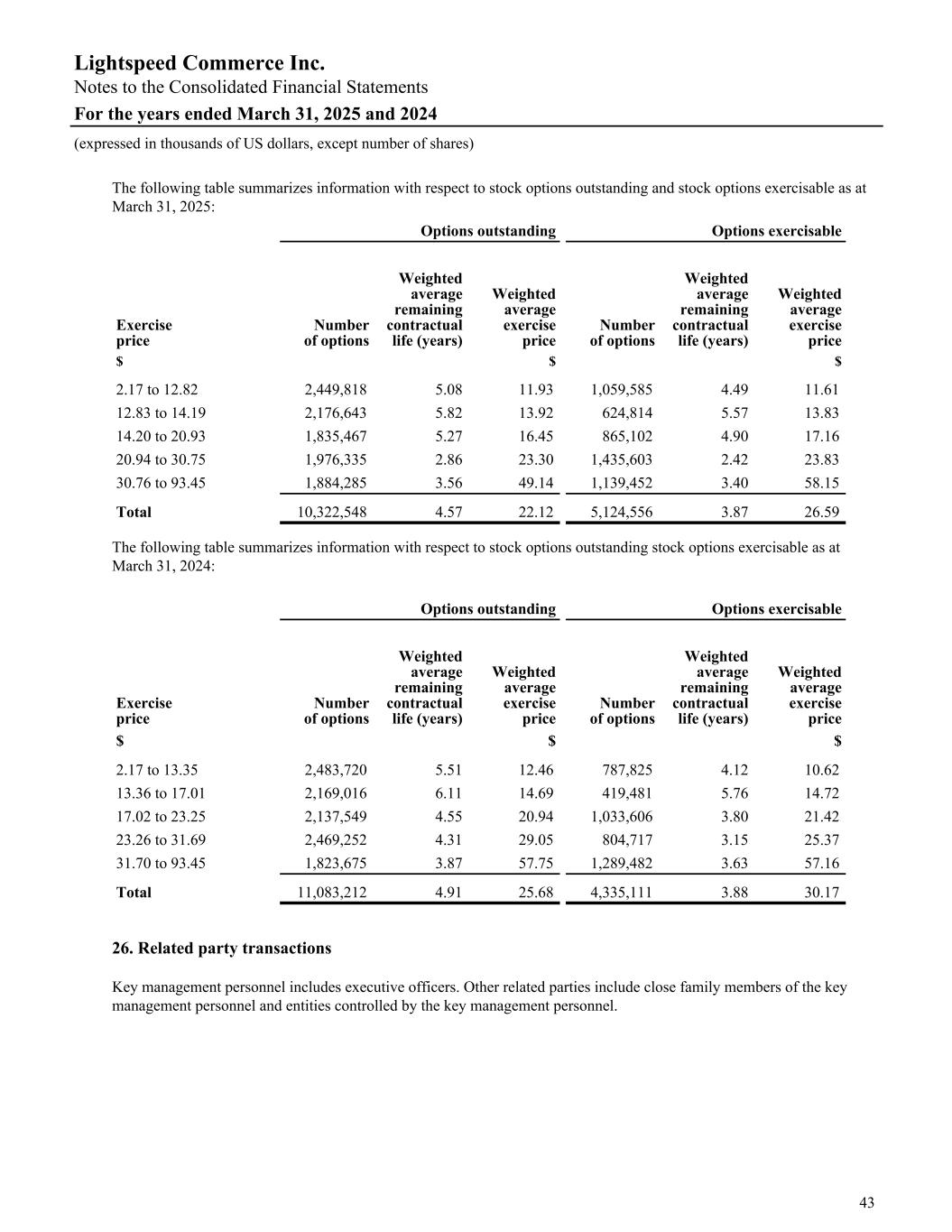 The following table summarizes information with respect to stock options outstanding and stock options exercisable as at March 31, 2025: Options outstanding Options exercisable Exercise price Number of options Weighted average remaining contractual life (years) Weighted average exercise price Number of options Weighted average remaining contractual life (years) Weighted average exercise price $ $ $ 2.17 to 12.82 2,449,818 5.08 11.93 1,059,585 4.49 11.61 12.83 to 14.19 2,176,643 5.82 13.92 624,814 5.57 13.83 14.20 to 20.93 1,835,467 5.27 16.45 865,102 4.90 17.16 20.94 to 30.75 1,976,335 2.86 23.30 1,435,603 2.42 23.83 30.76 to 93.45 1,884,285 3.56 49.14 1,139,452 3.40 58.15 Total 10,322,548 4.57 22.12 5,124,556 3.87 26.59 The following table summarizes information with respect to stock options outstanding stock options exercisable as at March 31, 2024: Options outstanding Options exercisable Exercise price Number of options Weighted average remaining contractual life (years) Weighted average exercise price Number of options Weighted average remaining contractual life (years) Weighted average exercise price $ $ $ 2.17 to 13.35 2,483,720 5.51 12.46 787,825 4.12 10.62 13.36 to 17.01 2,169,016 6.11 14.69 419,481 5.76 14.72 17.02 to 23.25 2,137,549 4.55 20.94 1,033,606 3.80 21.42 23.26 to 31.69 2,469,252 4.31 29.05 804,717 3.15 25.37 31.70 to 93.45 1,823,675 3.87 57.75 1,289,482 3.63 57.16 Total 11,083,212 4.91 25.68 4,335,111 3.88 30.17 26. Related party transactions Key management personnel includes executive officers. Other related parties include close family members of the key management personnel and entities controlled by the key management personnel. Lightspeed Commerce Inc. Notes to the Consolidated Financial Statements For the years ended March 31, 2025 and 2024 (expressed in thousands of US dollars, except number of shares) 43