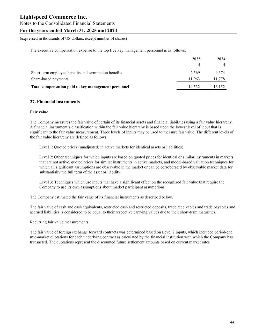The executive compensation expense to the top five key management personnel is as follows: 2025 2024 $ $ Short-term employee benefits and termination benefits 2,569 4,374 Share-based payments 11,963 11,778 Total compensation paid to key management personnel 14,532 16,152 27. Financial instruments Fair value The Company measures the fair value of certain of its financial assets and financial liabilities using a fair value hierarchy. A financial instrument’s classification within the fair value hierarchy is based upon the lowest level of input that is significant to the fair value measurement. Three levels of inputs may be used to measure fair value. The different levels of the fair value hierarchy are defined as follows: Level 1: Quoted prices (unadjusted) in active markets for identical assets or liabilities; Level 2: Other techniques for which inputs are based on quoted prices for identical or similar instruments in markets that are not active, quoted prices for similar instruments in active markets, and model-based valuation techniques for which all significant assumptions are observable in the market or can be corroborated by observable market data for substantially the full term of the asset or liability; Level 3: Techniques which use inputs that have a significant effect on the recognized fair value that require the Company to use its own assumptions about market participant assumptions. The Company estimated the fair value of its financial instruments as described below. The fair value of cash and cash equivalents, restricted cash and restricted deposits, trade receivables and trade payables and accrued liabilities is considered to be equal to their respective carrying values due to their short-term maturities. Recurring fair value measurements The fair value of foreign exchange forward contracts was determined based on Level 2 inputs, which included period-end mid-market quotations for each underlying contract as calculated by the financial institution with which the Company has transacted. The quotations represent the discounted future settlement amounts based on current market rates. Lightspeed Commerce Inc. Notes to the Consolidated Financial Statements For the years ended March 31, 2025 and 2024 (expressed in thousands of US dollars, except number of shares) 44