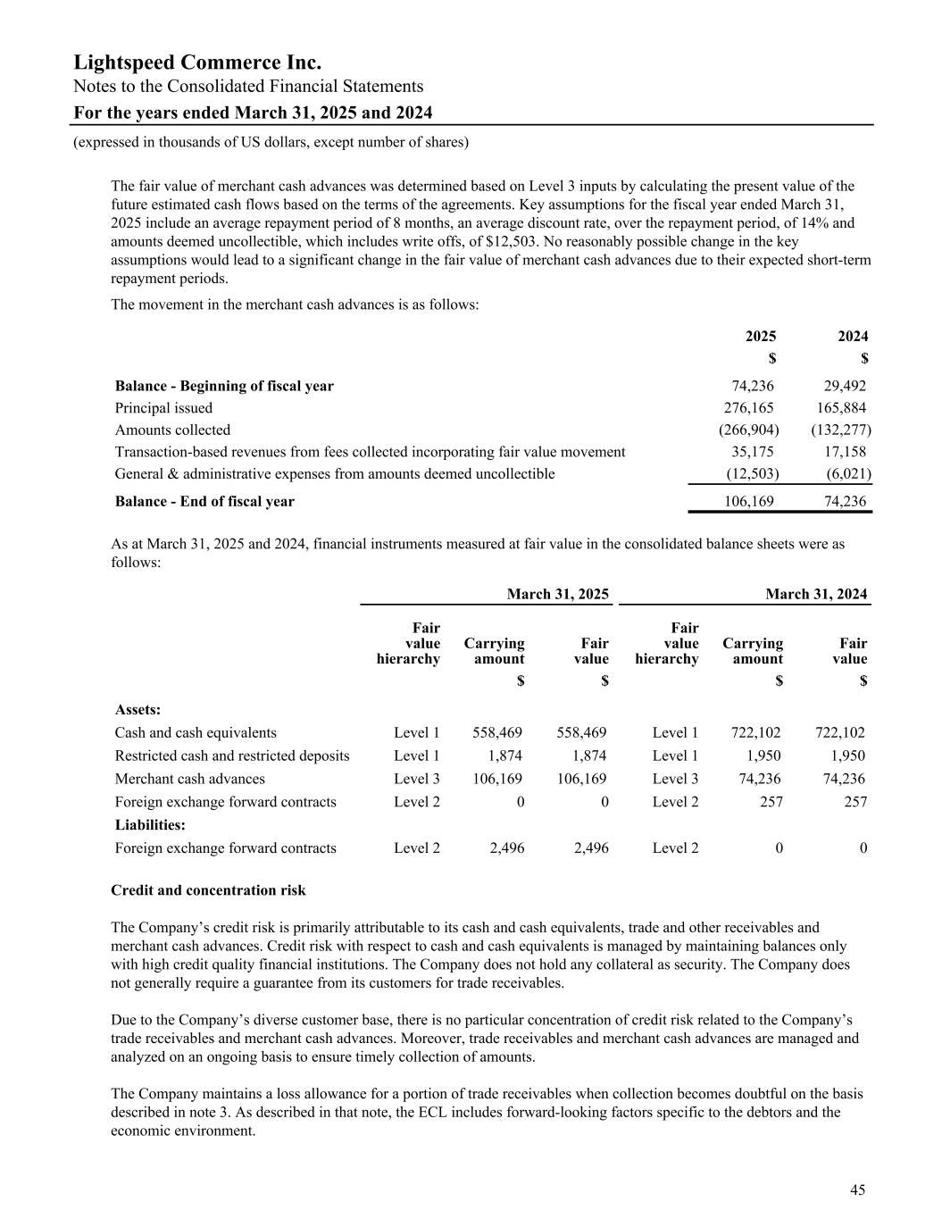 The fair value of merchant cash advances was determined based on Level 3 inputs by calculating the present value of the future estimated cash flows based on the terms of the agreements. Key assumptions for the fiscal year ended March 31, 2025 include an average repayment period of 8 months, an average discount rate, over the repayment period, of 14% and amounts deemed uncollectible, which includes write offs, of $12,503. No reasonably possible change in the key assumptions would lead to a significant change in the fair value of merchant cash advances due to their expected short-term repayment periods. The movement in the merchant cash advances is as follows: 2025 2024 $ $ Balance - Beginning of fiscal year 74,236 29,492 Principal issued 276,165 165,884 Amounts collected (266,904) (132,277) Transaction-based revenues from fees collected incorporating fair value movement 35,175 17,158 General & administrative expenses from amounts deemed uncollectible (12,503) (6,021) Balance - End of fiscal year 106,169 74,236 As at March 31, 2025 and 2024, financial instruments measured at fair value in the consolidated balance sheets were as follows: March 31, 2025 March 31, 2024 Fair value hierarchy Carrying amount Fair value Fair value hierarchy Carrying amount Fair value $ $ $ $ Assets: Cash and cash equivalents Level 1 558,469 558,469 Level 1 722,102 722,102 Restricted cash and restricted deposits Level 1 1,874 1,874 Level 1 1,950 1,950 Merchant cash advances Level 3 106,169 106,169 Level 3 74,236 74,236 Foreign exchange forward contracts Level 2 0 0 Level 2 257 257 Liabilities: Foreign exchange forward contracts Level 2 2,496 2,496 Level 2 0 0 Credit and concentration risk The Company’s credit risk is primarily attributable to its cash and cash equivalents, trade and other receivables and merchant cash advances. Credit risk with respect to cash and cash equivalents is managed by maintaining balances only with high credit quality financial institutions. The Company does not hold any collateral as security. The Company does not generally require a guarantee from its customers for trade receivables. Due to the Company’s diverse customer base, there is no particular concentration of credit risk related to the Company’s trade receivables and merchant cash advances. Moreover, trade receivables and merchant cash advances are managed and analyzed on an ongoing basis to ensure timely collection of amounts. The Company maintains a loss allowance for a portion of trade receivables when collection becomes doubtful on the basis described in note 3. As described in that note, the ECL includes forward-looking factors specific to the debtors and the economic environment. Lightspeed Commerce Inc. Notes to the Consolidated Financial Statements For the years ended March 31, 2025 and 2024 (expressed in thousands of US dollars, except number of shares) 45