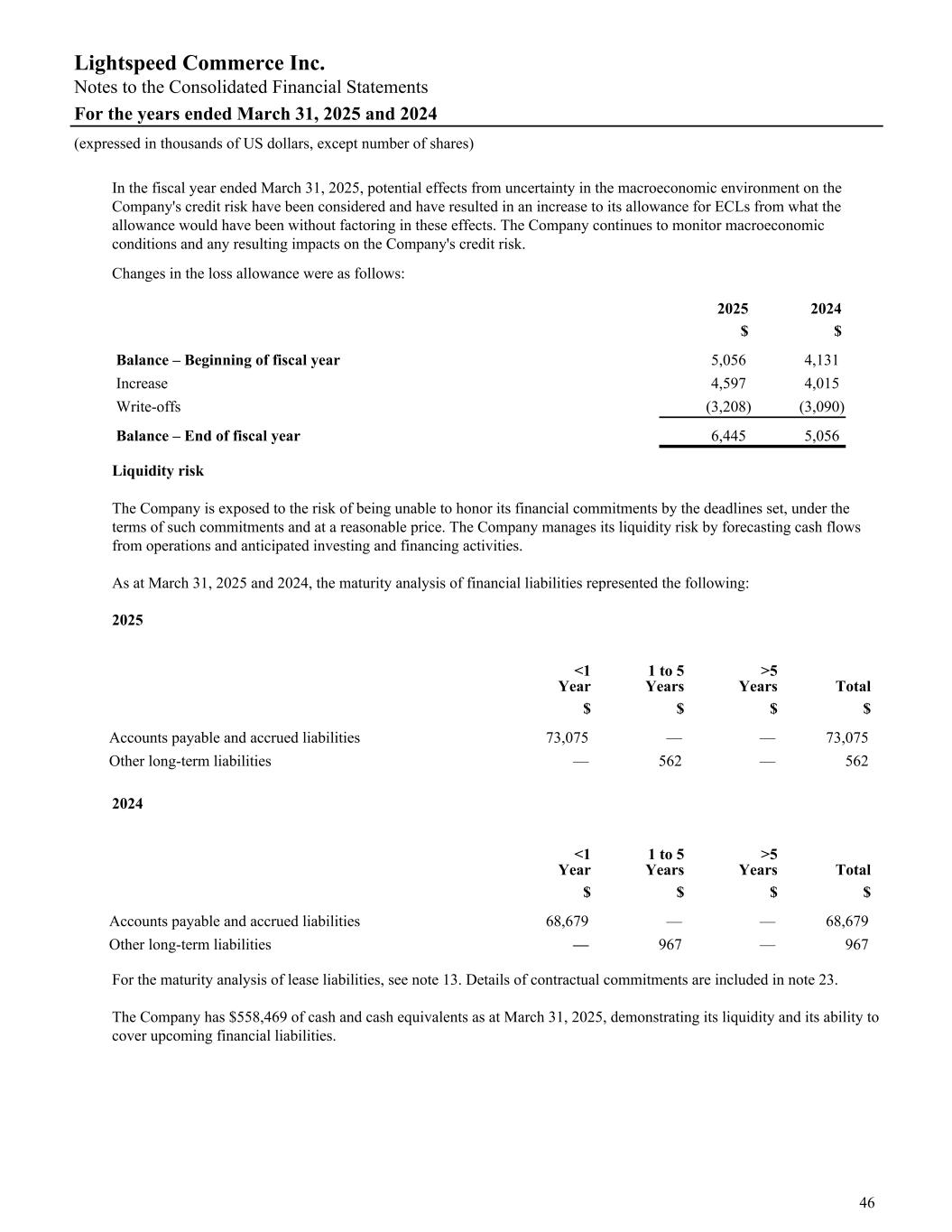 In the fiscal year ended March 31, 2025, potential effects from uncertainty in the macroeconomic environment on the Company's credit risk have been considered and have resulted in an increase to its allowance for ECLs from what the allowance would have been without factoring in these effects. The Company continues to monitor macroeconomic conditions and any resulting impacts on the Company's credit risk. Changes in the loss allowance were as follows: 2025 2024 $ $ Balance – Beginning of fiscal year 5,056 4,131 Increase 4,597 4,015 Write-offs (3,208) (3,090) Balance – End of fiscal year 6,445 5,056 Liquidity risk The Company is exposed to the risk of being unable to honor its financial commitments by the deadlines set, under the terms of such commitments and at a reasonable price. The Company manages its liquidity risk by forecasting cash flows from operations and anticipated investing and financing activities. As at March 31, 2025 and 2024, the maturity analysis of financial liabilities represented the following: 2025 <1 Year 1 to 5 Years >5 Years Total $ $ $ $ Accounts payable and accrued liabilities 73,075 — — 73,075 Other long-term liabilities — 562 — 562 2024 <1 Year 1 to 5 Years >5 Years Total $ $ $ $ Accounts payable and accrued liabilities 68,679 — — 68,679 Other long-term liabilities — 967 — 967 For the maturity analysis of lease liabilities, see note 13. Details of contractual commitments are included in note 23. The Company has $558,469 of cash and cash equivalents as at March 31, 2025, demonstrating its liquidity and its ability to cover upcoming financial liabilities. Lightspeed Commerce Inc. Notes to the Consolidated Financial Statements For the years ended March 31, 2025 and 2024 (expressed in thousands of US dollars, except number of shares) 46