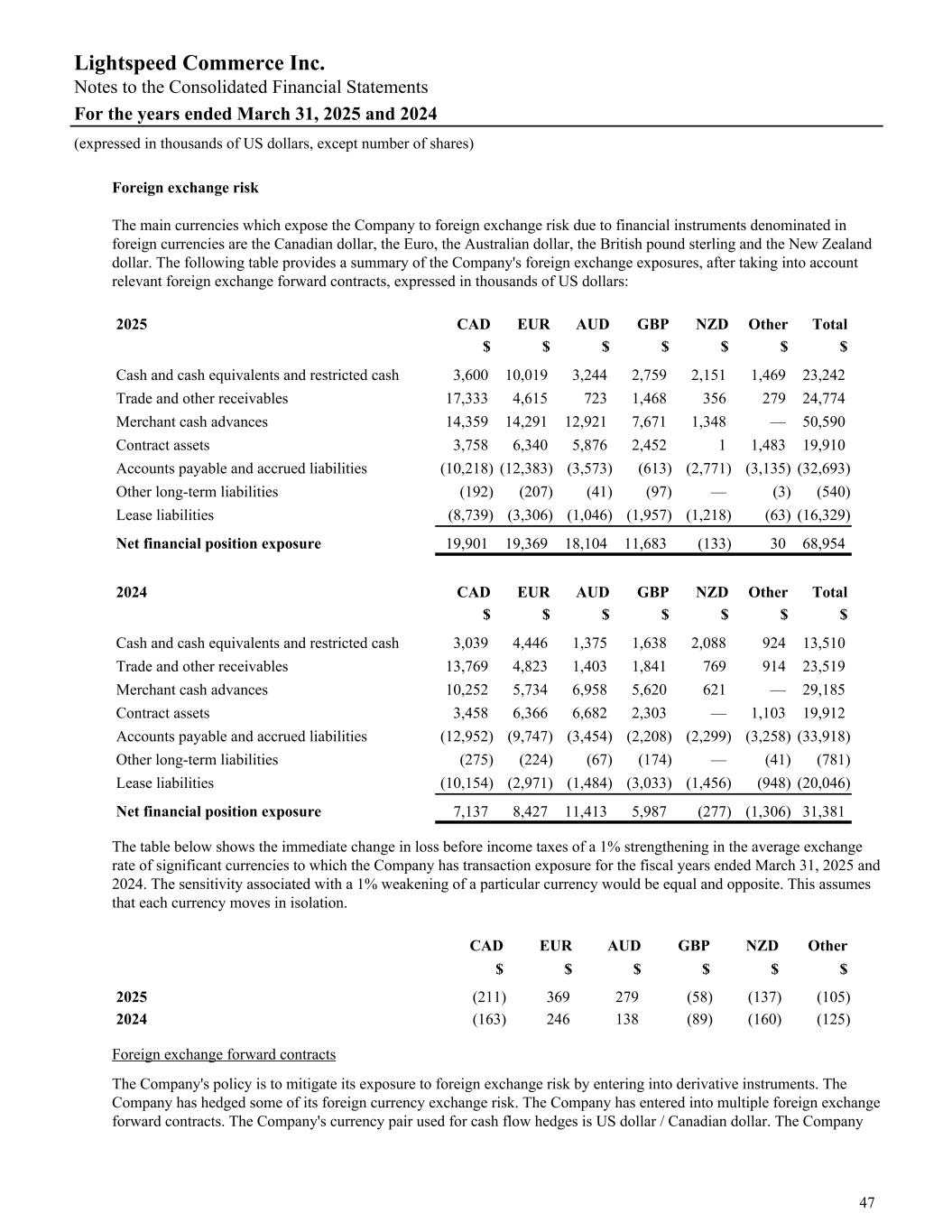 Foreign exchange risk The main currencies which expose the Company to foreign exchange risk due to financial instruments denominated in foreign currencies are the Canadian dollar, the Euro, the Australian dollar, the British pound sterling and the New Zealand dollar. The following table provides a summary of the Company's foreign exchange exposures, after taking into account relevant foreign exchange forward contracts, expressed in thousands of US dollars: 2025 CAD EUR AUD GBP NZD Other Total $ $ $ $ $ $ $ Cash and cash equivalents and restricted cash 3,600 10,019 3,244 2,759 2,151 1,469 23,242 Trade and other receivables 17,333 4,615 723 1,468 356 279 24,774 Merchant cash advances 14,359 14,291 12,921 7,671 1,348 — 50,590 Contract assets 3,758 6,340 5,876 2,452 1 1,483 19,910 Accounts payable and accrued liabilities (10,218) (12,383) (3,573) (613) (2,771) (3,135) (32,693) Other long-term liabilities (192) (207) (41) (97) — (3) (540) Lease liabilities (8,739) (3,306) (1,046) (1,957) (1,218) (63) (16,329) Net financial position exposure 19,901 19,369 18,104 11,683 (133) 30 68,954 2024 CAD EUR AUD GBP NZD Other Total $ $ $ $ $ $ $ Cash and cash equivalents and restricted cash 3,039 4,446 1,375 1,638 2,088 924 13,510 Trade and other receivables 13,769 4,823 1,403 1,841 769 914 23,519 Merchant cash advances 10,252 5,734 6,958 5,620 621 — 29,185 Contract assets 3,458 6,366 6,682 2,303 — 1,103 19,912 Accounts payable and accrued liabilities (12,952) (9,747) (3,454) (2,208) (2,299) (3,258) (33,918) Other long-term liabilities (275) (224) (67) (174) — (41) (781) Lease liabilities (10,154) (2,971) (1,484) (3,033) (1,456) (948) (20,046) Net financial position exposure 7,137 8,427 11,413 5,987 (277) (1,306) 31,381 The table below shows the immediate change in loss before income taxes of a 1% strengthening in the average exchange rate of significant currencies to which the Company has transaction exposure for the fiscal years ended March 31, 2025 and 2024. The sensitivity associated with a 1% weakening of a particular currency would be equal and opposite. This assumes that each currency moves in isolation. CAD EUR AUD GBP NZD Other $ $ $ $ $ $ 2025 (211) 369 279 (58) (137) (105) 2024 (163) 246 138 (89) (160) (125) Foreign exchange forward contracts The Company's policy is to mitigate its exposure to foreign exchange risk by entering into derivative instruments. The Company has hedged some of its foreign currency exchange risk. The Company has entered into multiple foreign exchange forward contracts. The Company's currency pair used for cash flow hedges is US dollar / Canadian dollar. The Company Lightspeed Commerce Inc. Notes to the Consolidated Financial Statements For the years ended March 31, 2025 and 2024 (expressed in thousands of US dollars, except number of shares) 47