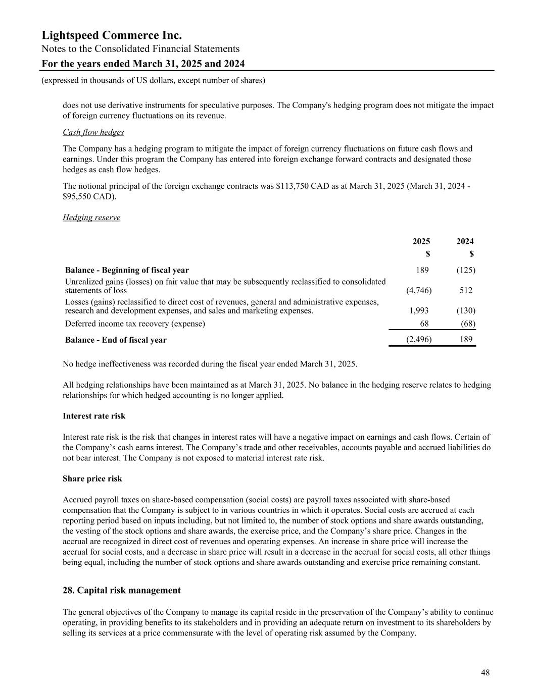 does not use derivative instruments for speculative purposes. The Company's hedging program does not mitigate the impact of foreign currency fluctuations on its revenue. Cash flow hedges The Company has a hedging program to mitigate the impact of foreign currency fluctuations on future cash flows and earnings. Under this program the Company has entered into foreign exchange forward contracts and designated those hedges as cash flow hedges. The notional principal of the foreign exchange contracts was $113,750 CAD as at March 31, 2025 (March 31, 2024 - $95,550 CAD). Hedging reserve 2025 2024 $ $ Balance - Beginning of fiscal year 189 (125) Unrealized gains (losses) on fair value that may be subsequently reclassified to consolidated statements of loss (4,746) 512 Losses (gains) reclassified to direct cost of revenues, general and administrative expenses, research and development expenses, and sales and marketing expenses. 1,993 (130) Deferred income tax recovery (expense) 68 (68) Balance - End of fiscal year (2,496) 189 No hedge ineffectiveness was recorded during the fiscal year ended March 31, 2025. All hedging relationships have been maintained as at March 31, 2025. No balance in the hedging reserve relates to hedging relationships for which hedged accounting is no longer applied. Interest rate risk Interest rate risk is the risk that changes in interest rates will have a negative impact on earnings and cash flows. Certain of the Company’s cash earns interest. The Company’s trade and other receivables, accounts payable and accrued liabilities do not bear interest. The Company is not exposed to material interest rate risk. Share price risk Accrued payroll taxes on share-based compensation (social costs) are payroll taxes associated with share-based compensation that the Company is subject to in various countries in which it operates. Social costs are accrued at each reporting period based on inputs including, but not limited to, the number of stock options and share awards outstanding, the vesting of the stock options and share awards, the exercise price, and the Company’s share price. Changes in the accrual are recognized in direct cost of revenues and operating expenses. An increase in share price will increase the accrual for social costs, and a decrease in share price will result in a decrease in the accrual for social costs, all other things being equal, including the number of stock options and share awards outstanding and exercise price remaining constant. 28. Capital risk management The general objectives of the Company to manage its capital reside in the preservation of the Company’s ability to continue operating, in providing benefits to its stakeholders and in providing an adequate return on investment to its shareholders by selling its services at a price commensurate with the level of operating risk assumed by the Company. Lightspeed Commerce Inc. Notes to the Consolidated Financial Statements For the years ended March 31, 2025 and 2024 (expressed in thousands of US dollars, except number of shares) 48