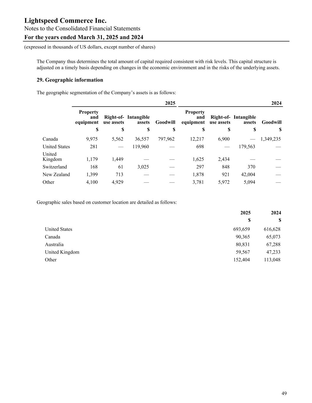 The Company thus determines the total amount of capital required consistent with risk levels. This capital structure is adjusted on a timely basis depending on changes in the economic environment and in the risks of the underlying assets. 29. Geographic information The geographic segmentation of the Company’s assets is as follows: 2025 2024 Property and equipment Right-of- use assets Intangible assets Goodwill Property and equipment Right-of- use assets Intangible assets Goodwill $ $ $ $ $ $ $ $ Canada 9,975 5,562 36,557 797,962 12,217 6,900 — 1,349,235 United States 281 — 119,960 — 698 — 179,563 — United Kingdom 1,179 1,449 — — 1,625 2,434 — — Switzerland 168 61 3,025 — 297 848 370 — New Zealand 1,399 713 — — 1,878 921 42,004 — Other 4,100 4,929 — — 3,781 5,972 5,094 — Geographic sales based on customer location are detailed as follows: 2025 2024 $ $ United States 693,659 616,628 Canada 90,365 65,073 Australia 80,831 67,288 United Kingdom 59,567 47,233 Other 152,404 113,048 Lightspeed Commerce Inc. Notes to the Consolidated Financial Statements For the years ended March 31, 2025 and 2024 (expressed in thousands of US dollars, except number of shares) 49
