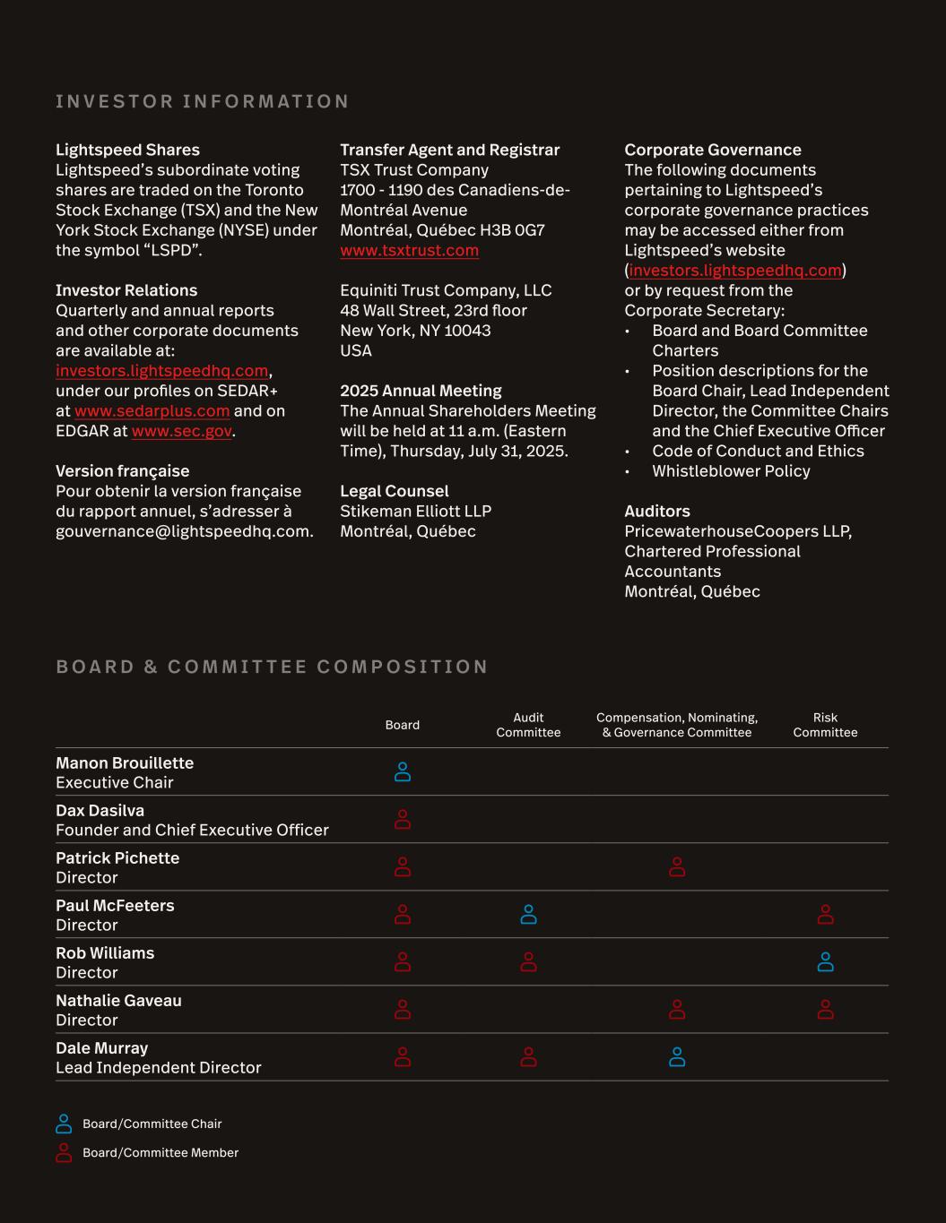 Lightspeed Shares Lightspeed’s subordinate voting shares are traded on the Toronto Stock Exchange (TSX) and the New York Stock Exchange (NYSE) under the symbol “LSPD”. Investor Relations Quarterly and annual reports and other corporate documents are available at: investors.lightspeedhq.com, under our profiles on SEDAR+ at www.sedarplus.com and on EDGAR at www.sec.gov. Version française Pour obtenir la version française du rapport annuel, s’adresser à gouvernance@lightspeedhq.com. Transfer Agent and Registrar TSX Trust Company 1700 - 1190 des Canadiens-de- Montréal Avenue Montréal, Québec H3B 0G7 www.tsxtrust.com Equiniti Trust Company, LLC 48 Wall Street, 23rd floor New York, NY 10043 USA 2025 Annual Meeting The Annual Shareholders Meeting will be held at 11 a.m. (Eastern Time), Thursday, July 31, 2025. Legal Counsel Stikeman Elliott LLP Montréal, Québec Corporate Governance The following documents pertaining to Lightspeed’s corporate governance practices may be accessed either from Lightspeed’s website (investors.lightspeedhq.com) or by request from the Corporate Secretary: • Board and Board Committee Charters • Position descriptions for the Board Chair, Lead Independent Director, the Committee Chairs and the Chief Executive Officer • Code of Conduct and Ethics • Whistleblower Policy Auditors PricewaterhouseCoopers LLP, Chartered Professional Accountants Montréal, Québec I N V E S T O R I N F O R M A T I O N B O A R D & C O M M I T T E E C O M P O S I T I O N Board Audit Committee Compensation, Nominating, & Governance Committee Risk Committee Manon Brouillette Executive Chair Dax Dasilva Founder and Chief Executive Officer Patrick Pichette Director Paul McFeeters Director Rob Williams Director Nathalie Gaveau Director Dale Murray Lead Independent Director Board/Committee Chair Board/Committee Member