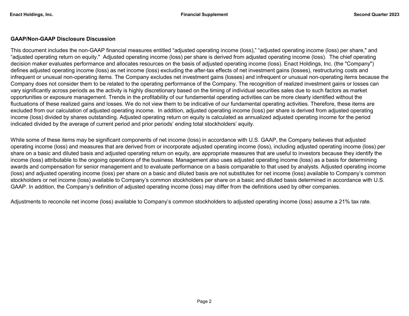 Enact Holdings, Inc. Financial Supplement Second Quarter 2023 GAAP/Non-GAAP Disclosure Discussion This document includes the non-GAAP financial measures entitled “adjusted operating income (loss),” “adjusted operating income (loss) per share," and “adjusted operating return on equity." Adjusted operating income (loss) per share is derived from adjusted operating income (loss). The chief operating decision maker evaluates performance and allocates resources on the basis of adjusted operating income (loss). Enact Holdings, Inc. (the "Company") defines adjusted operating income (loss) as net income (loss) excluding the after-tax effects of net investment gains (losses), restructuring costs and infrequent or unusual non-operating items. The Company excludes net investment gains (losses) and infrequent or unusual non-operating items because the Company does not consider them to be related to the operating performance of the Company. The recognition of realized investment gains or losses can vary significantly across periods as the activity is highly discretionary based on the timing of individual securities sales due to such factors as market opportunities or exposure management. Trends in the profitability of our fundamental operating activities can be more clearly identified without the fluctuations of these realized gains and losses. We do not view them to be indicative of our fundamental operating activities. Therefore, these items are excluded from our calculation of adjusted operating income. In addition, adjusted operating income (loss) per share is derived from adjusted operating income (loss) divided by shares outstanding. Adjusted operating return on equity is calculated as annualized adjusted operating income for the period indicated divided by the average of current period and prior periods’ ending total stockholders’ equity. While some of these items may be significant components of net income (loss) in accordance with U.S. GAAP, the Company believes that adjusted operating income (loss) and measures that are derived from or incorporate adjusted operating income (loss), including adjusted operating income (loss) per share on a basic and diluted basis and adjusted operating return on equity, are appropriate measures that are useful to investors because they identify the income (loss) attributable to the ongoing operations of the business. Management also uses adjusted operating income (loss) as a basis for determining awards and compensation for senior management and to evaluate performance on a basis comparable to that used by analysts. Adjusted operating income (loss) and adjusted operating income (loss) per share on a basic and diluted basis are not substitutes for net income (loss) available to Company’s common stockholders or net income (loss) available to Company’s common stockholders per share on a basic and diluted basis determined in accordance with U.S. GAAP. In addition, the Company’s definition of adjusted operating income (loss) may differ from the definitions used by other companies. Adjustments to reconcile net income (loss) available to Company’s common stockholders to adjusted operating income (loss) assume a 21% tax rate. Page 2